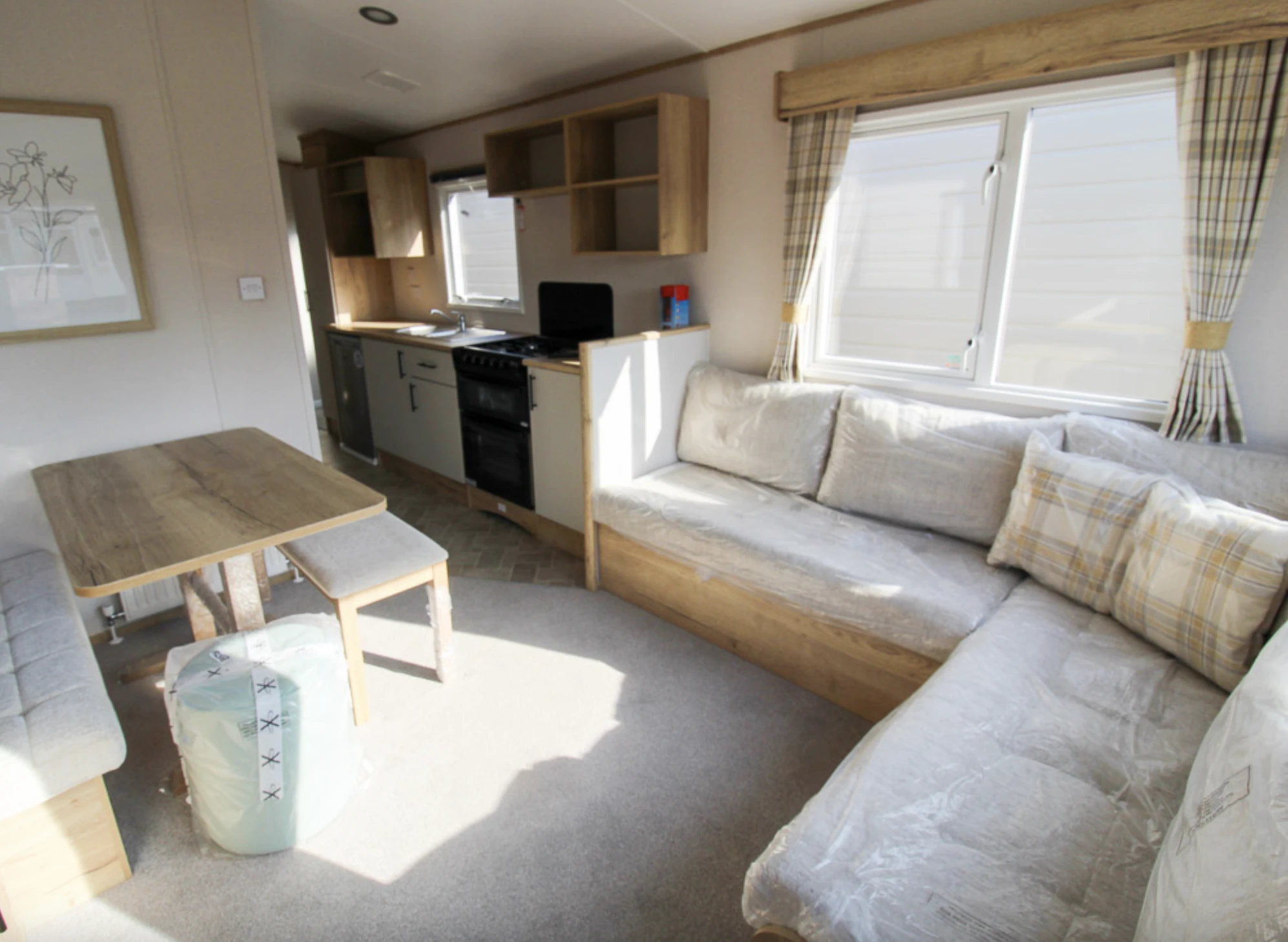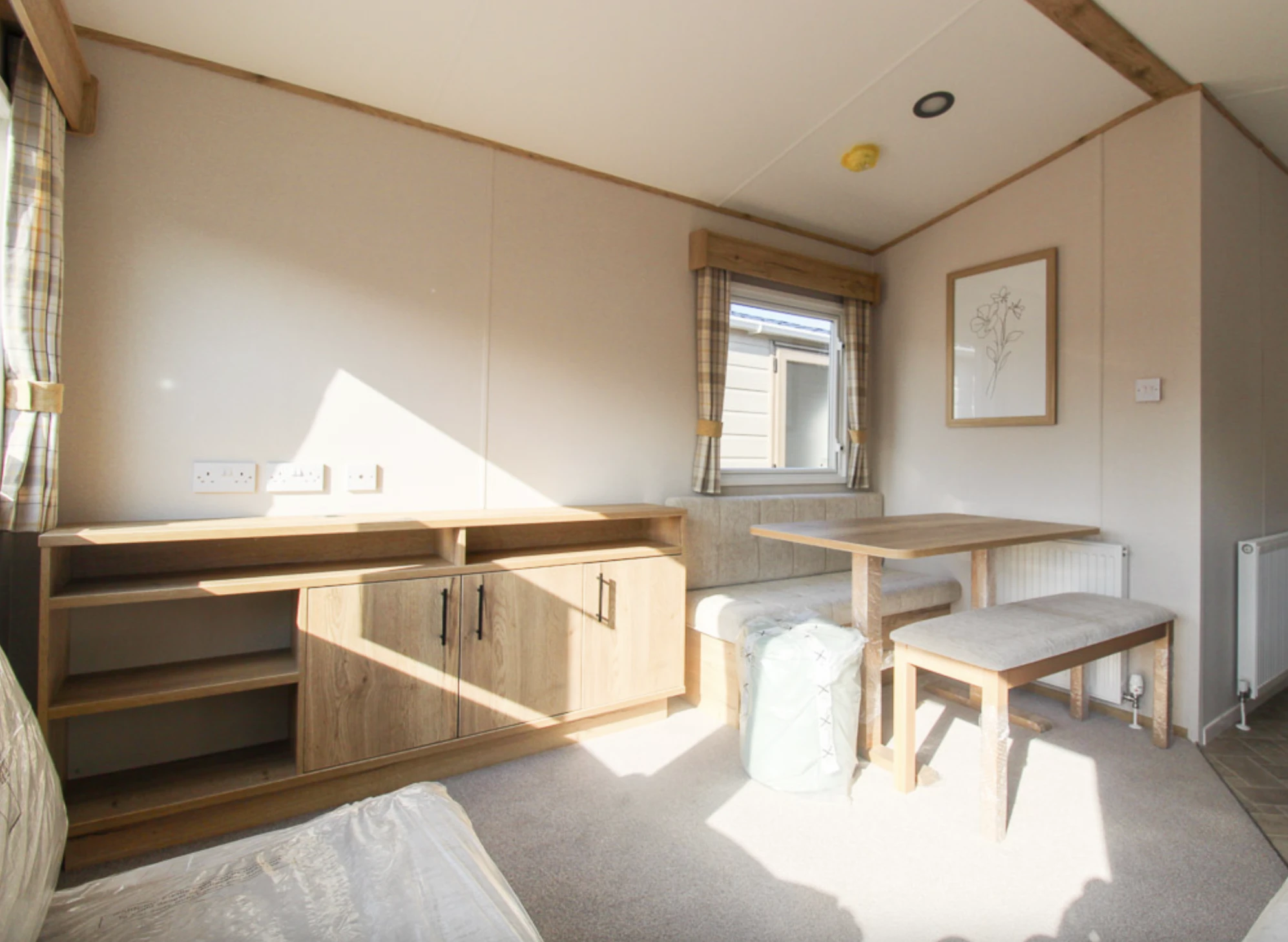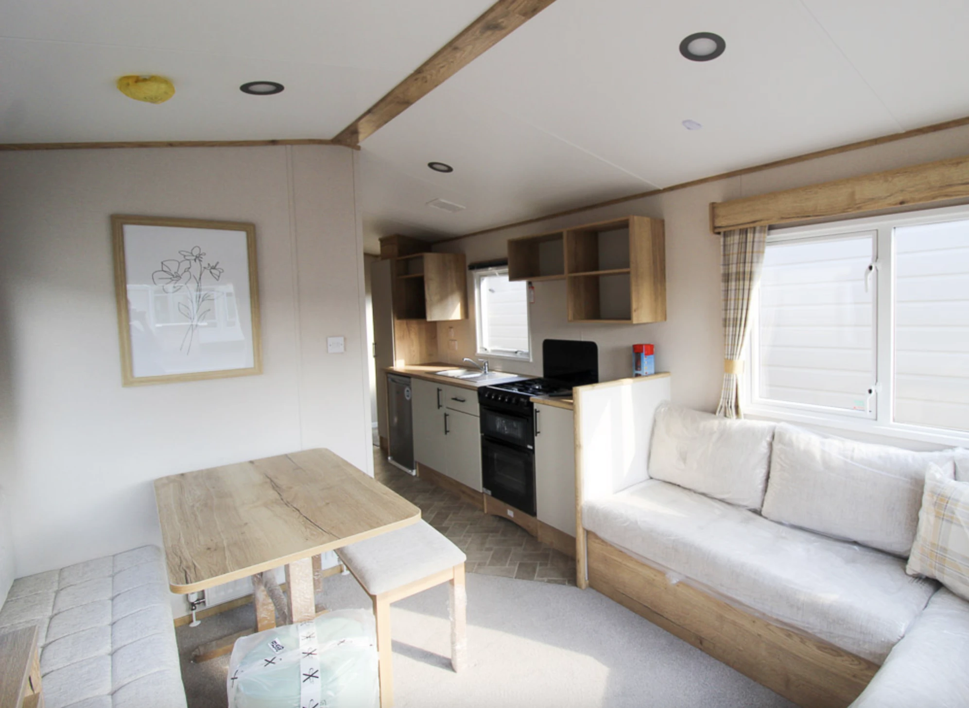 The bright and inviting living area features comfortable seating and large windows that allow natural light to fill the space, creating a warm and welcoming atmosphere. The compact yet practical kitchen includes a gas oven, hob, under-counter fridge, and ample storage for all your cooking essentials. Adjacent to the kitchen is a freestanding dining table with chairs, making it the perfect spot for family meals.