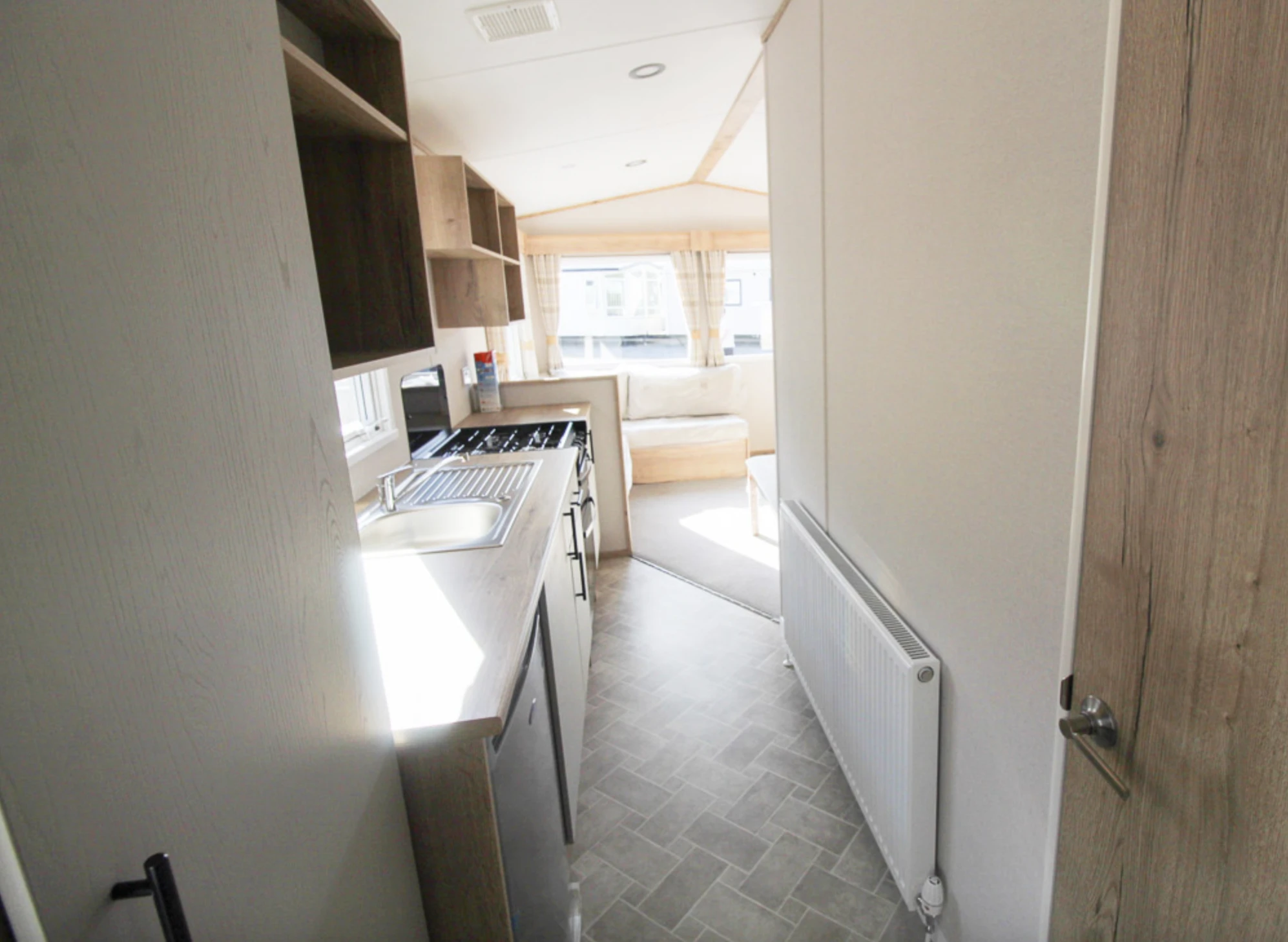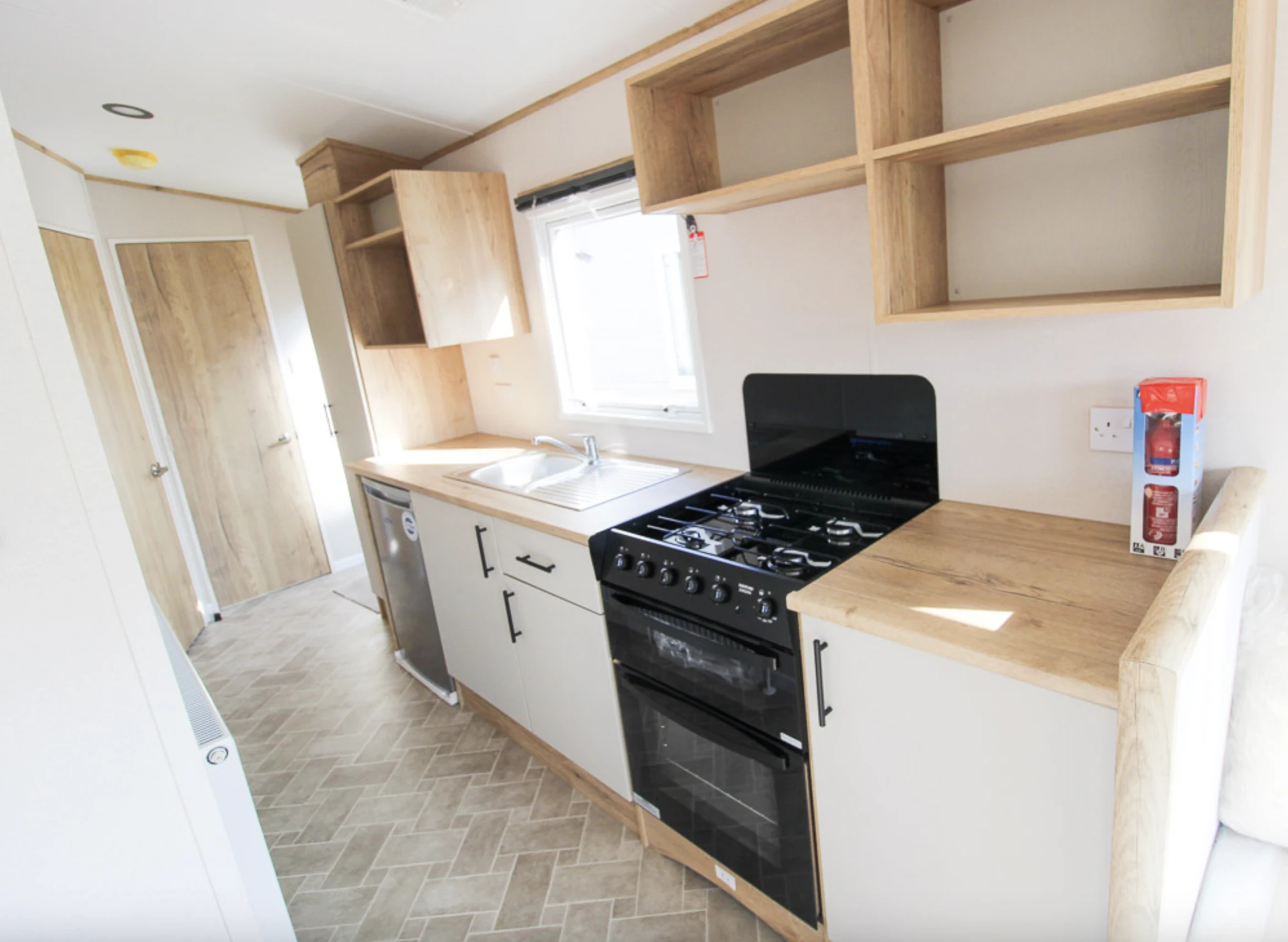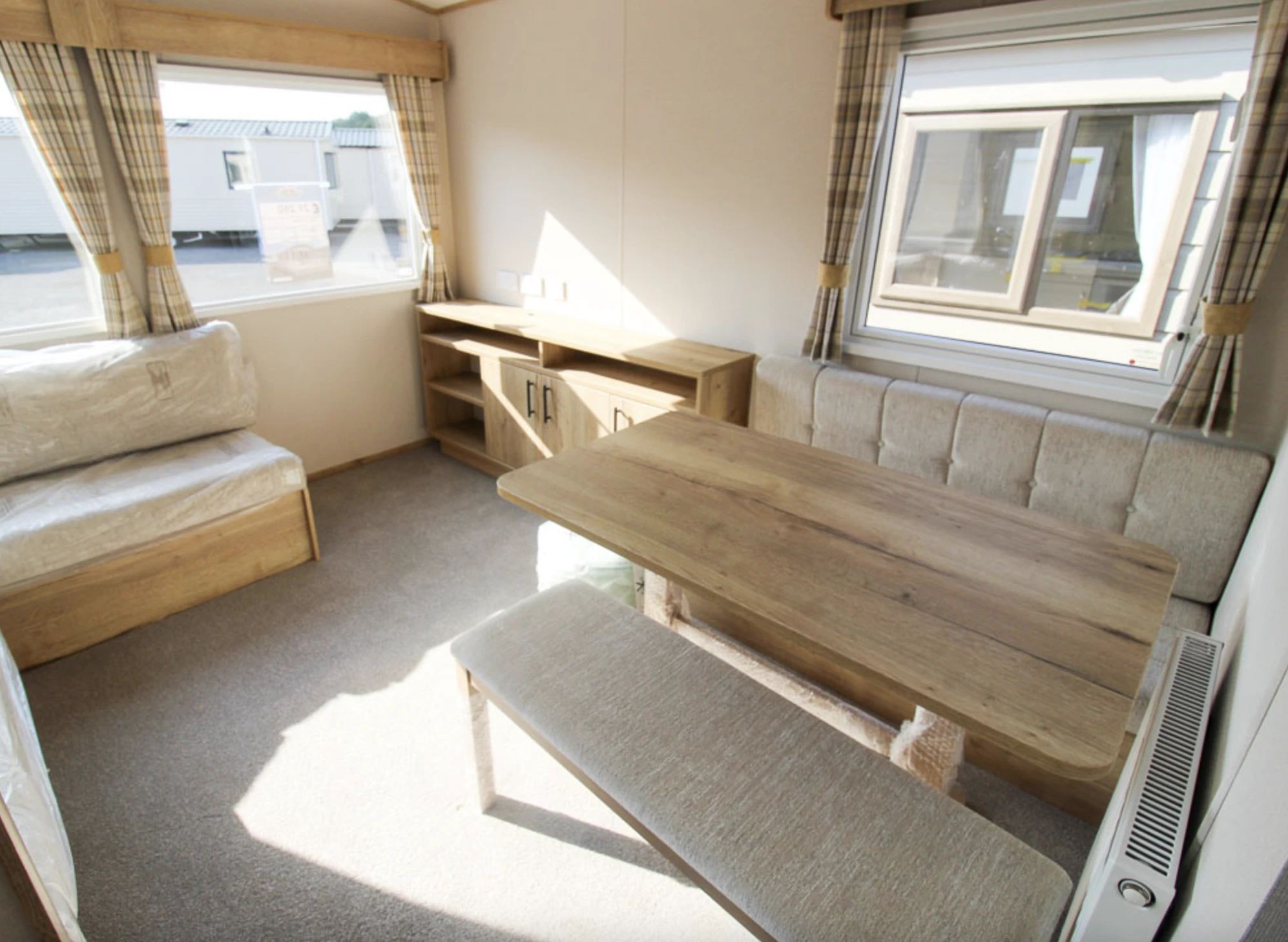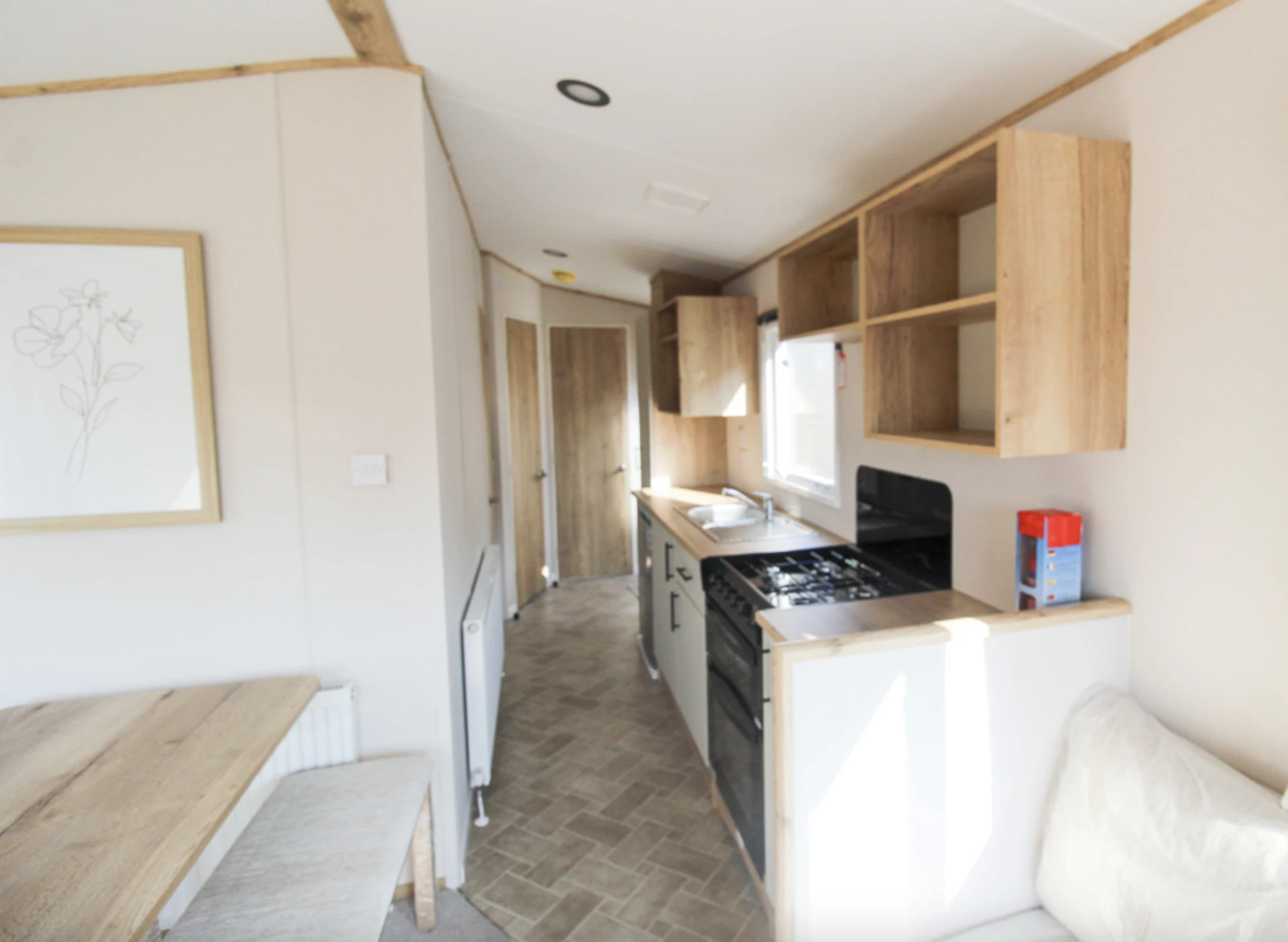 The bright and inviting living area features comfortable seating and large windows that allow natural light to fill the space, creating a warm and welcoming atmosphere. The compact yet practical kitchen includes a gas oven, hob, under-counter fridge, and ample storage for all your cooking essentials. Adjacent to the kitchen is a freestanding dining table with chairs, making it the perfect spot for family meals.