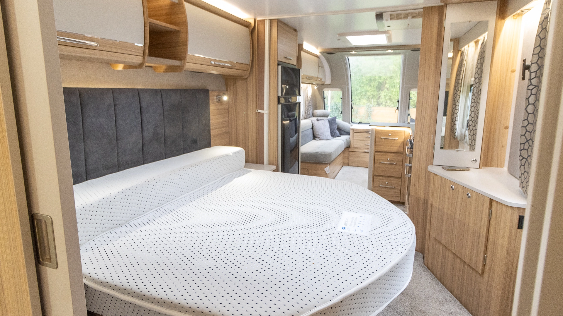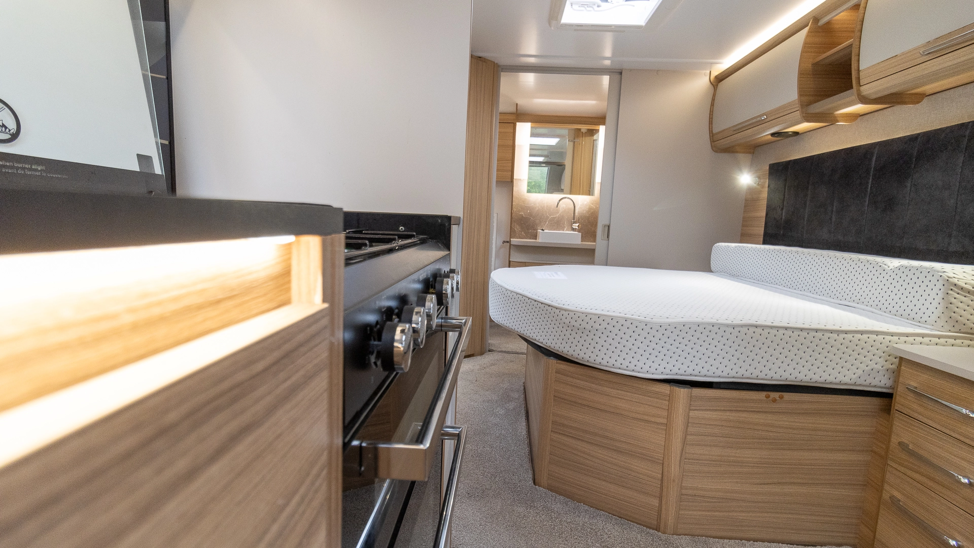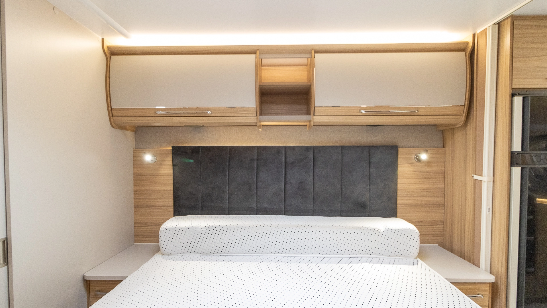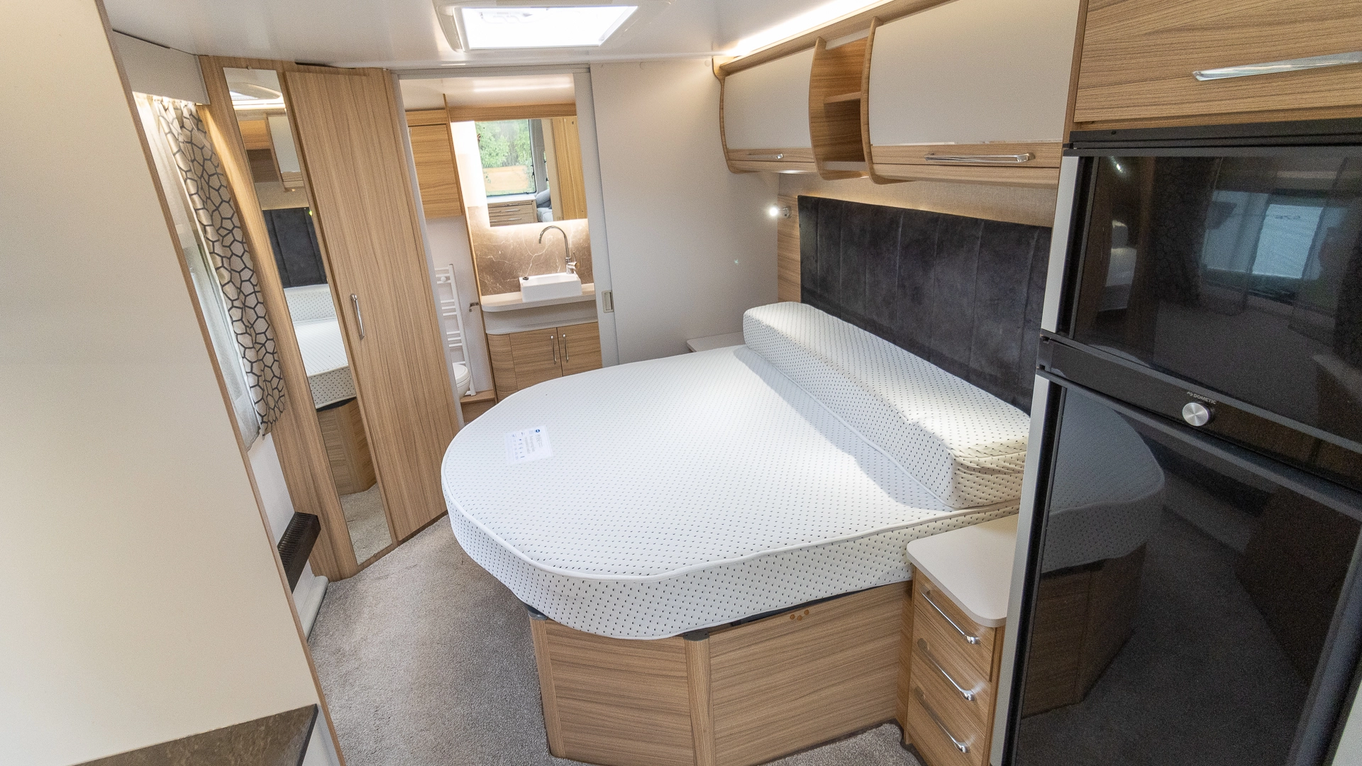 Requiring no nightly bed making, the fixed island bed provides a dedicated sleeping zone with walk‑around access and generous under‑bed storage.