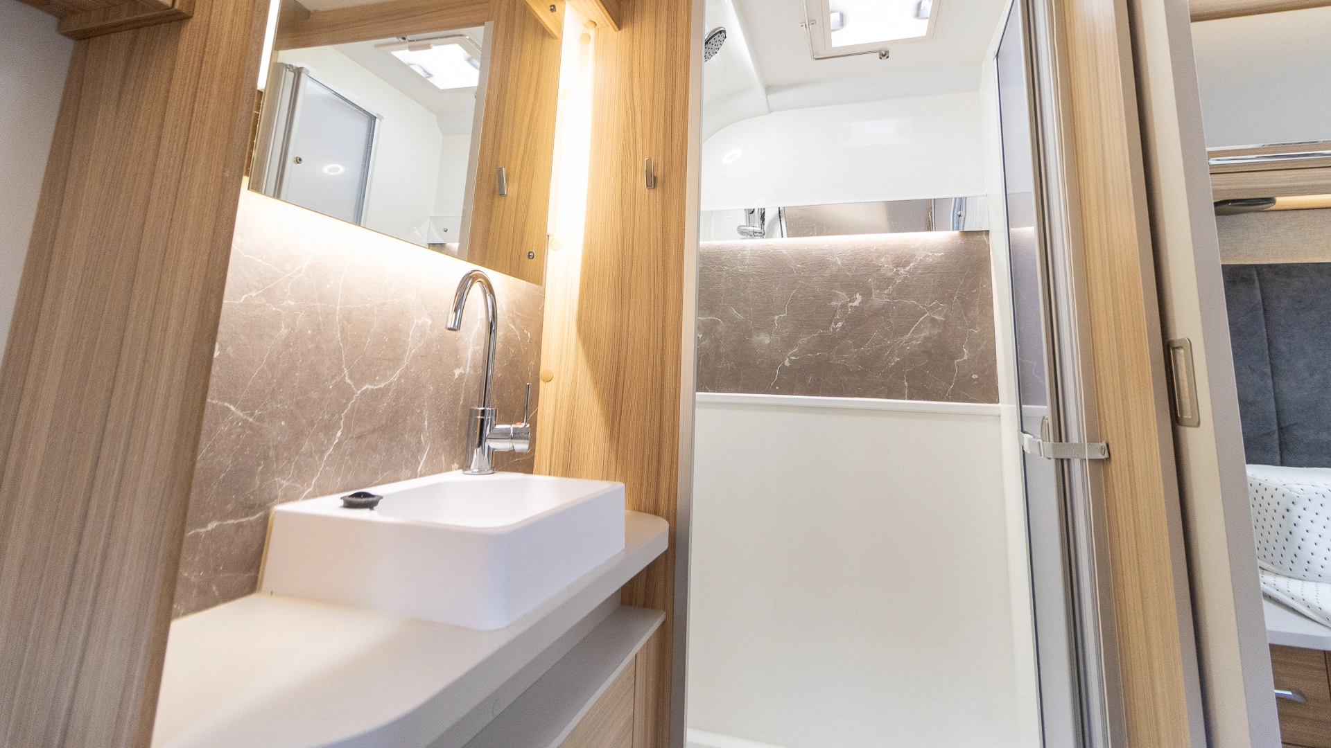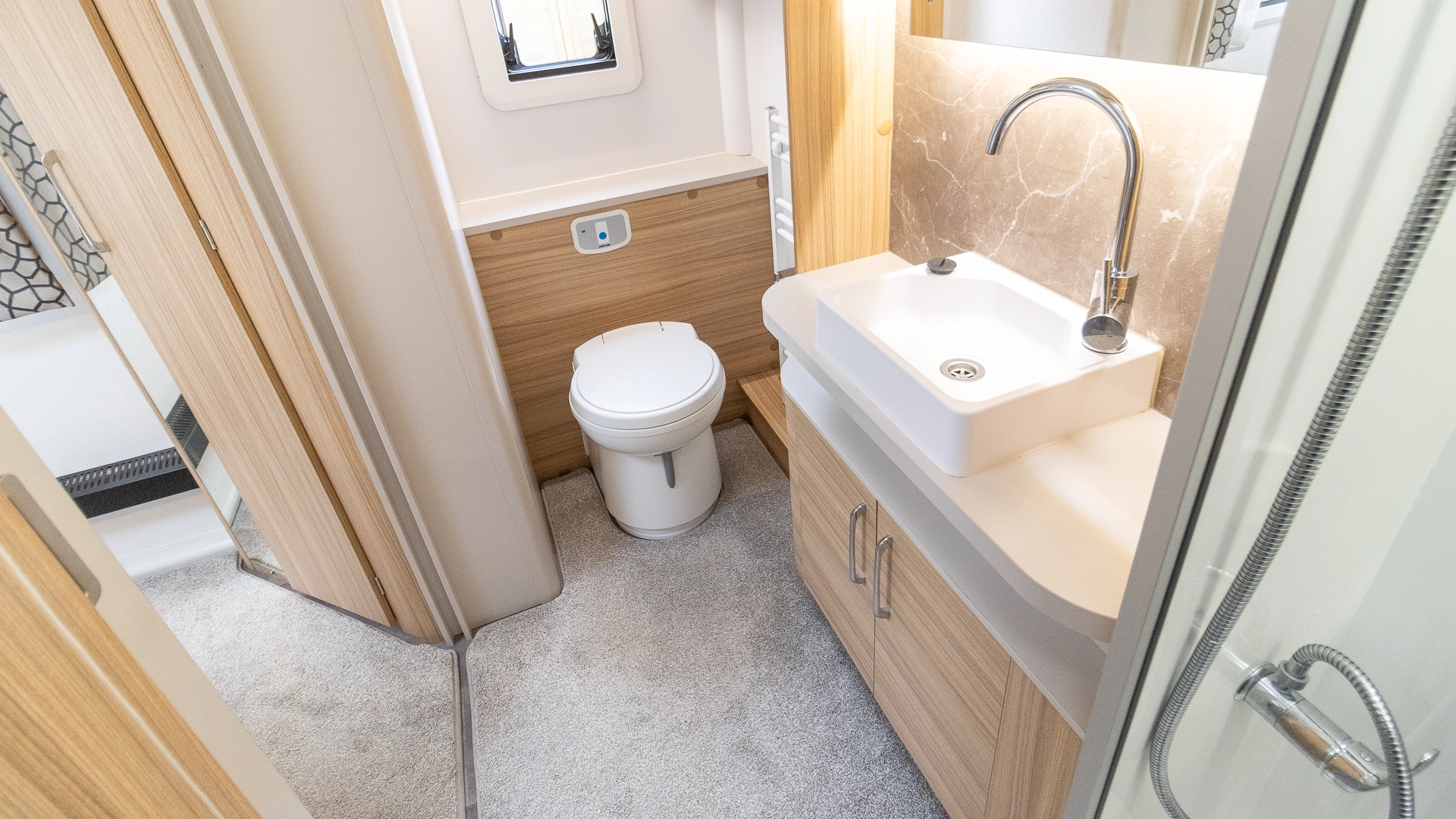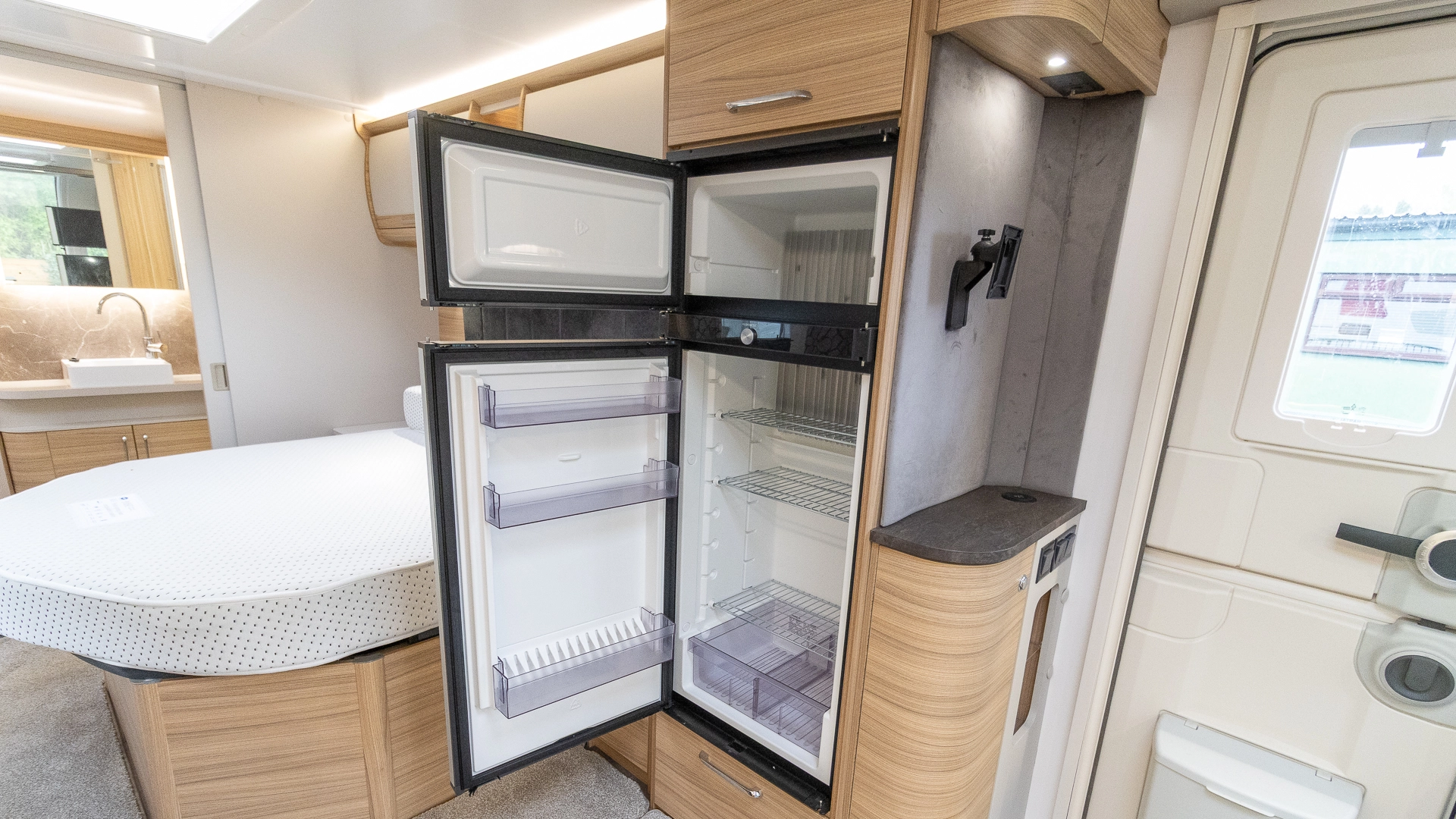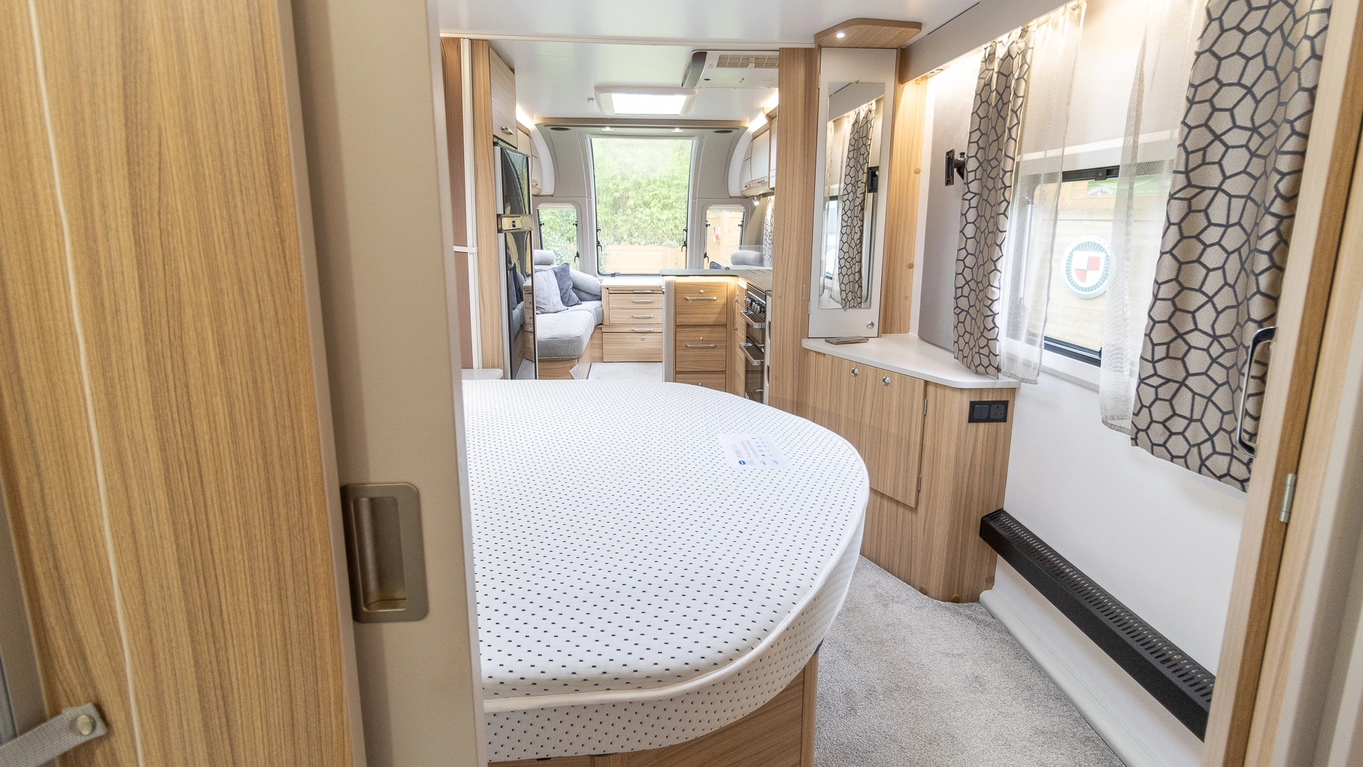Requiring no nightly bed making, the fixed island bed provides a dedicated sleeping zone with walk‑around access and generous under‑bed storage.
