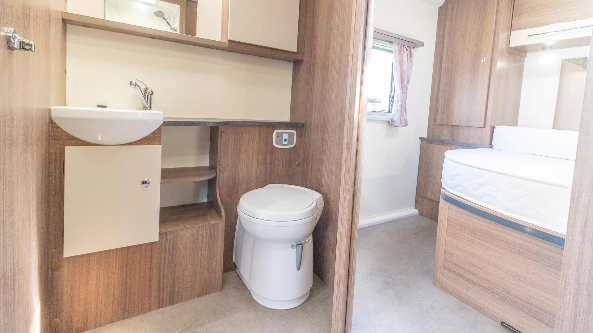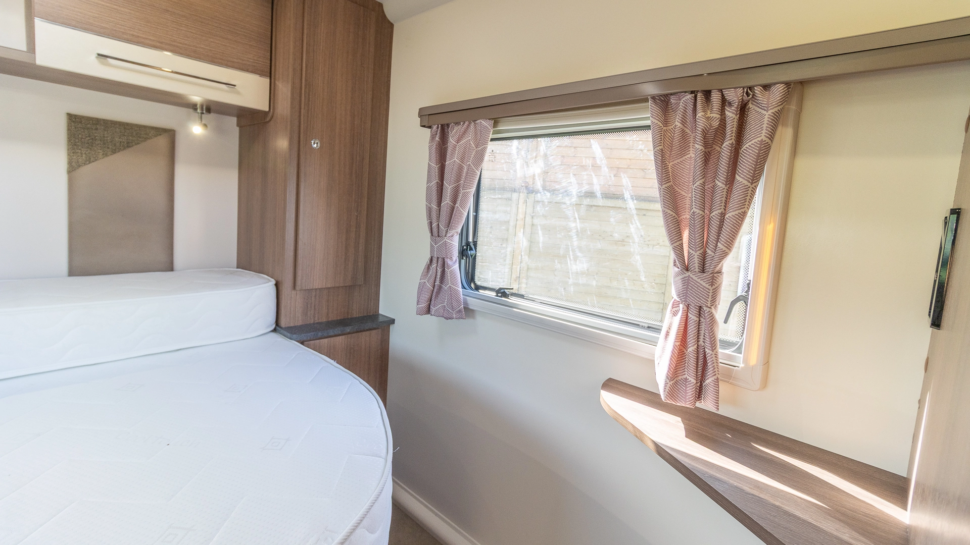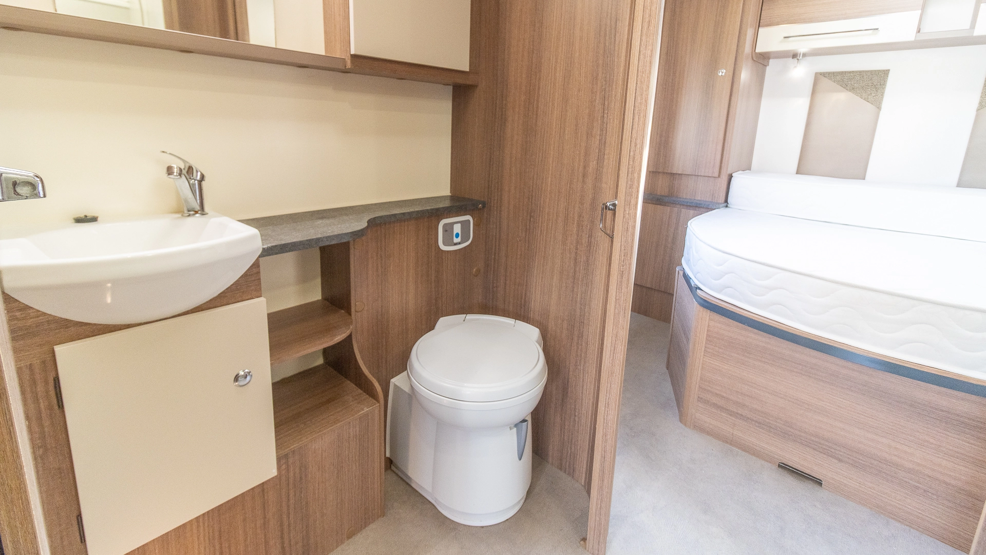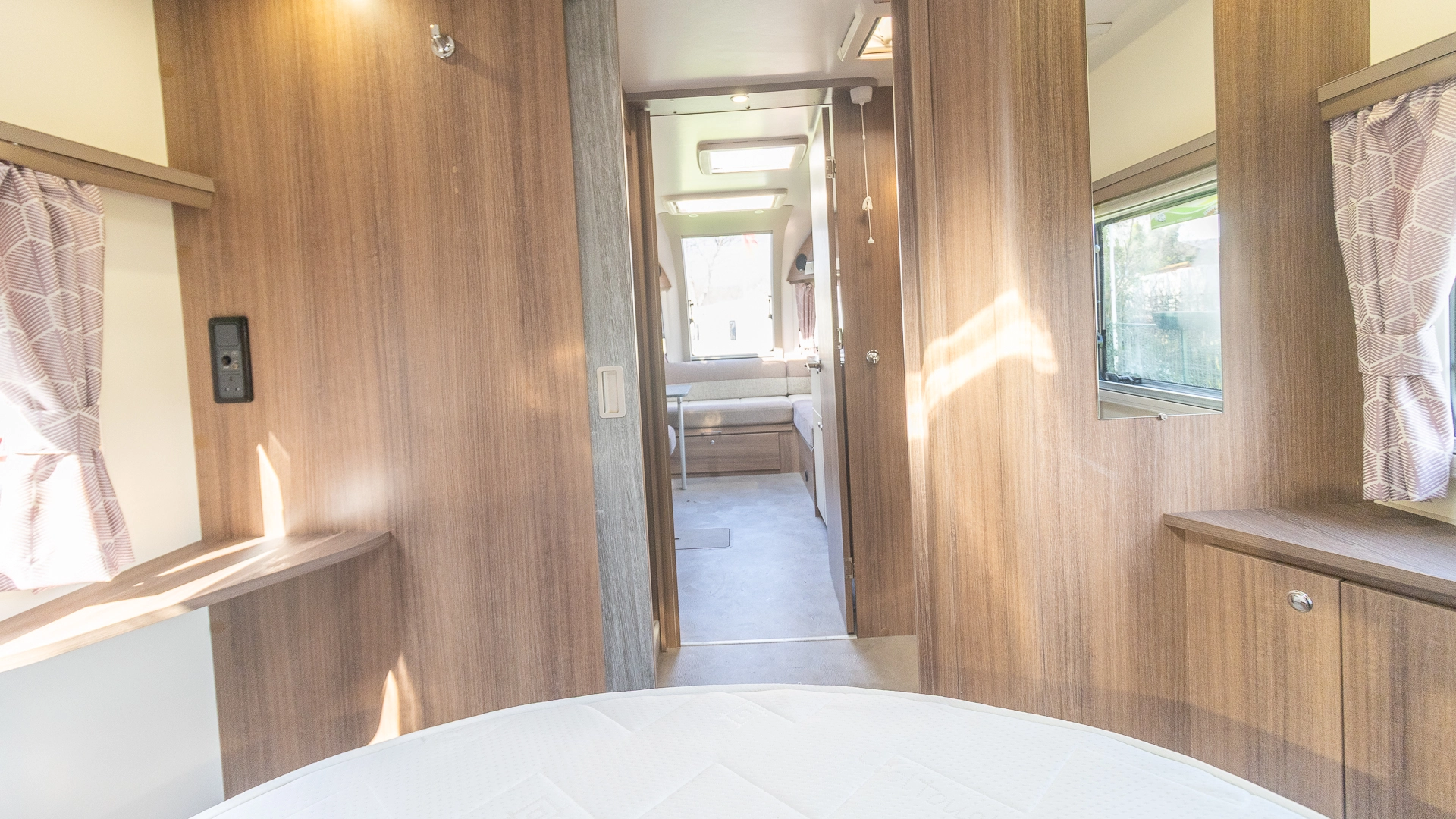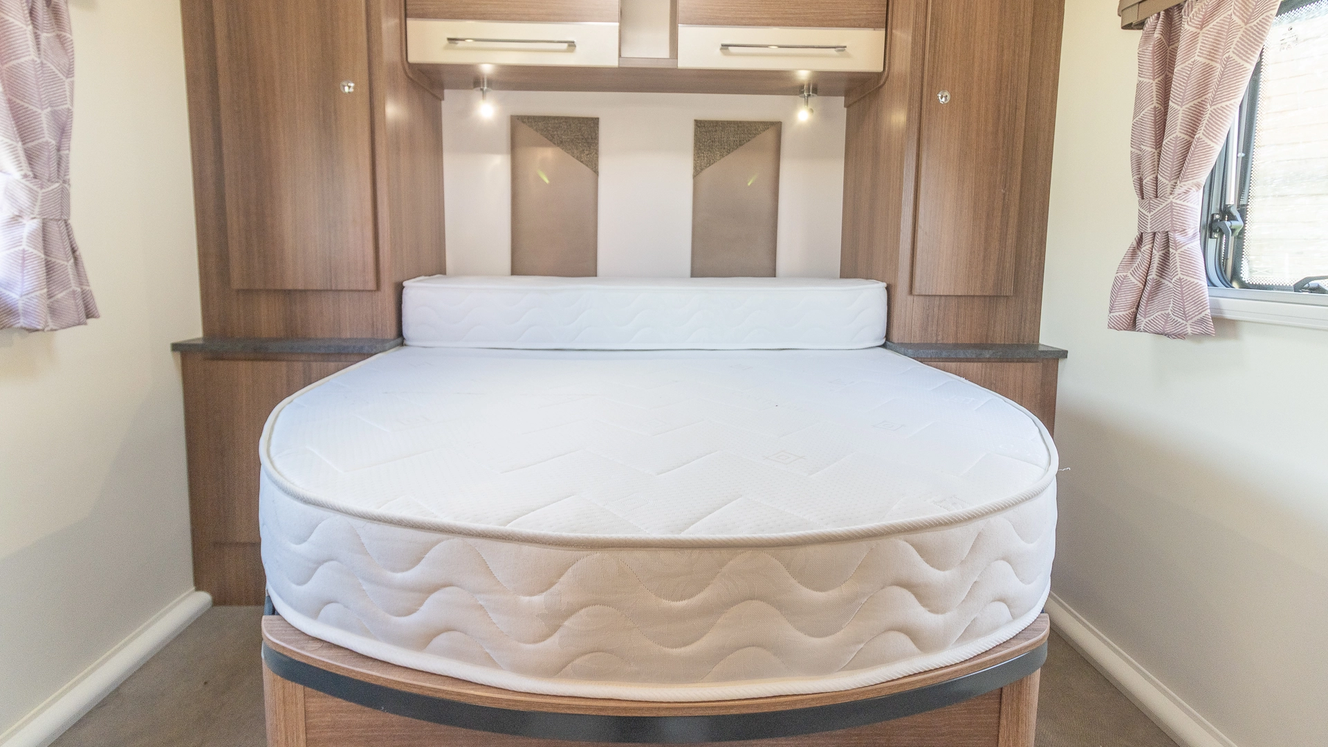 Requiring no nightly bed making, the fixed island bed provides a dedicated sleeping zone with walk‑around access and generous under‑bed storage.