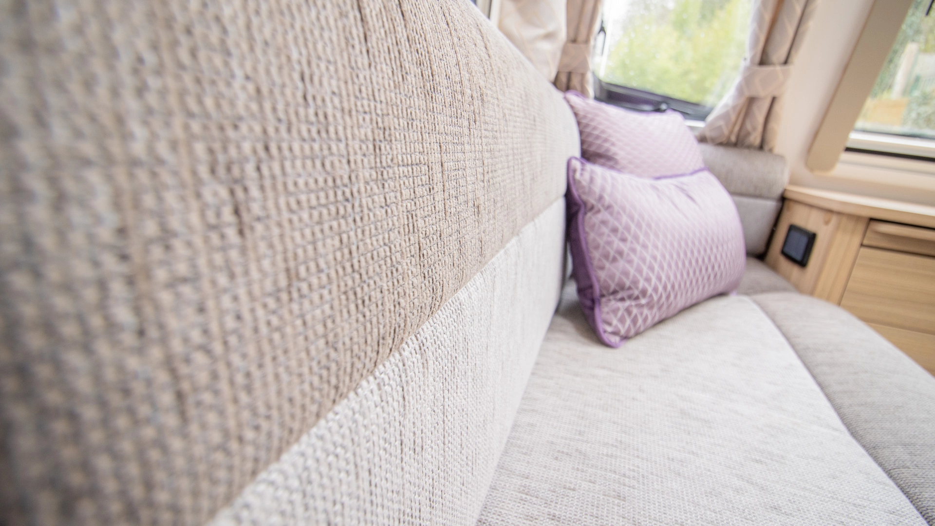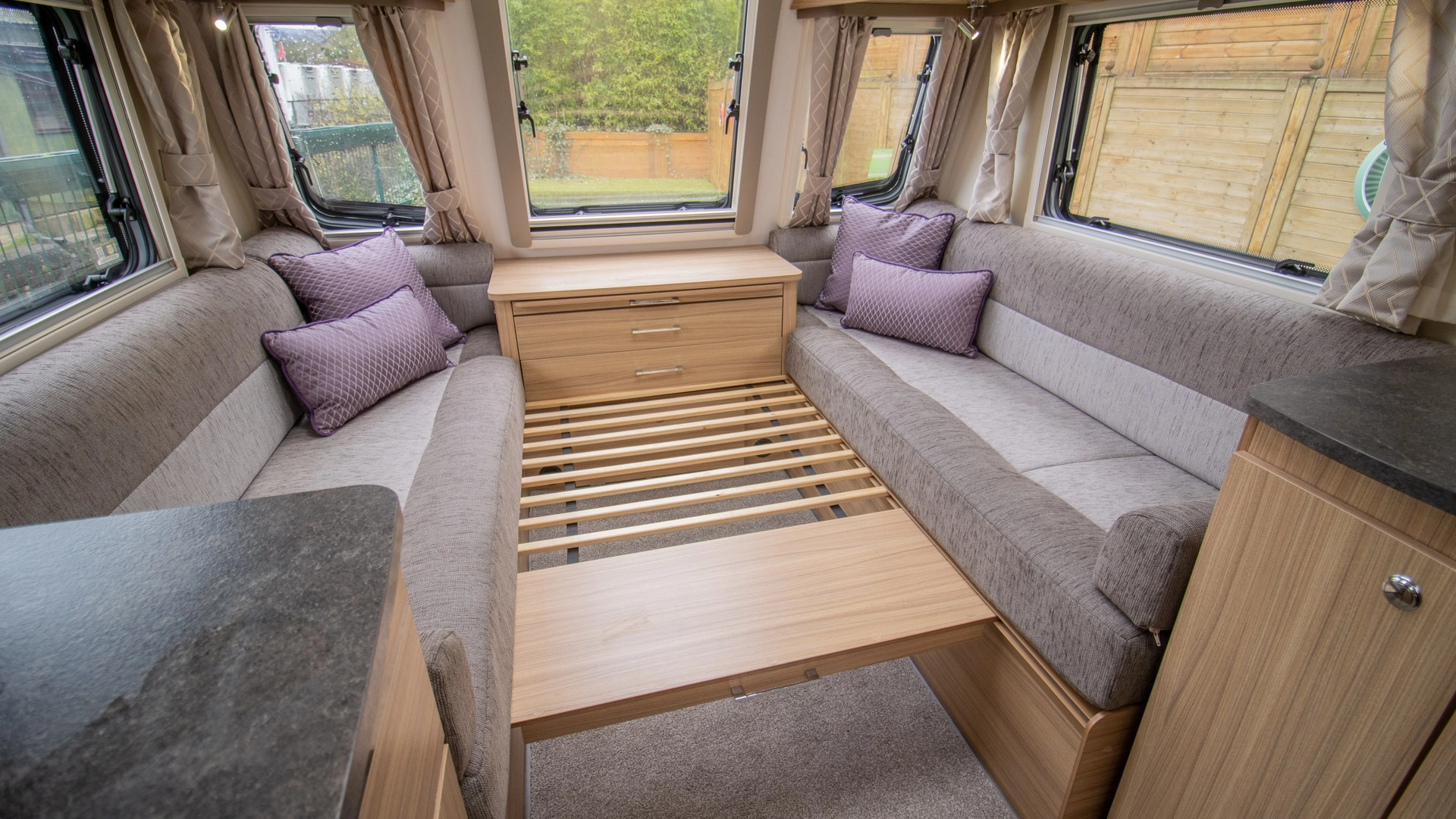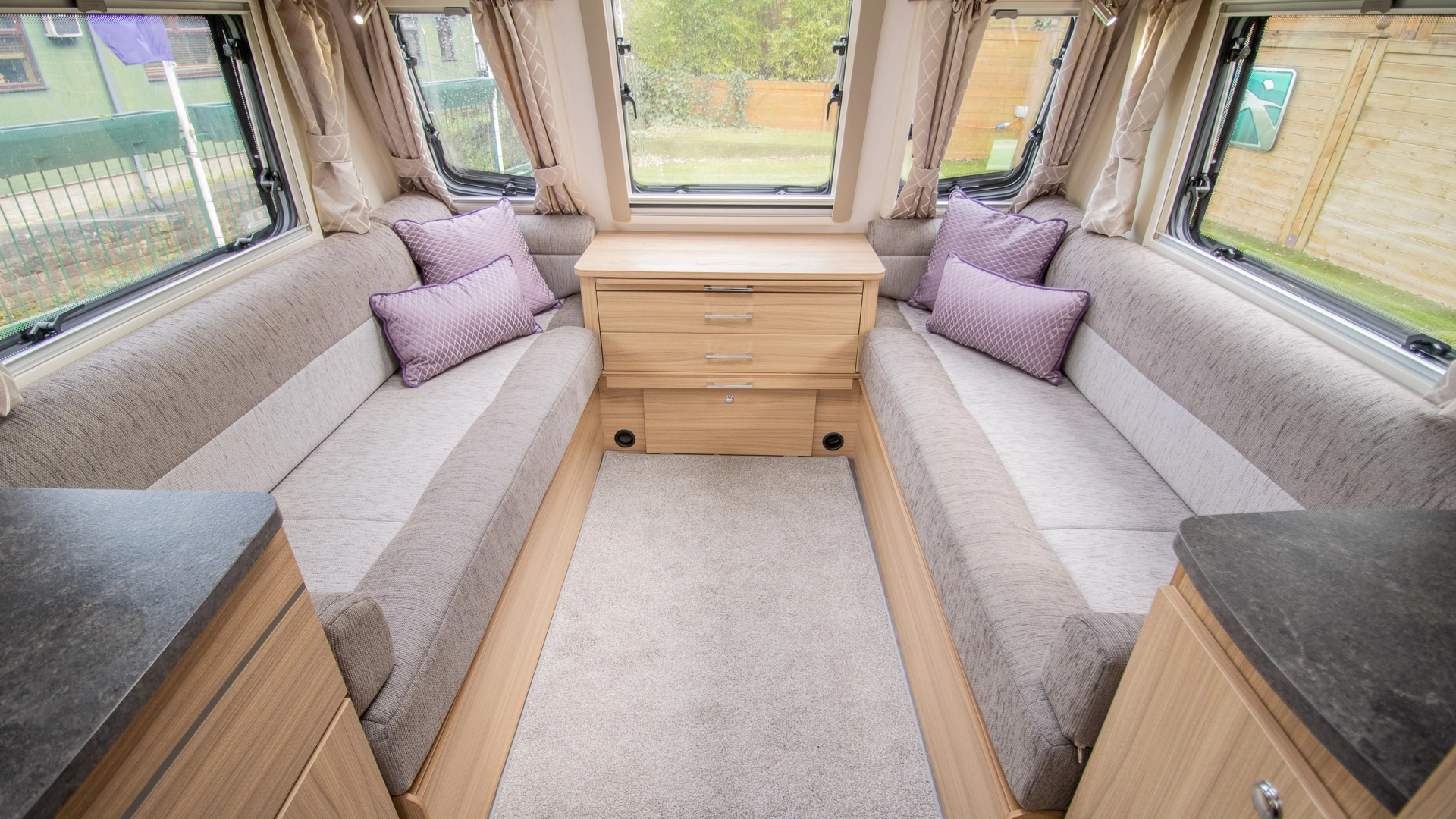 The front lounge features twin sofas that create a bright, sociable living area during the day, and can convert into a comfortable double bed at night.
