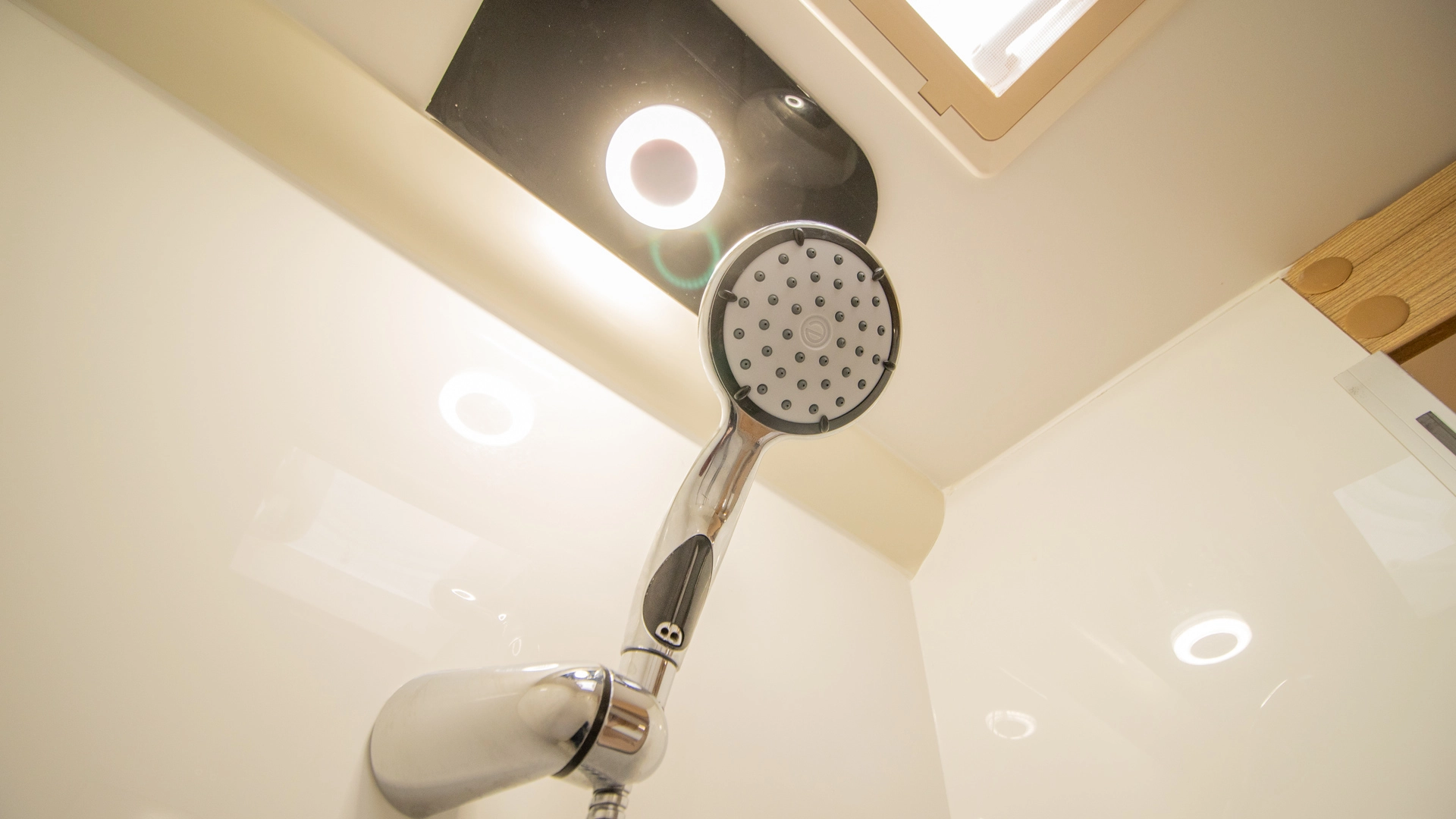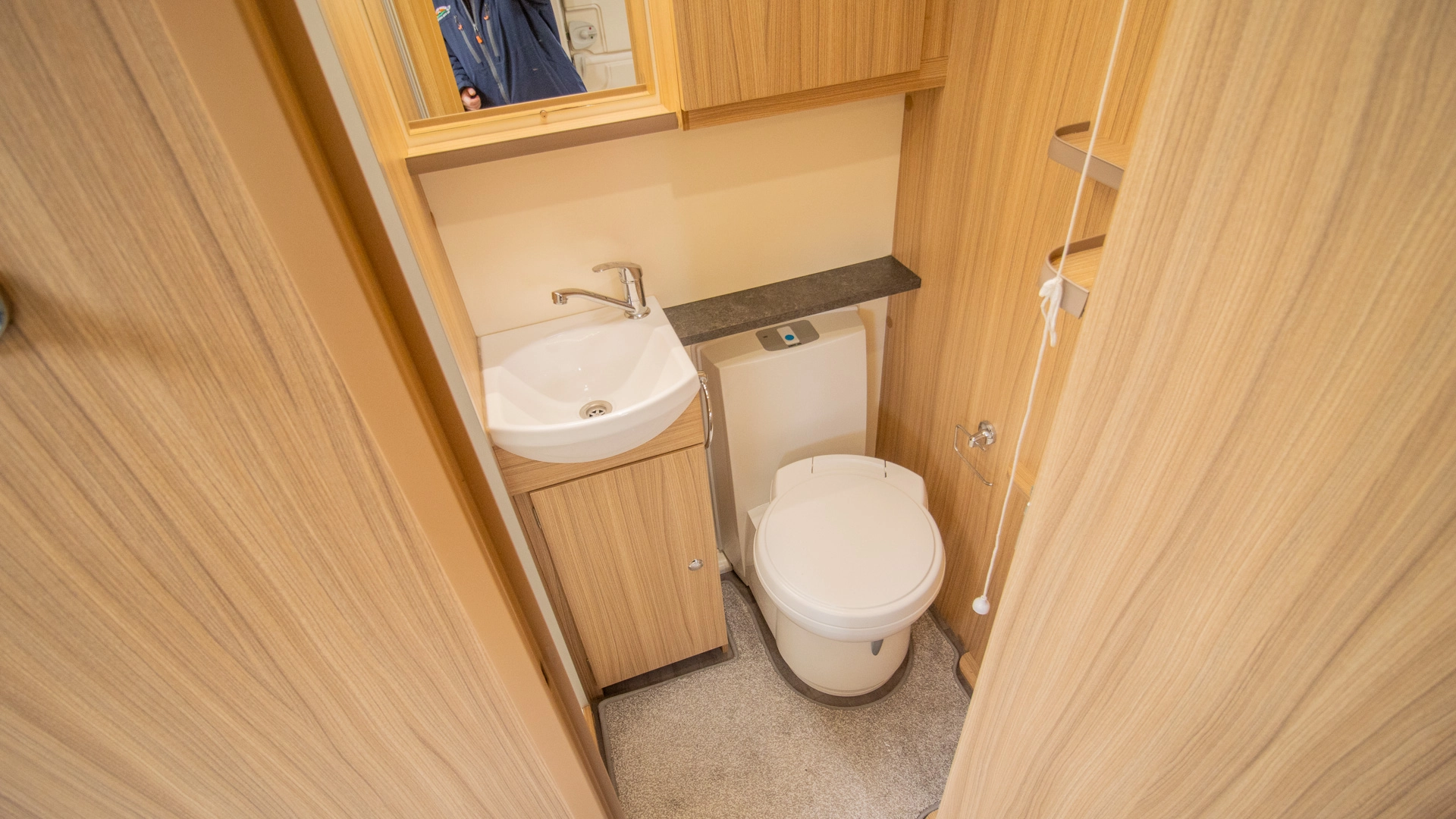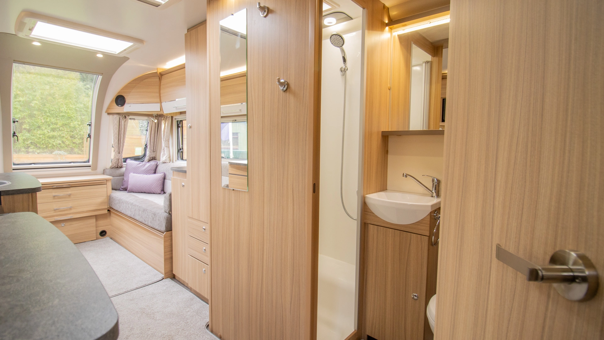The centre washroom features a dedicated shower, toilet and basin while separating the living and sleeping areas, offering both convenience and privacy.