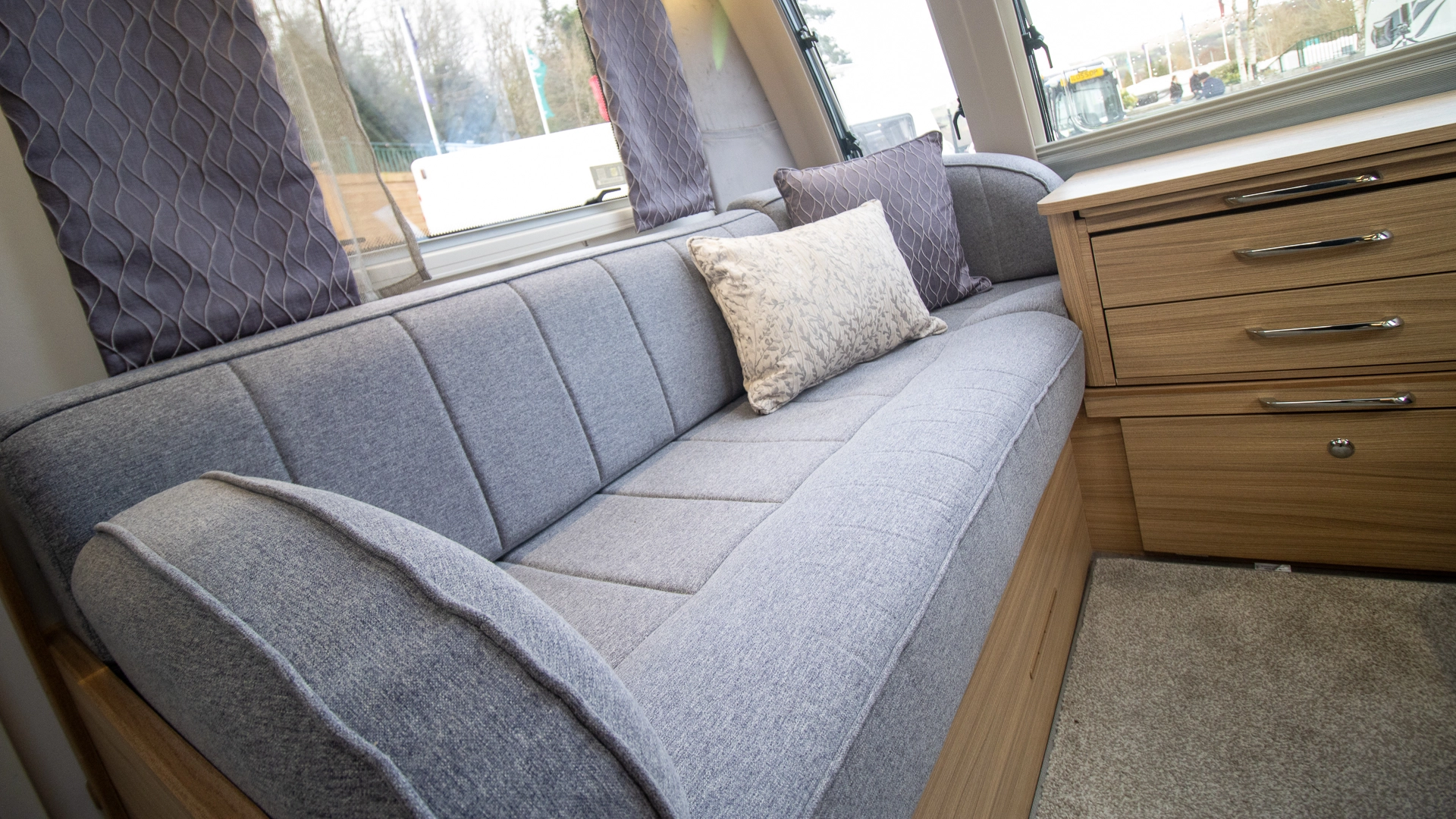 The front lounge features twin sofas that create a bright, sociable living area during the day, and converts into a comfortable double bed at night.