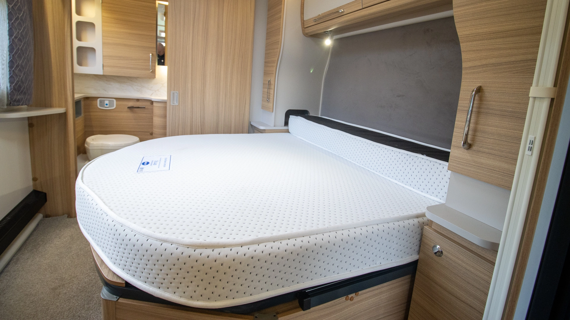 The fixed island bed provides a dedicated sleeping zone with walk‑around access and generous under‑bed storage. This permanent bed setup means there’s no nightly bed‑making.