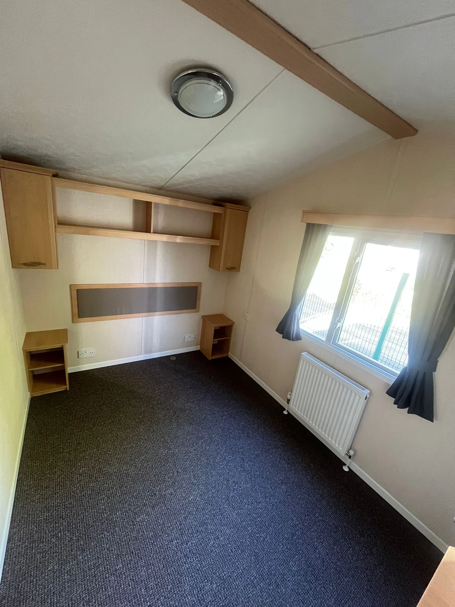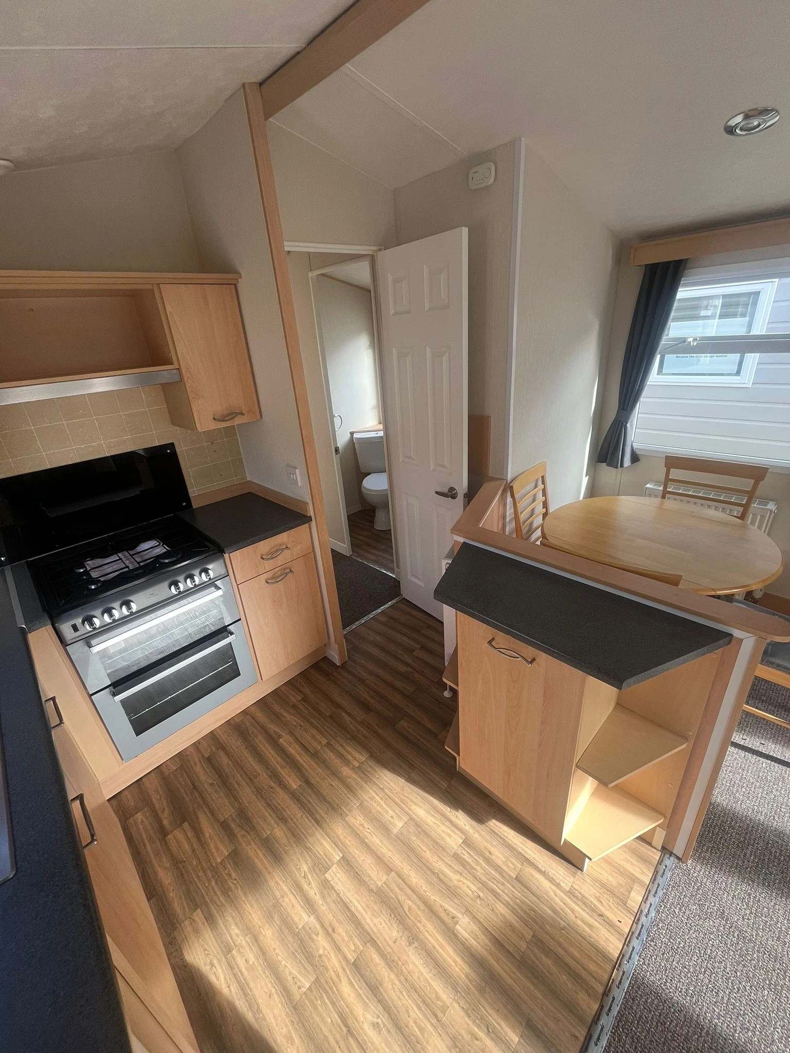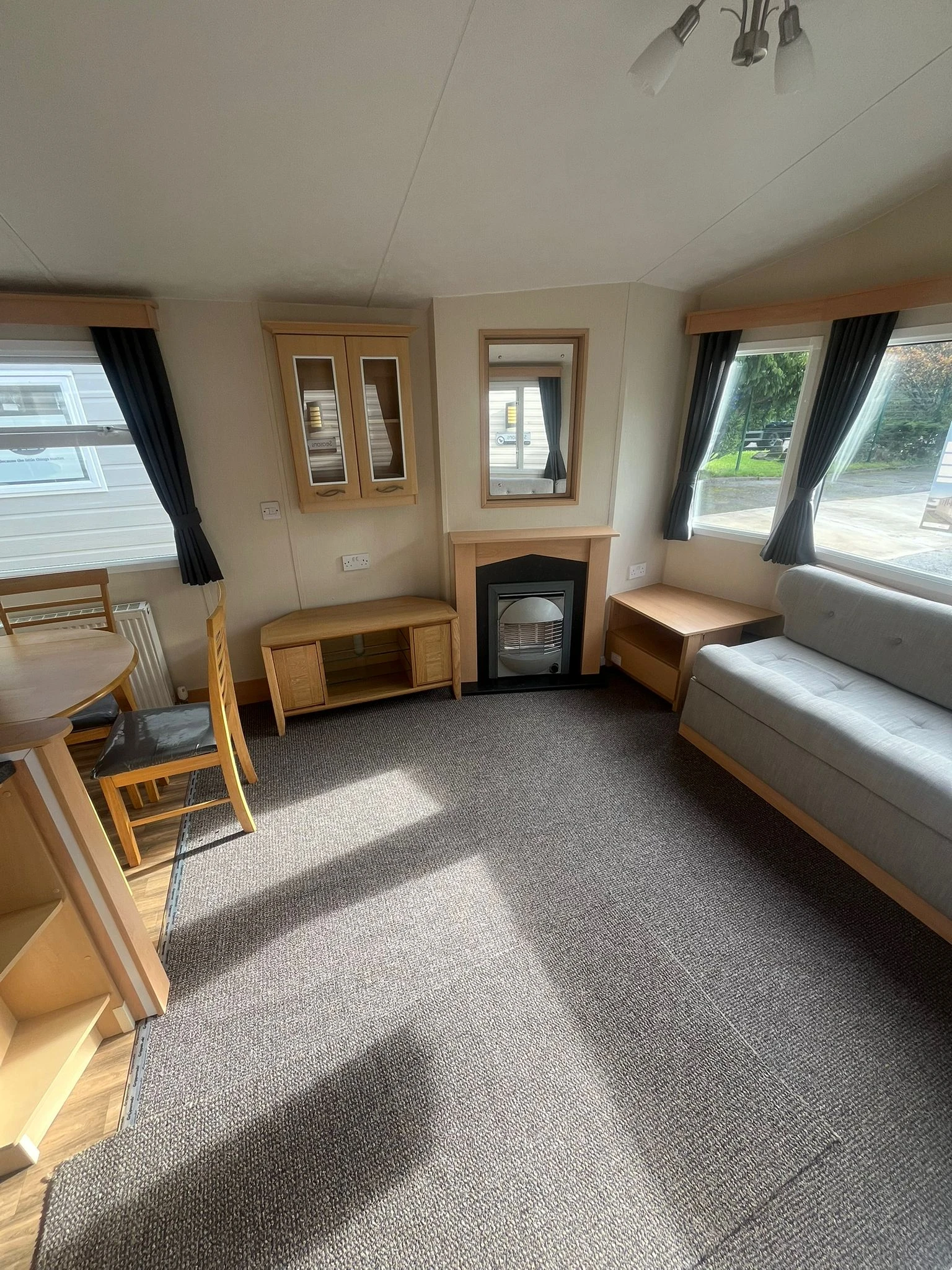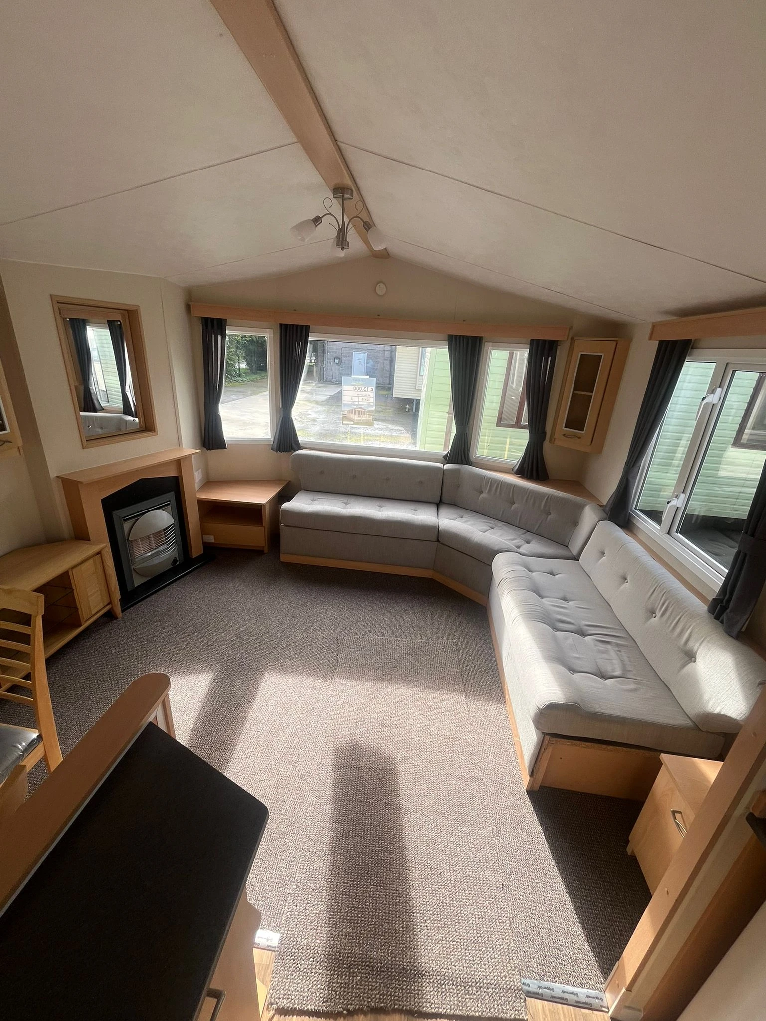 The Open plan Front section of the caravan creates a Spacious, Relaxing Living Space, enhanced by large Windows and Fixed L Shaped Seating Area. The lounge Also Comes with Tv unit With storage underneath and a Gas fire for extra warmth alongside the central heating throughout the winter months.