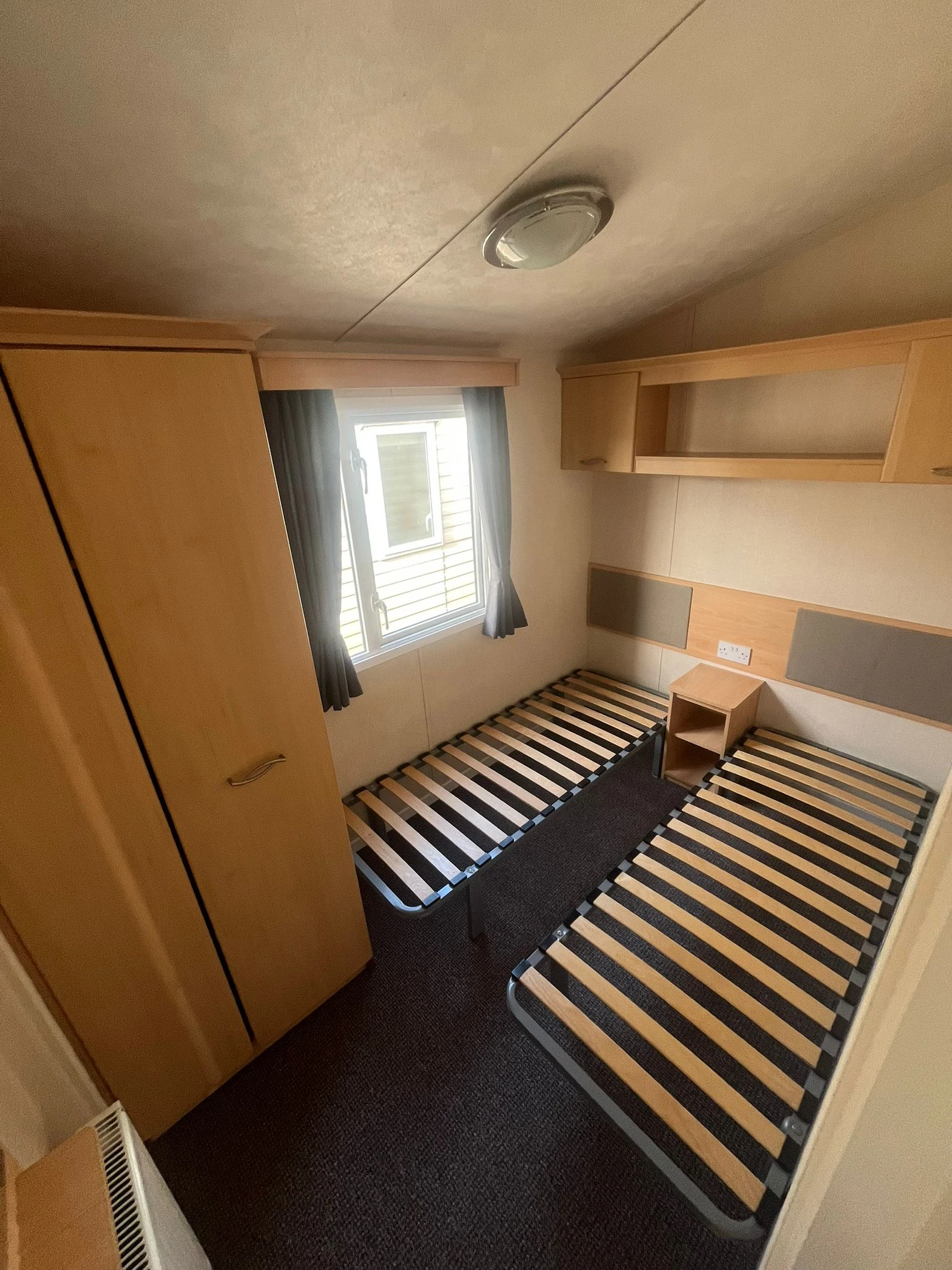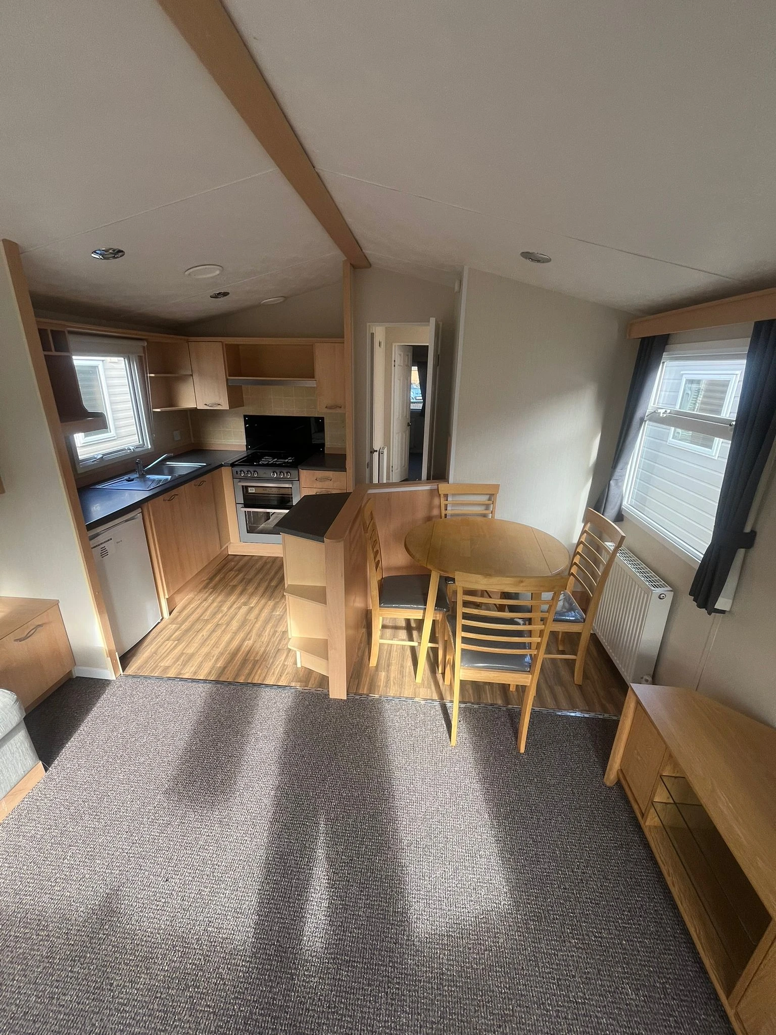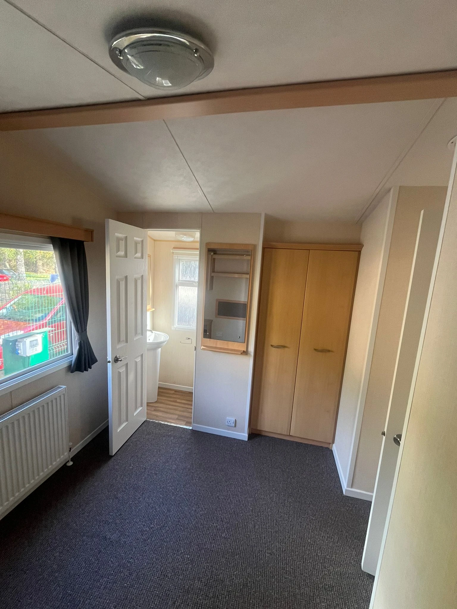 The Open plan Front section of the caravan creates a Spacious, Relaxing Living Space, enhanced by large Windows and Fixed L Shaped Seating Area. The lounge Also Comes with Tv unit With storage underneath and a Gas fire for extra warmth alongside the central heating throughout the winter months.
