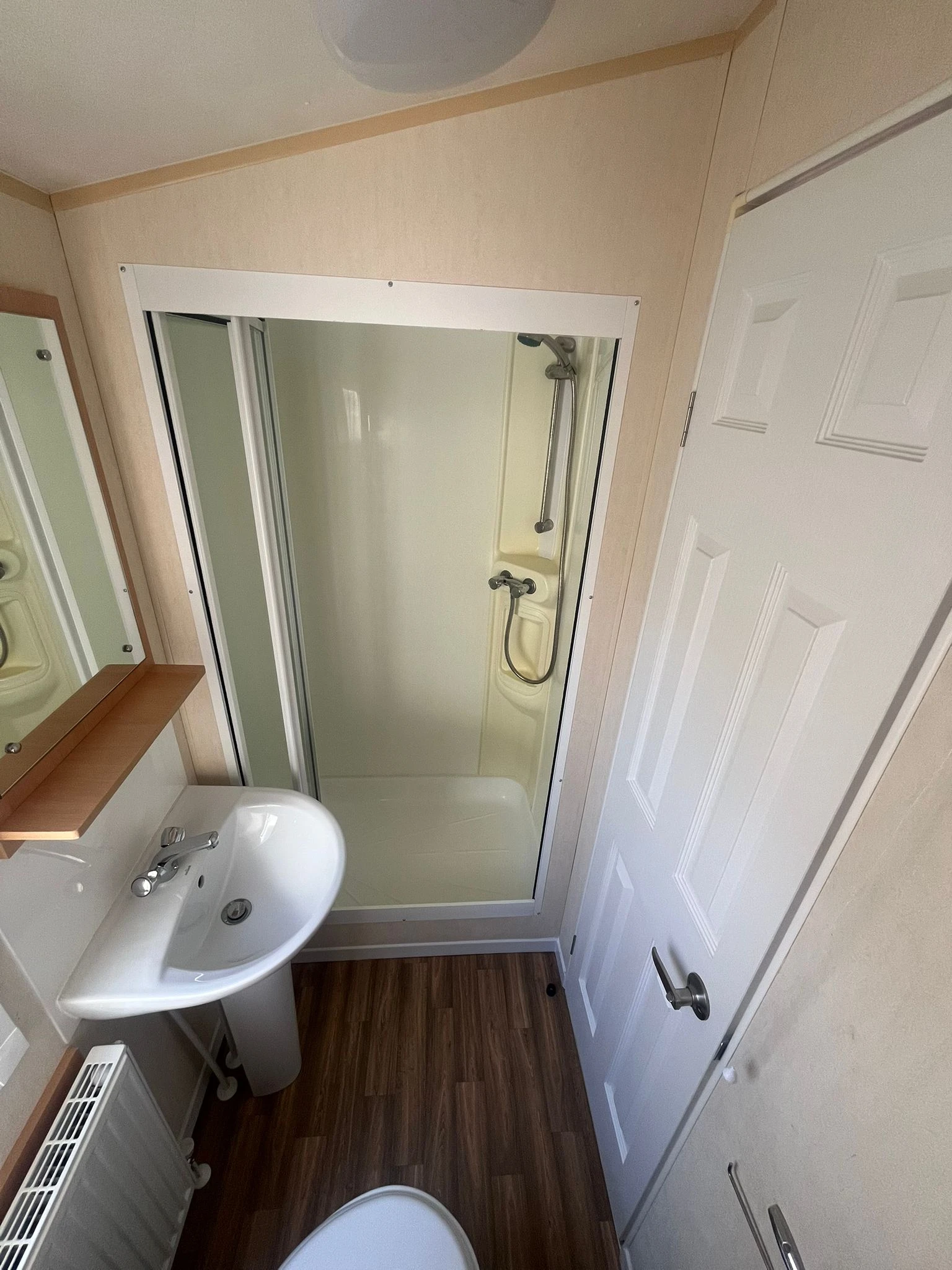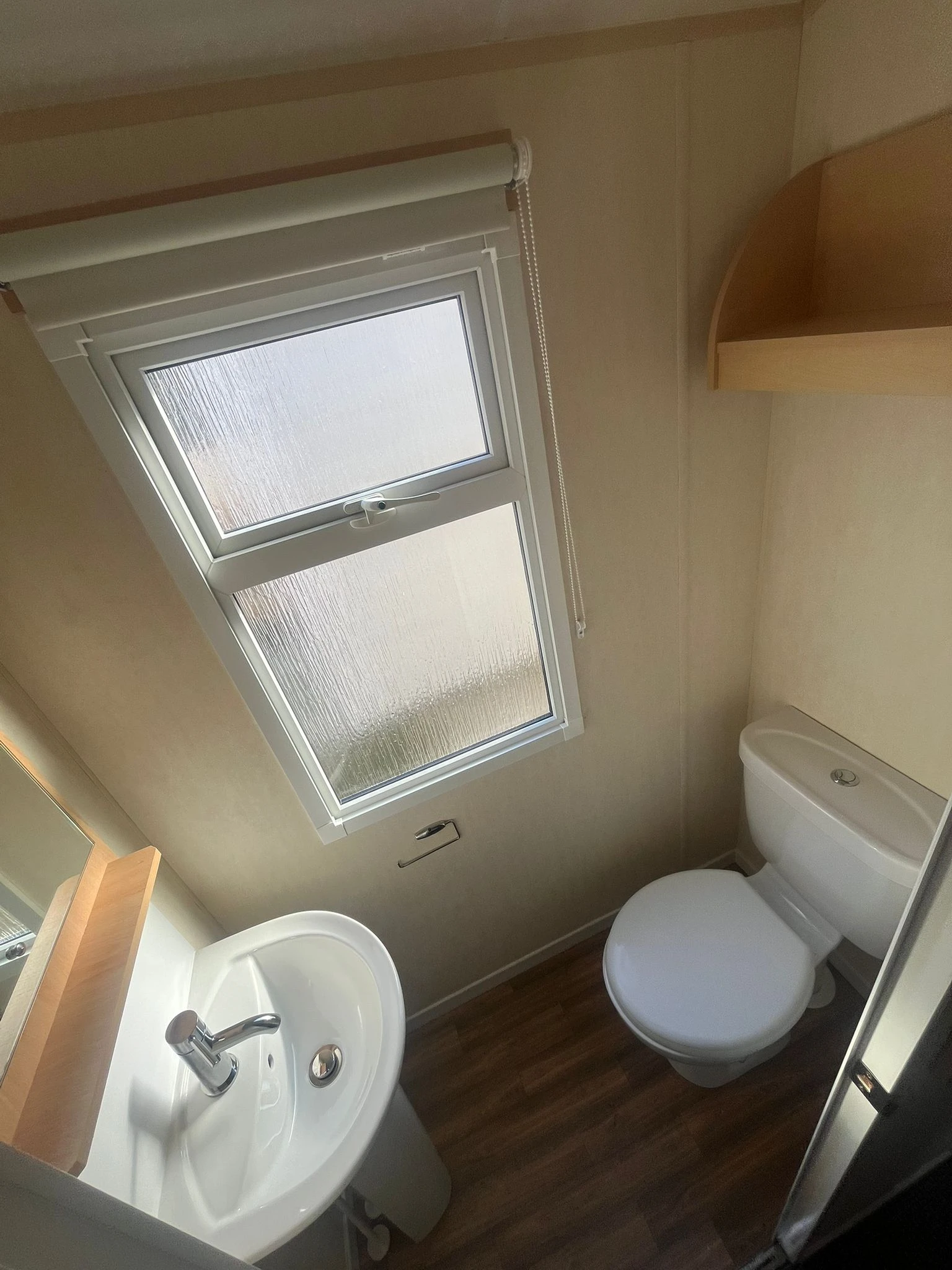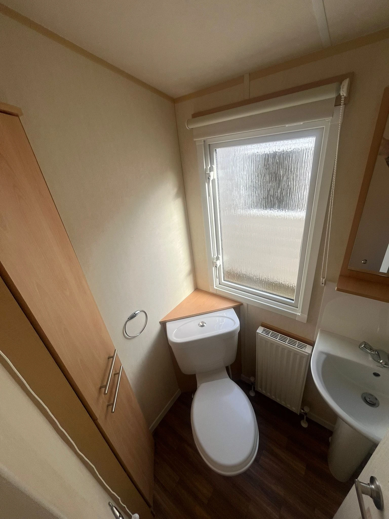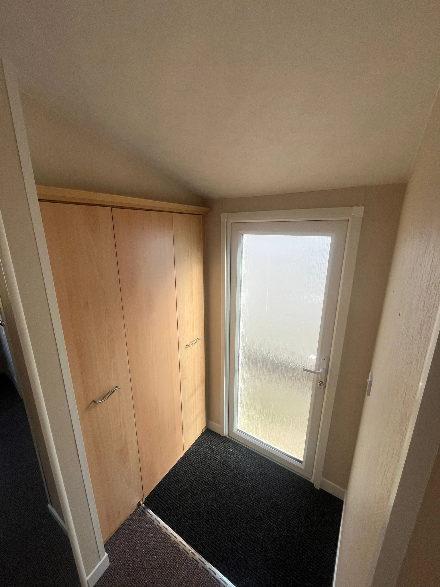 The Open plan Front section of the caravan creates a Spacious, Relaxing Living Space, enhanced by large Windows and Fixed L Shaped Seating Area. The lounge Also Comes with Tv unit With storage underneath and a Gas fire for extra warmth alongside the central heating throughout the winter months.