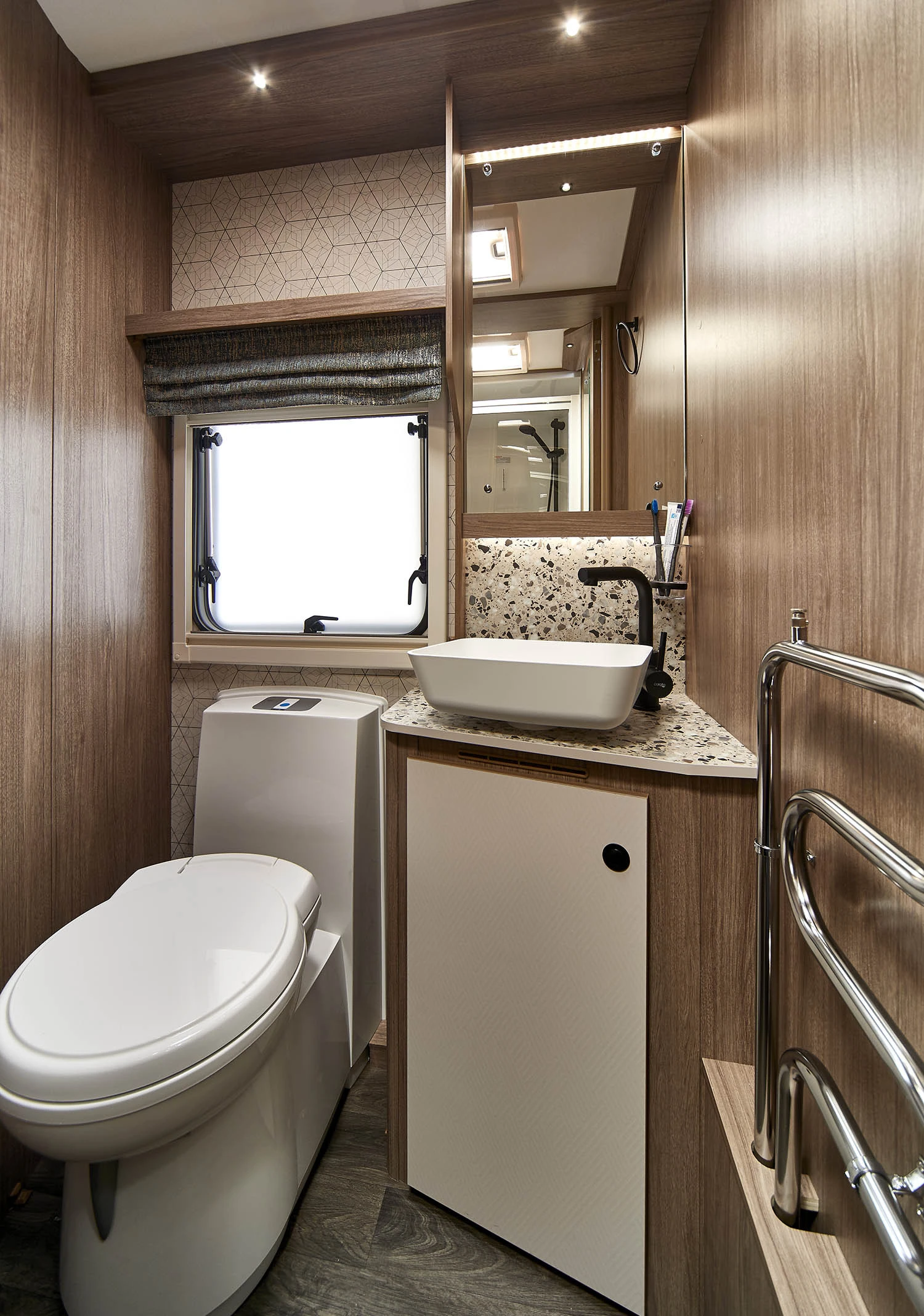 Full-width end washroom with a large, fully lined domestic-style square shower (LED light + pivot door) for that “proper bathroom” comfort on tour