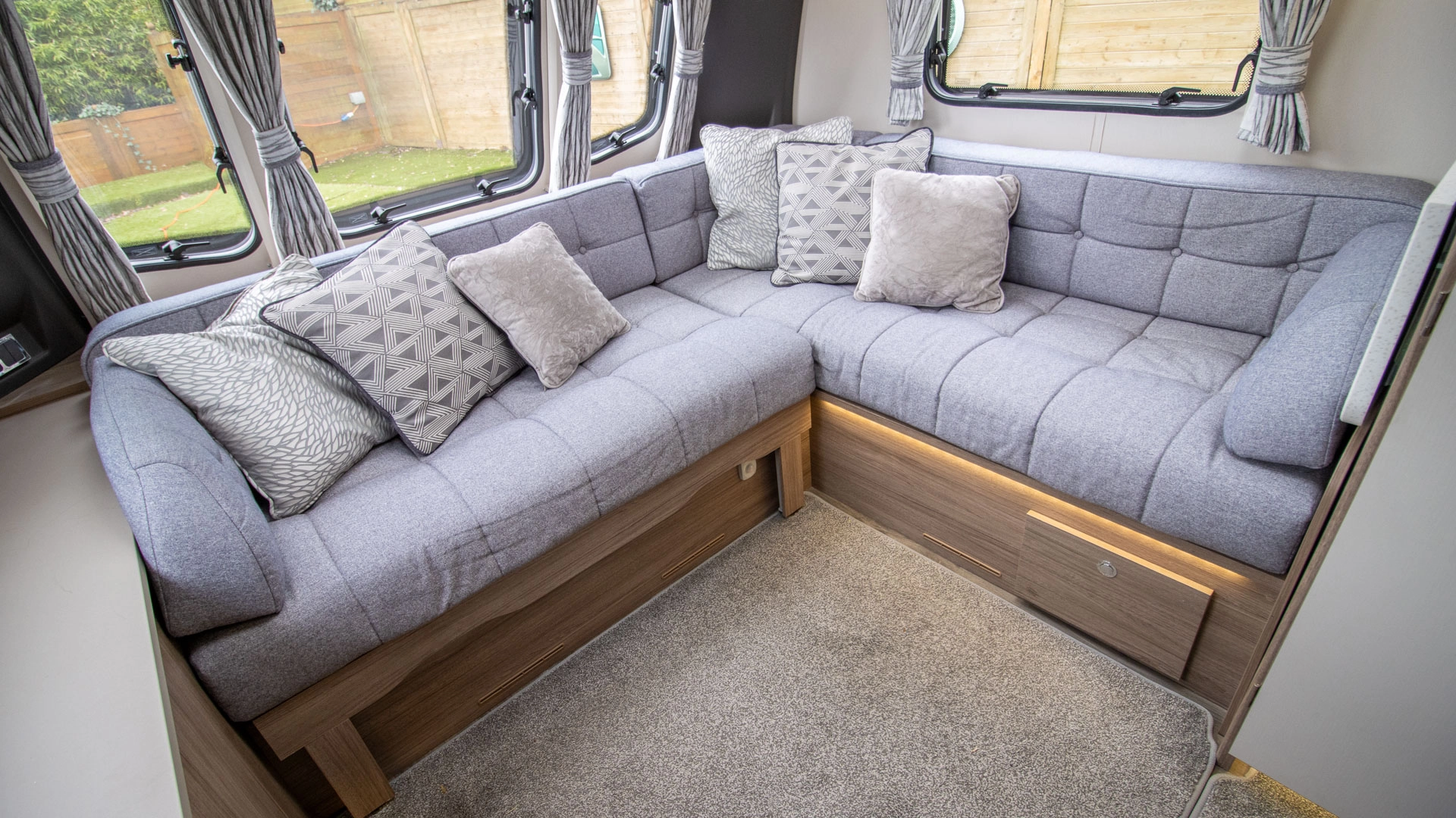 The spacious L‑shaped lounge provides a large, sociable living area during the day, and at night, converts into additional sleeping space when needed.