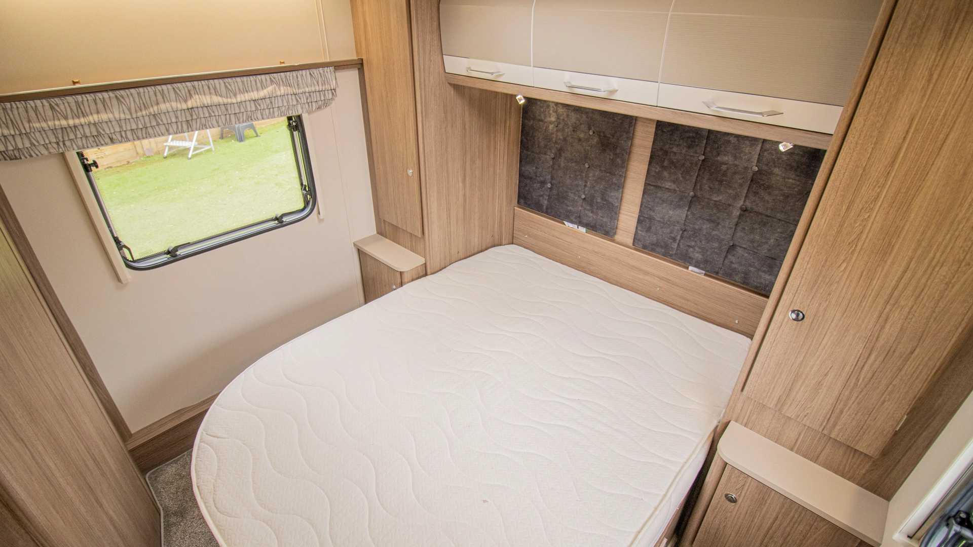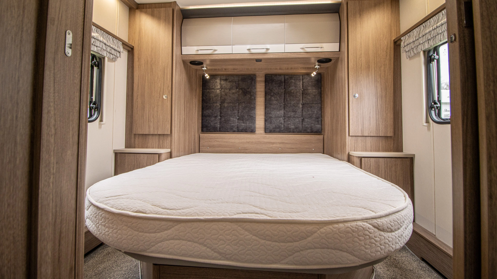 Requiring no nightly bed making, the fixed island bed provides a dedicated sleeping zone with walk‑around access and generous under‑bed storage.