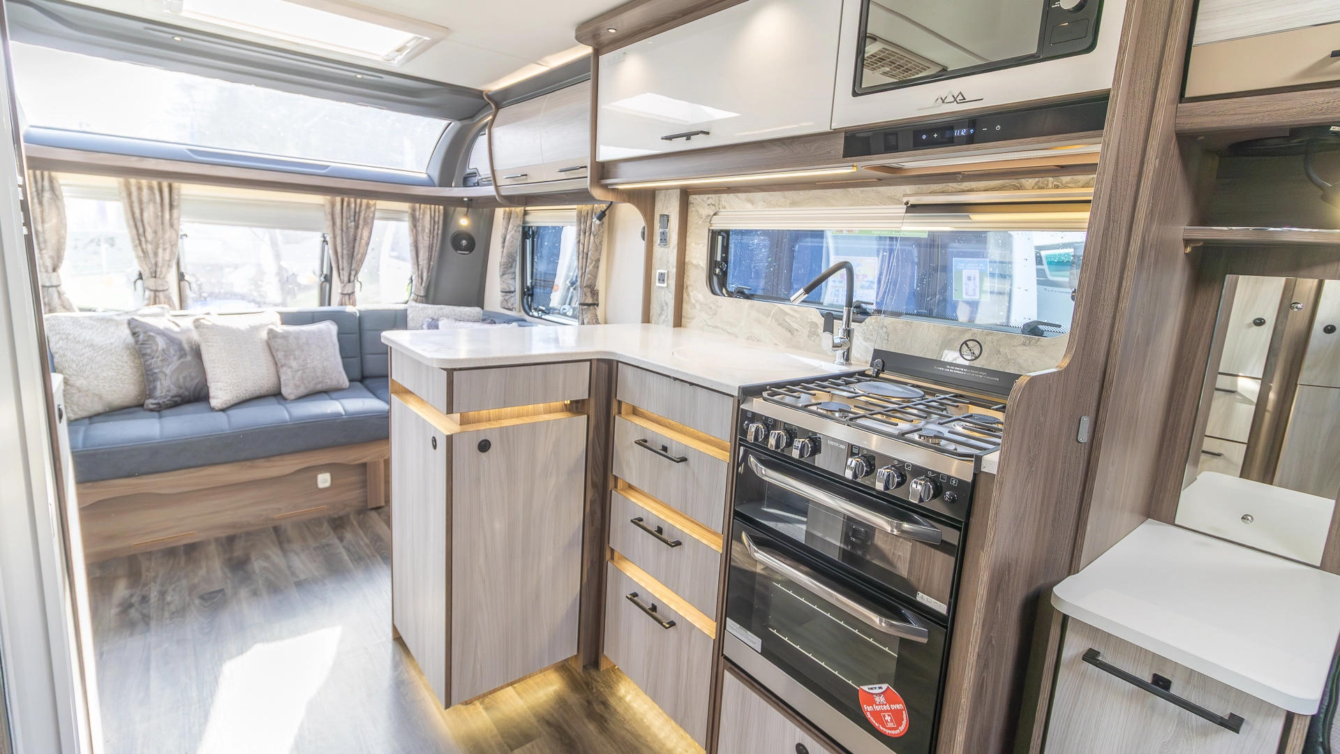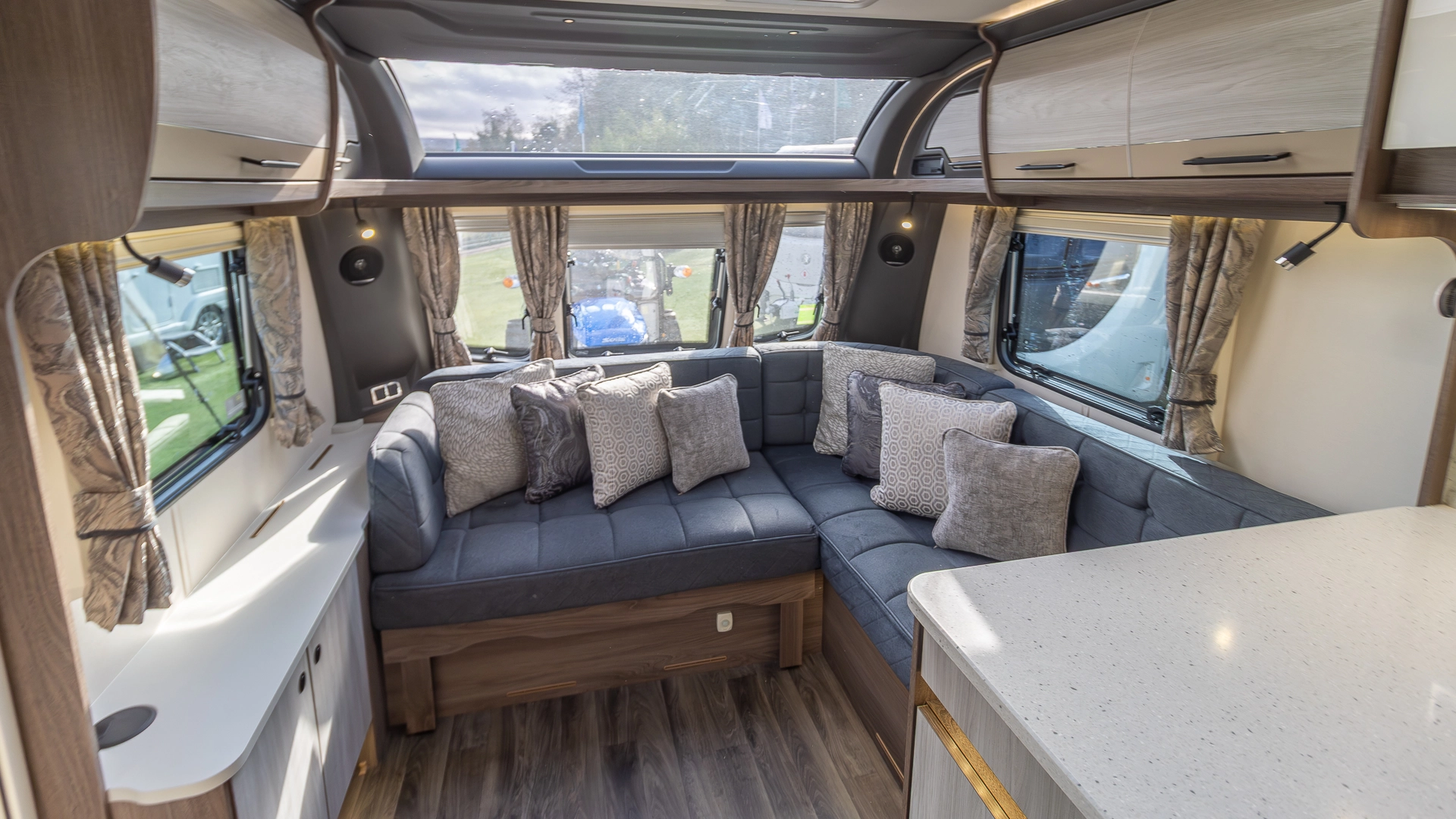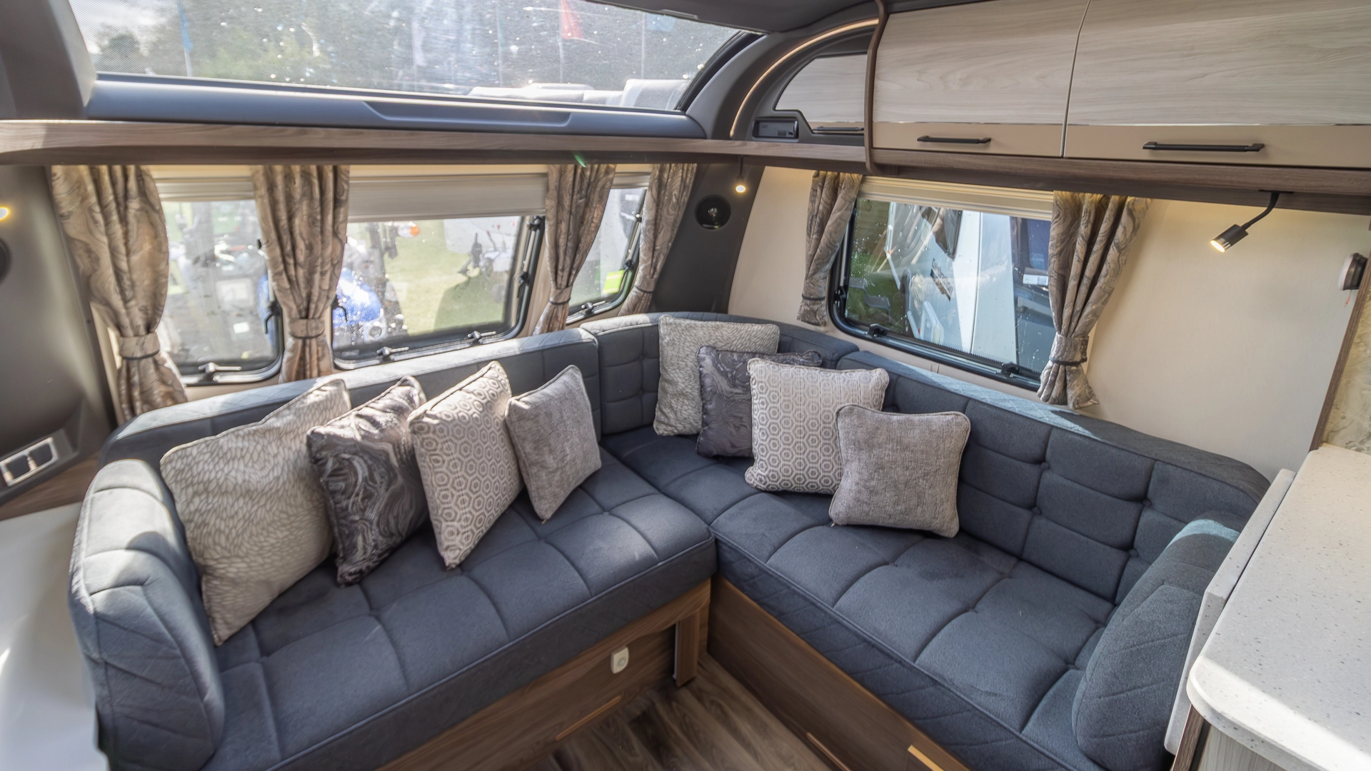 The spacious L‑shaped lounge provides a large, sociable living area during the day, and at night, converts into additional sleeping space when needed.
