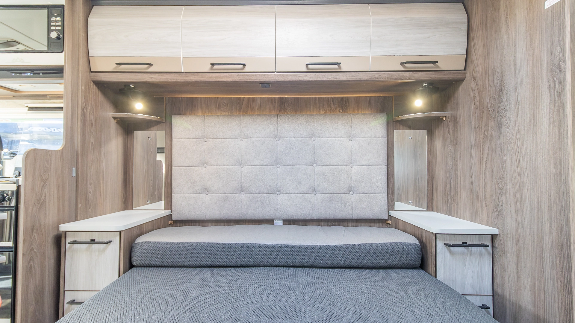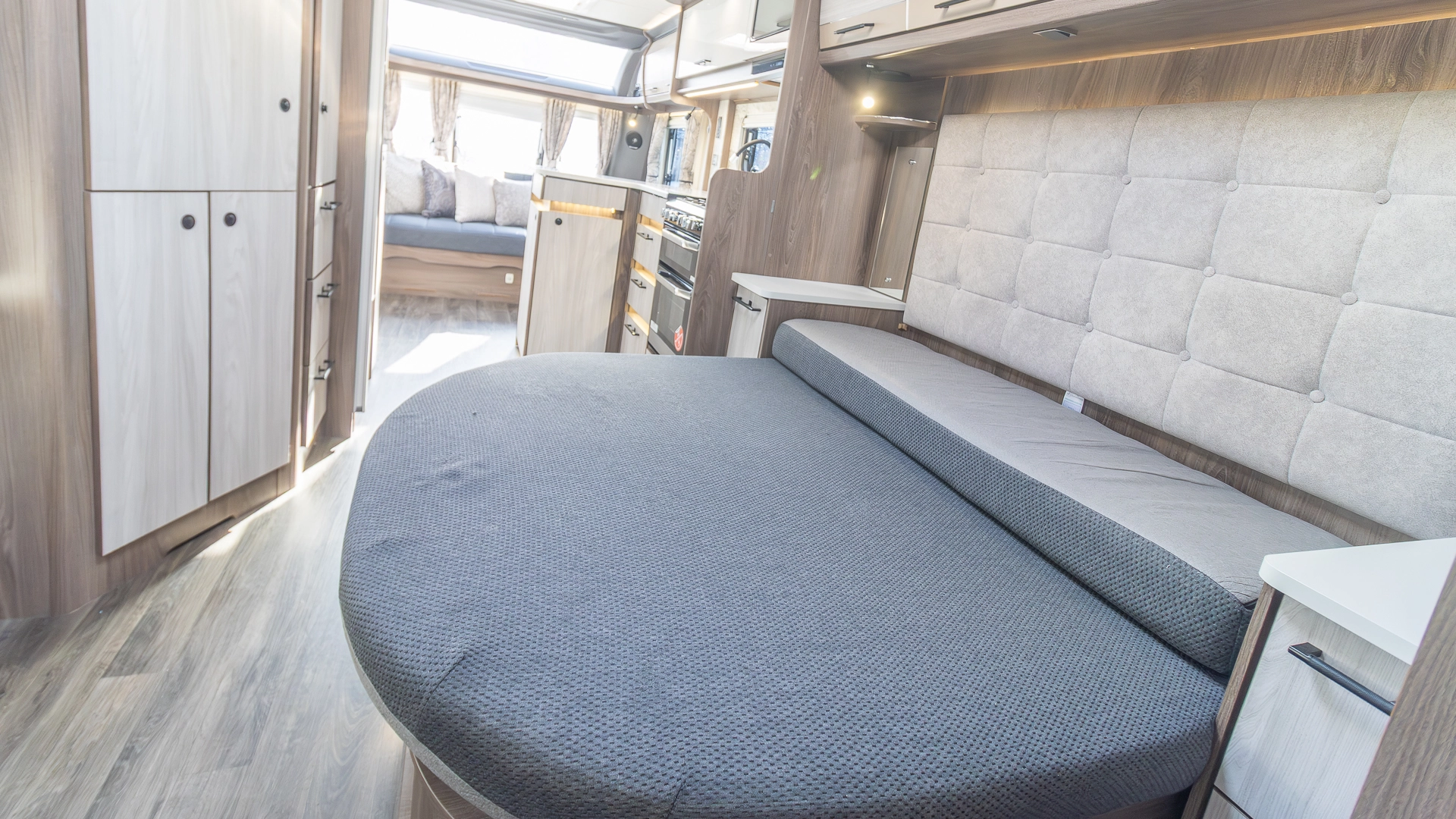 Requiring no nightly bed making, the fixed island bed provides a dedicated sleeping zone with walk‑around access and generous under‑bed storage.