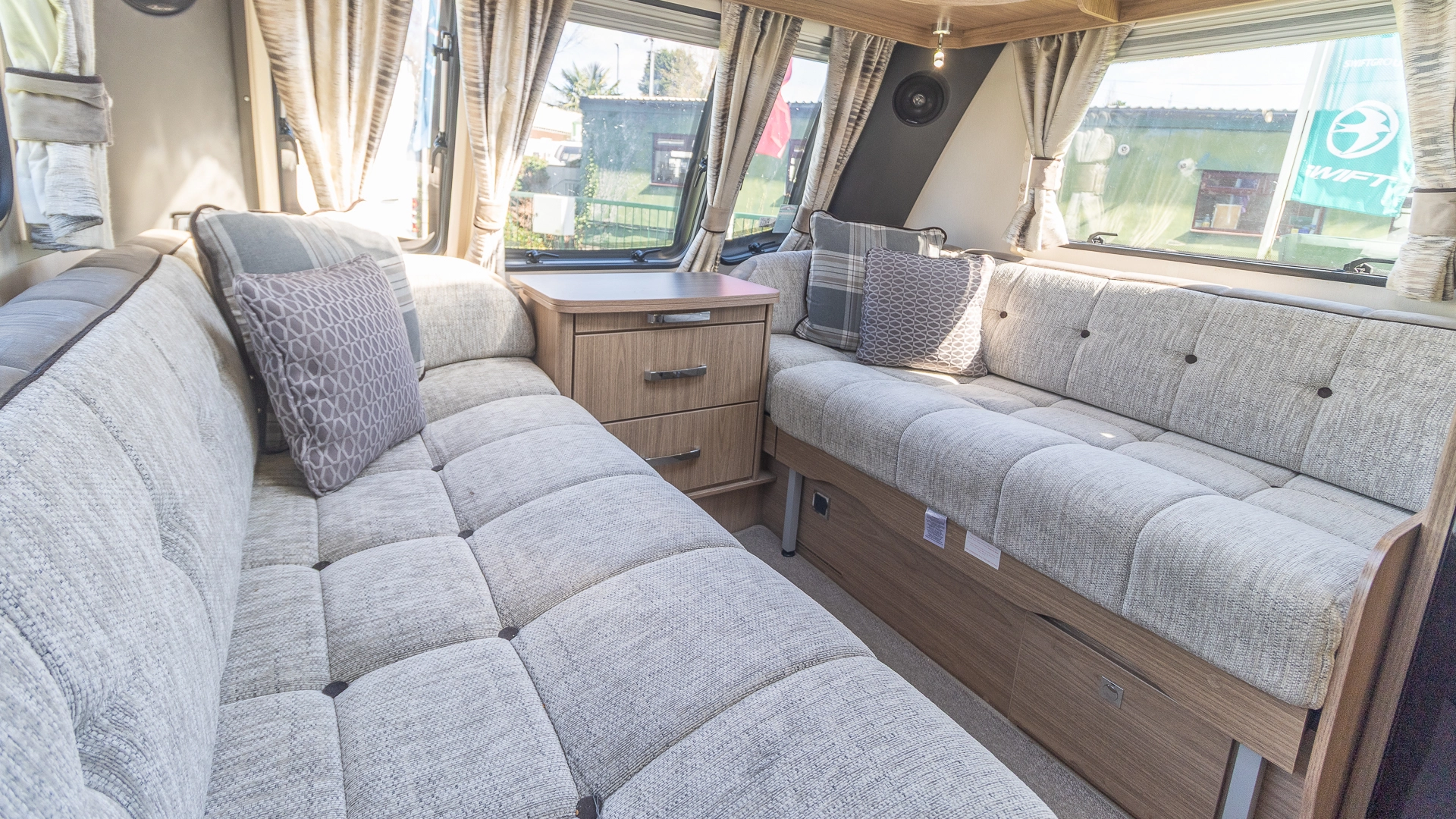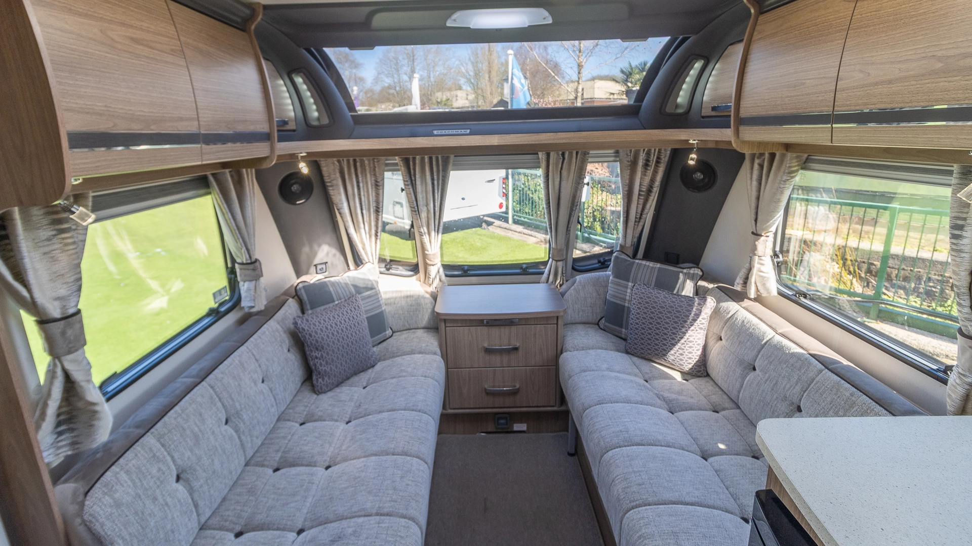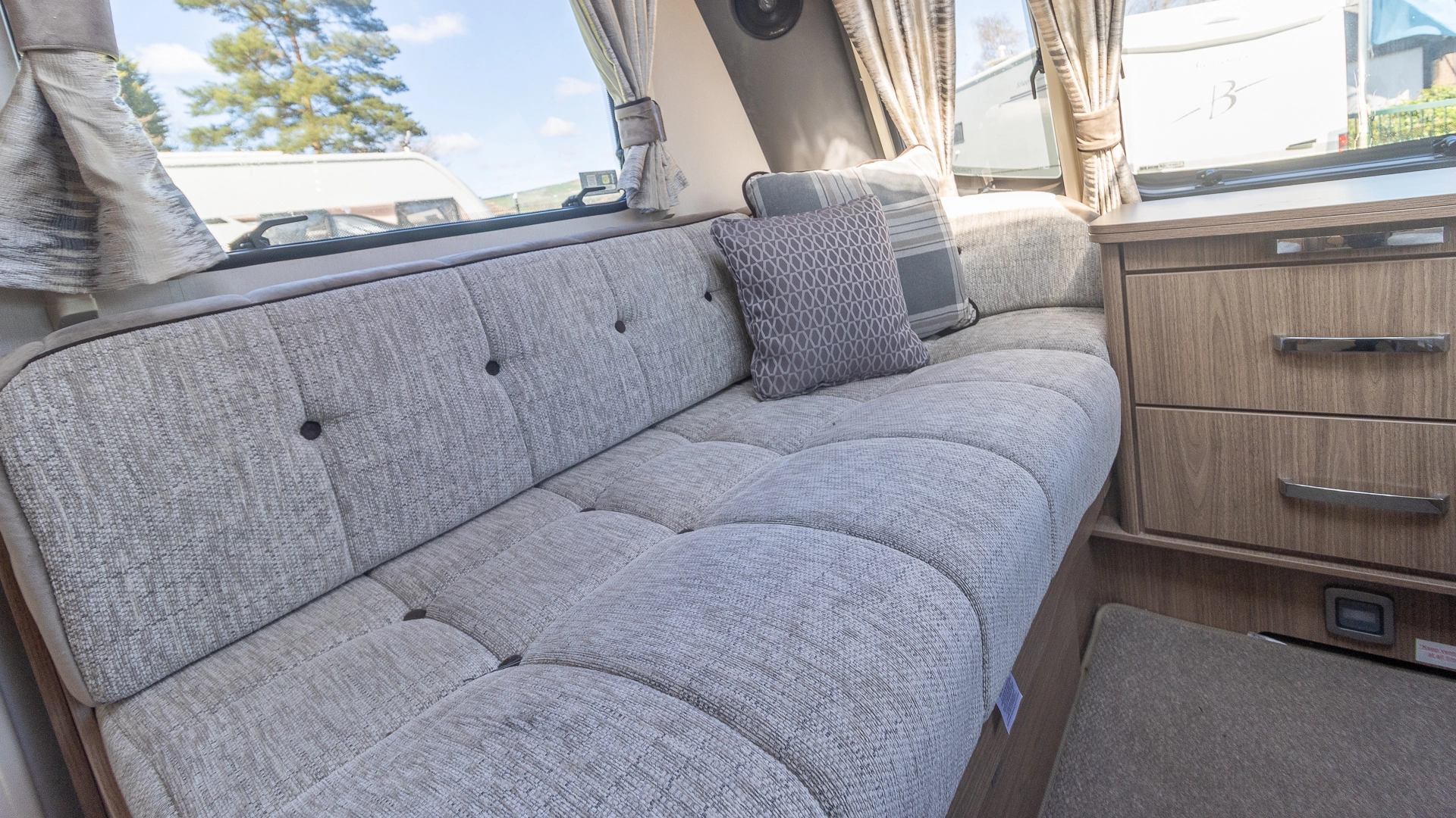 The front lounge features twin sofas that create a bright, sociable living area during the day, and can convert into a comfortable double bed at night.