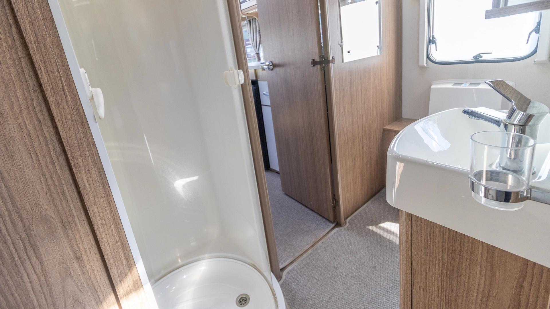 The centre washroom features a dedicated shower, toilet and basin while separating the living and sleeping areas, offering both convenience and privacy.