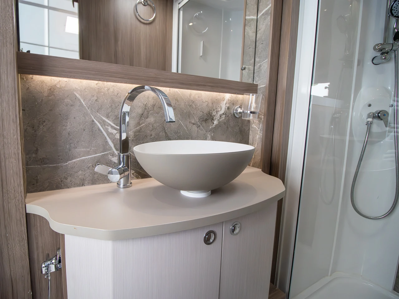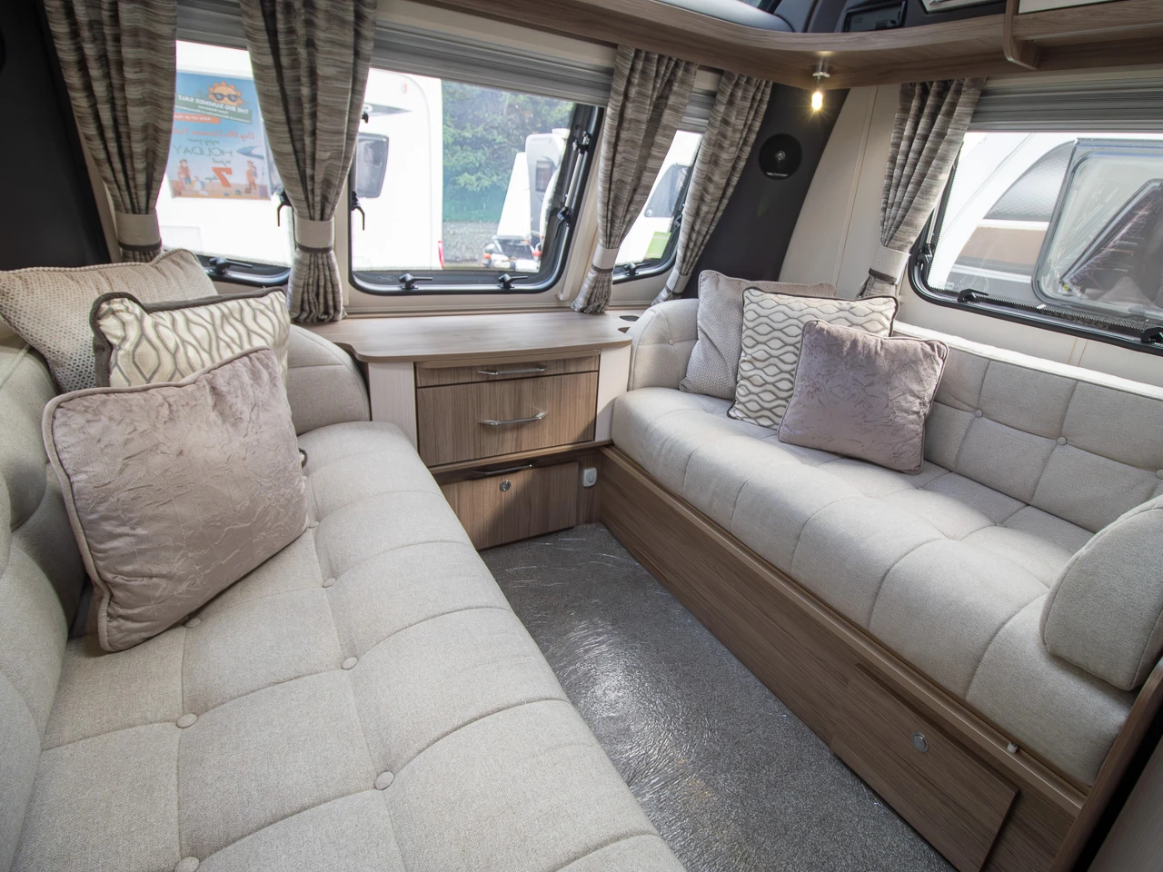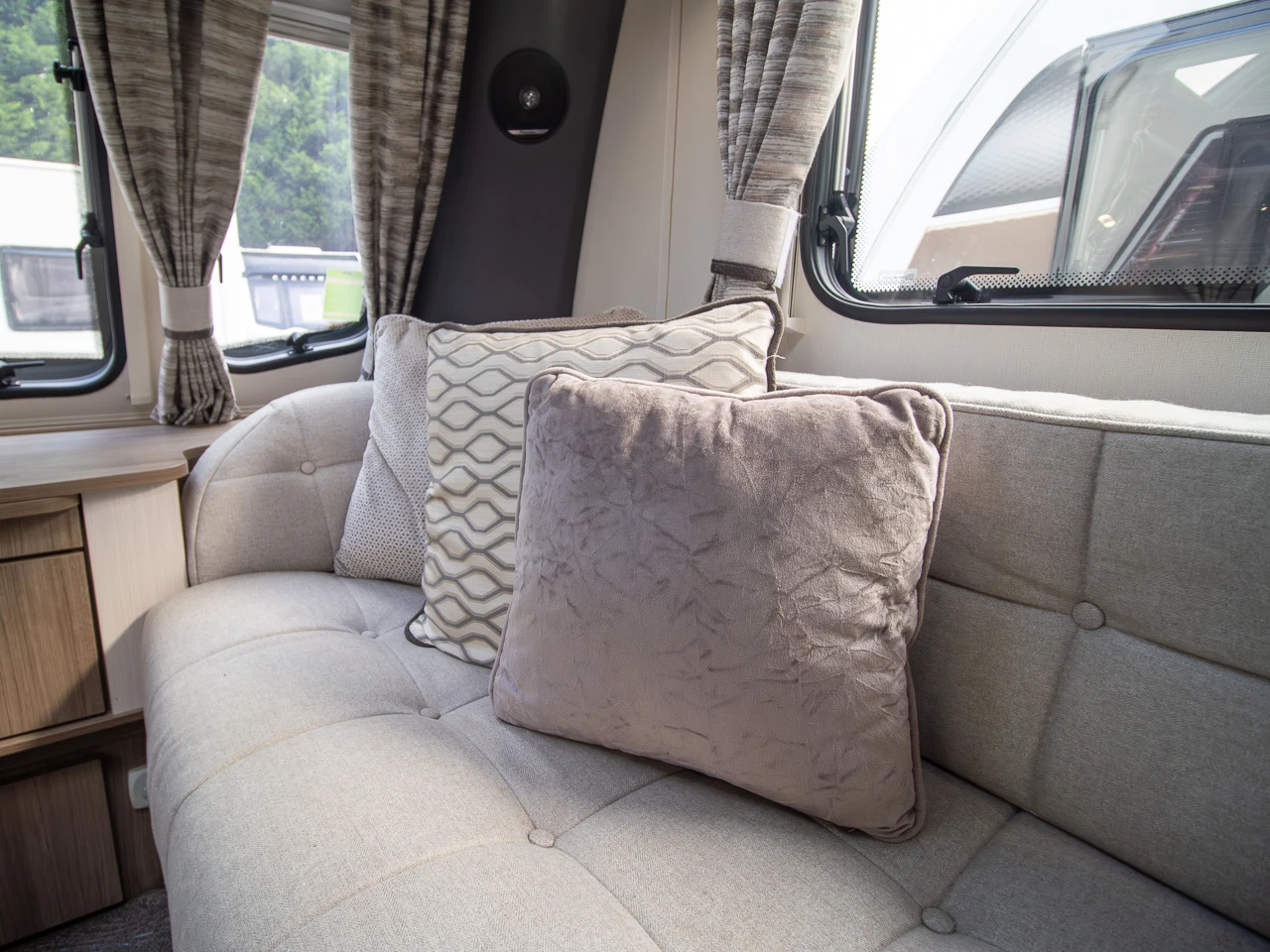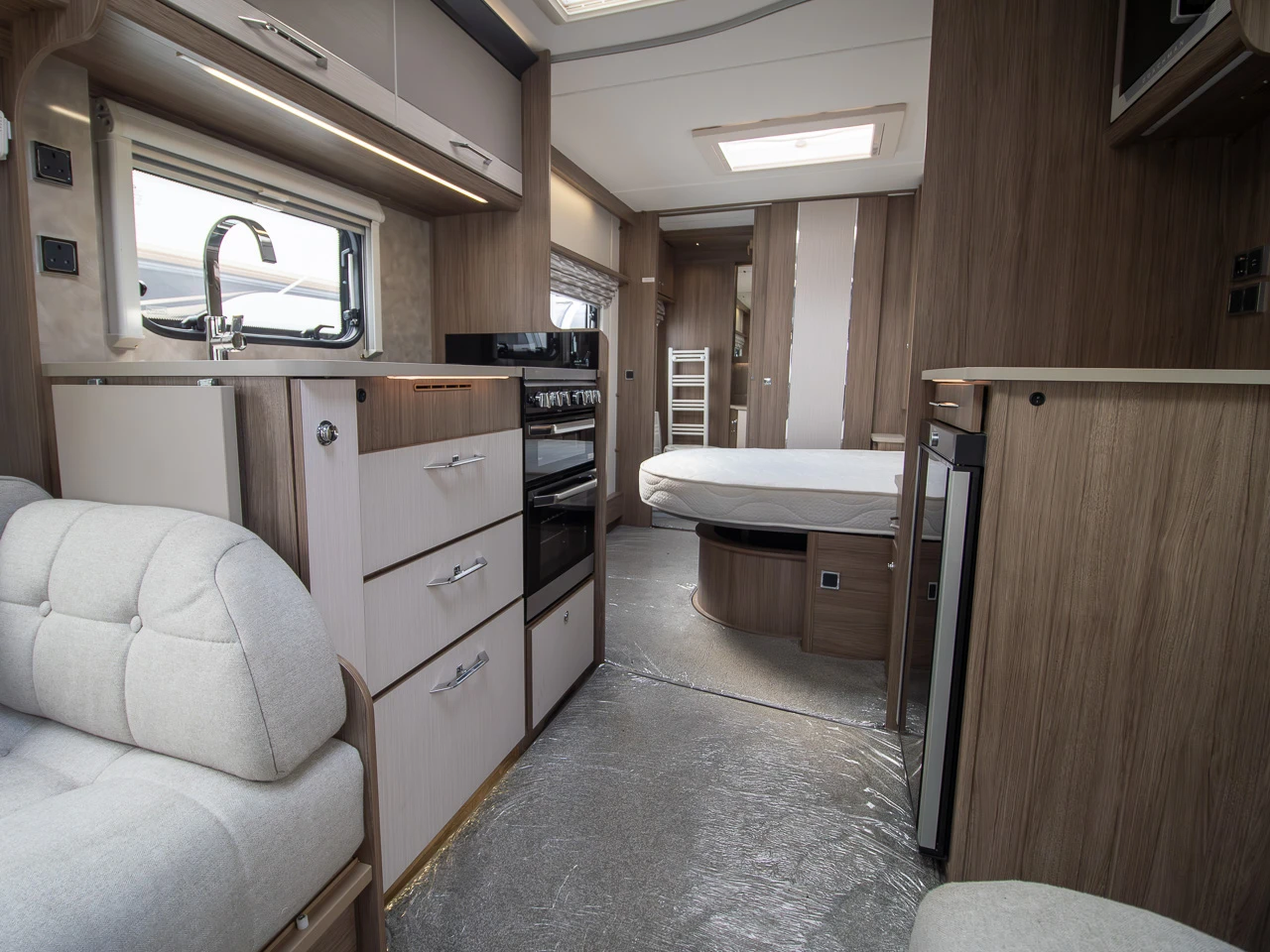 Well-equipped kitchen: The kitchen features a dual-fuel hob, full-sized oven and grill, microwave, and generous fridge/freezer, giving you the tools to prepare proper meals on the go. Combined with worktop space and clever storage, cooking in this caravan becomes a real pleasure.