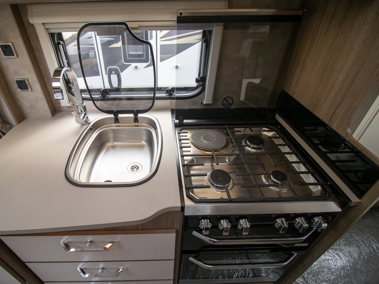 Extractor fan: Positioned above the hob, the extractor efficiently removes steam and cooking odours, helping maintain a fresh and comfortable interior especially useful when the weather keeps you indoors after meal prep.
