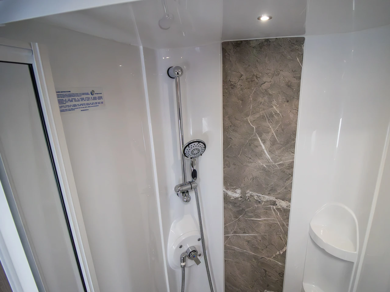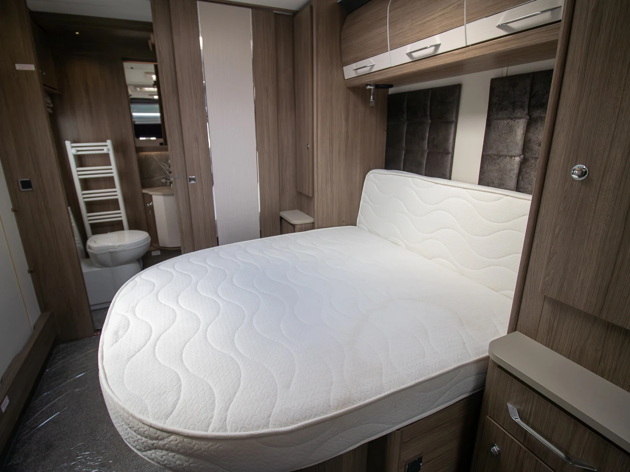 Fixed island bed: Located near the back, the fixed island bed delivers hotel-style comfort with walk-around access and generous under-bed storage. Always ready for use, it removes the nightly bed-making task and offers a restful retreat.