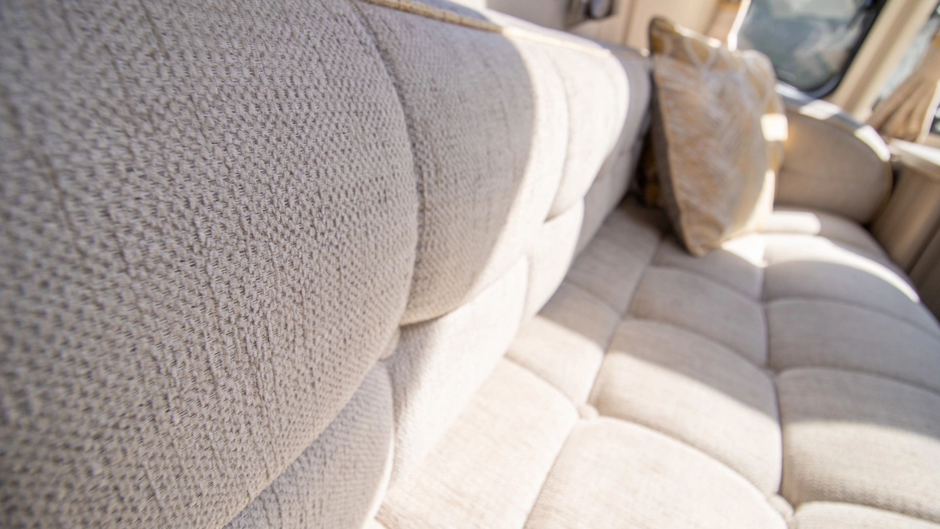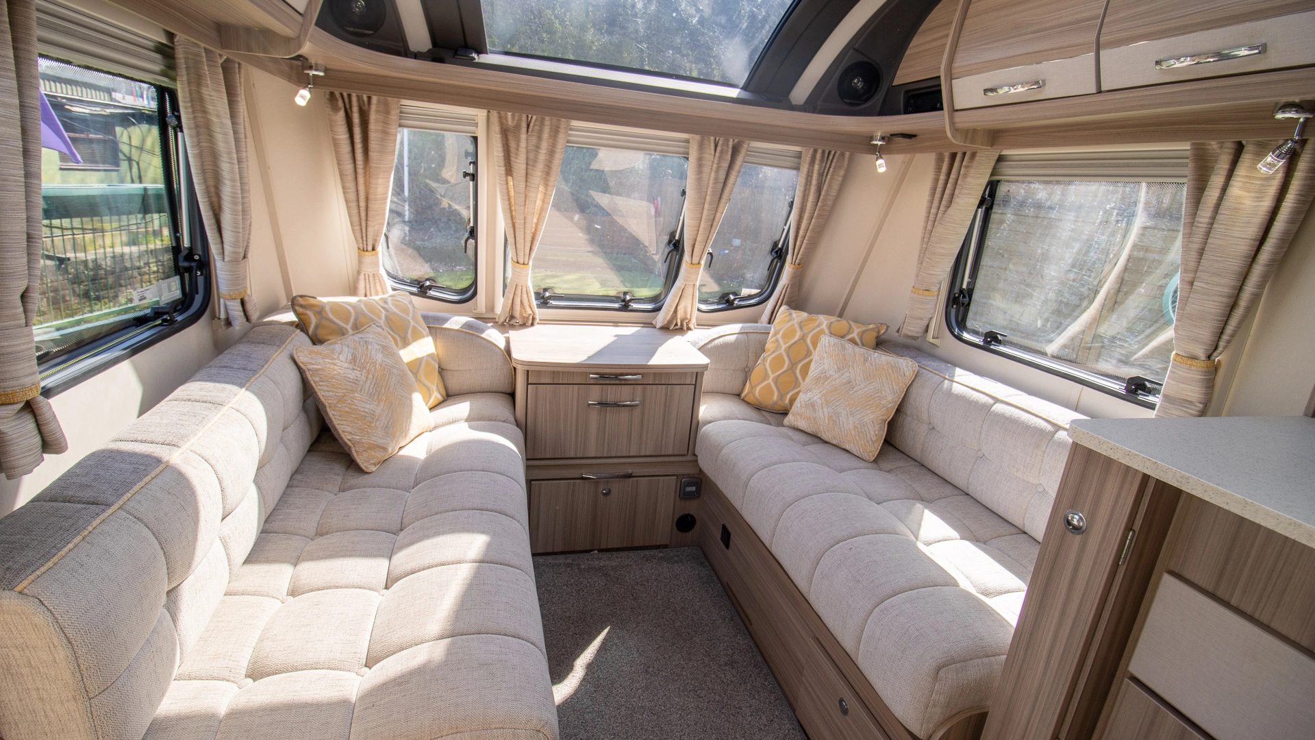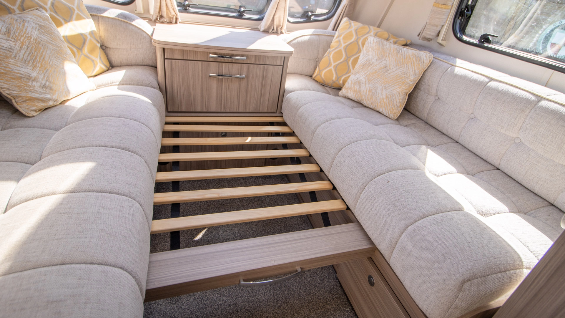 The front lounge features twin sofas that create a bright, sociable living area during the day, and can convert into a comfortable double bed at night.