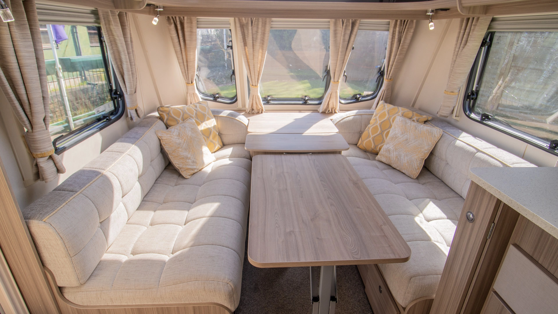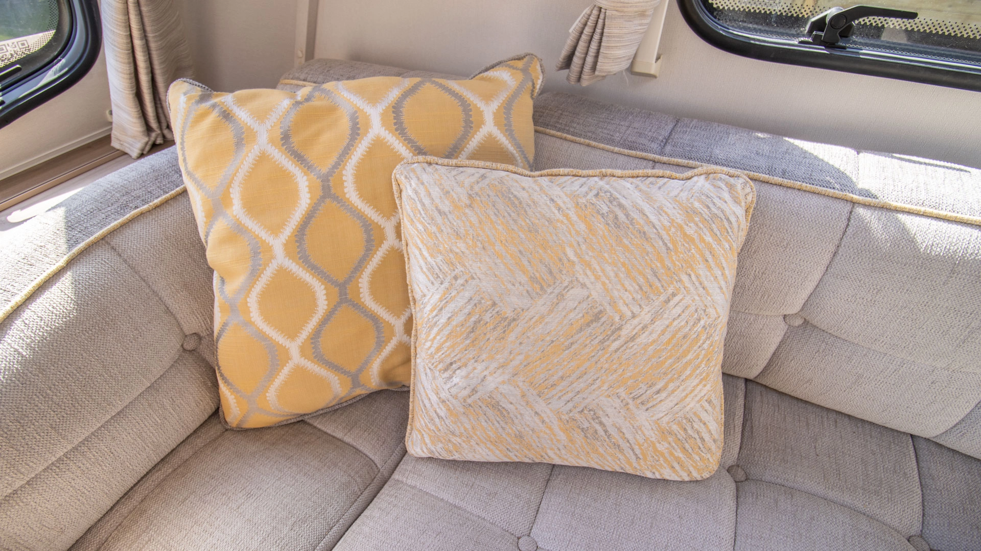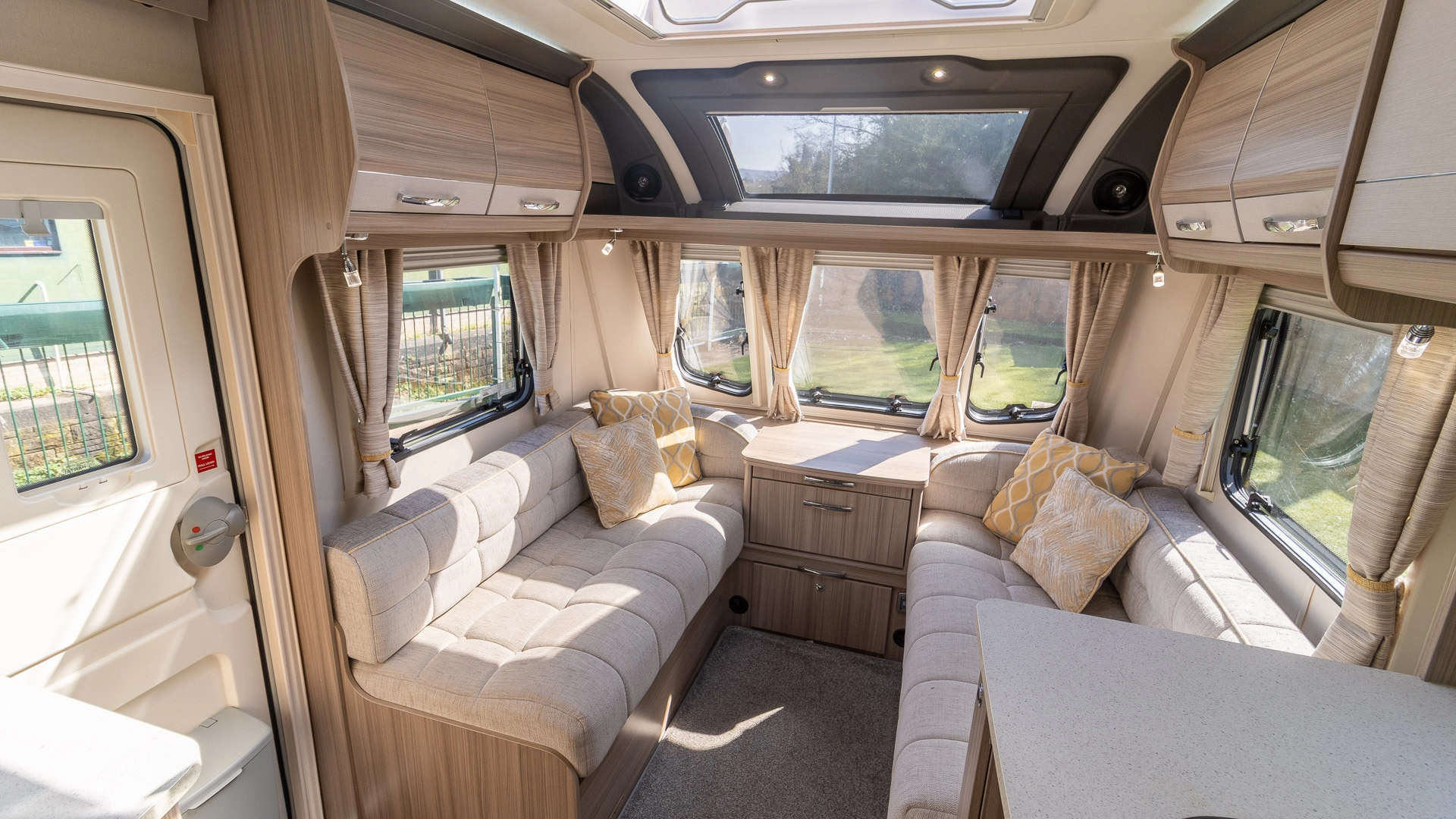 The front lounge features twin sofas that create a bright, sociable living area during the day, and can convert into a comfortable double bed at night.