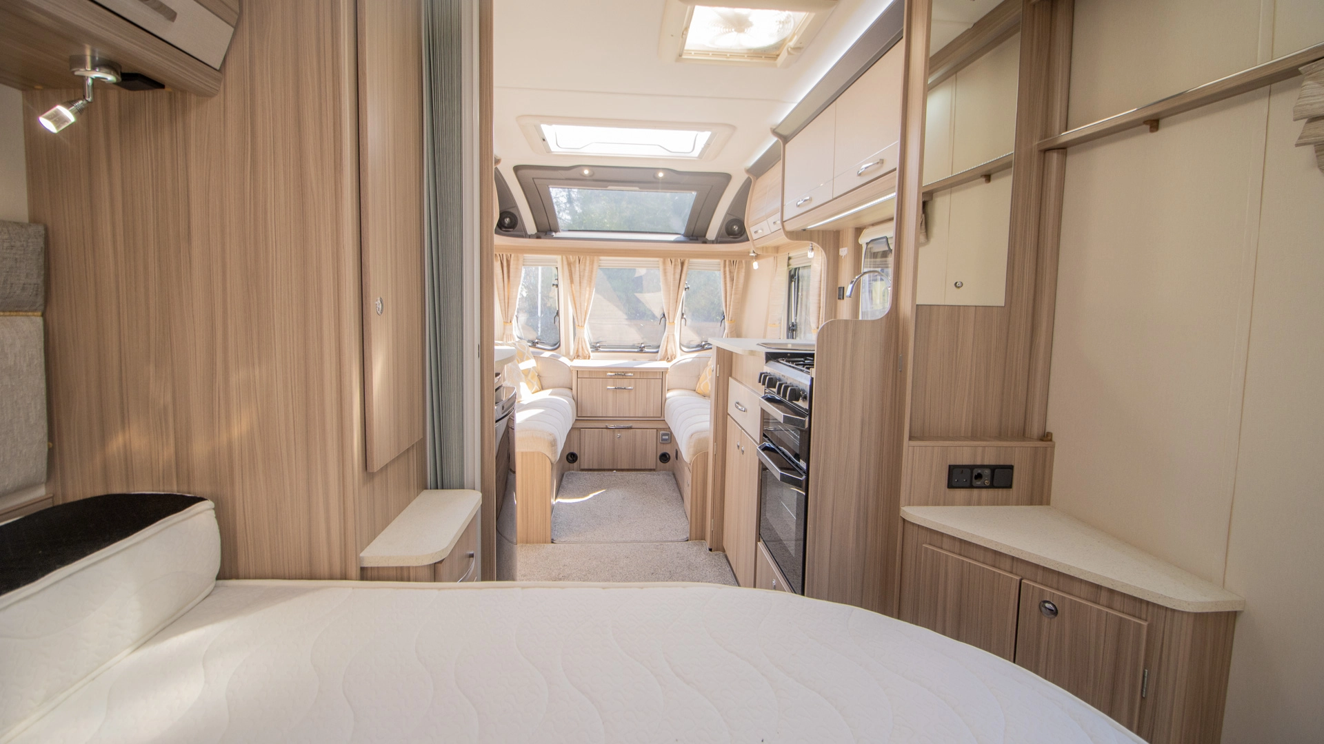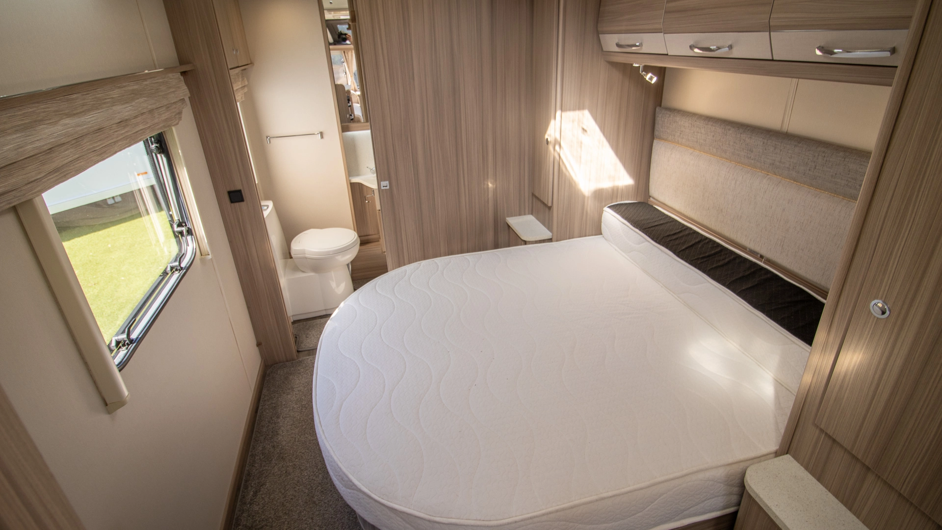 Requiring no nightly bed making, the fixed island bed provides a dedicated sleeping zone with walk‑around access and generous under‑bed storage.