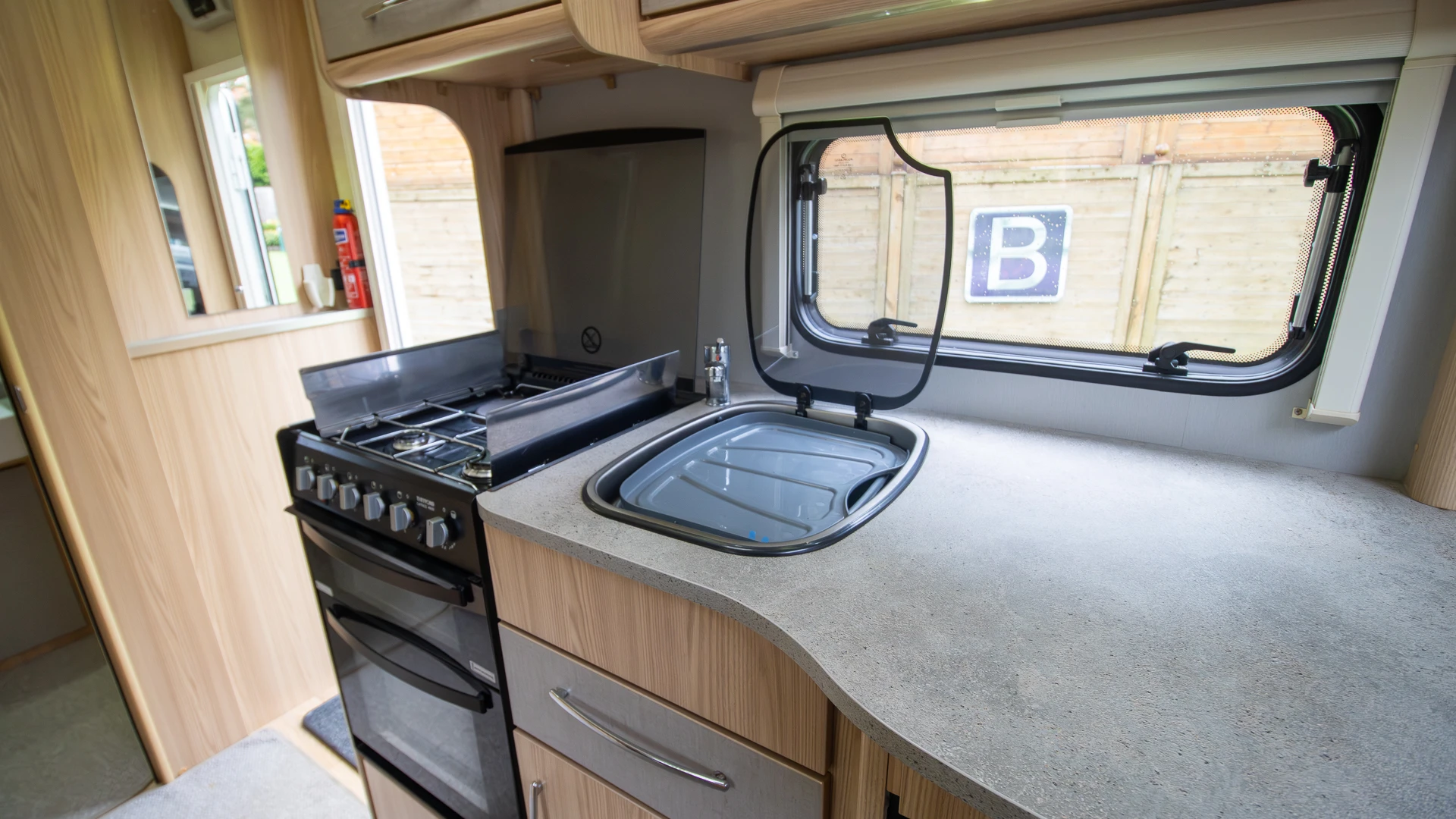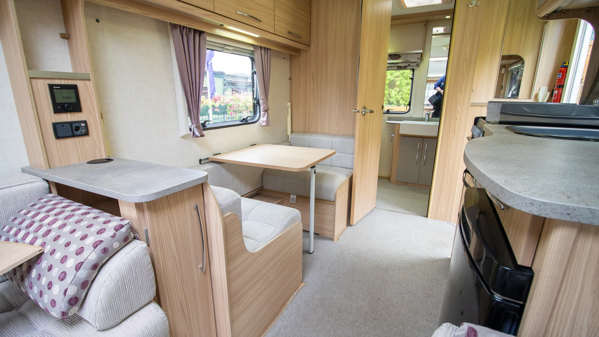 Well-equipped kitchen with extractor fan: Fitted with a dual-fuel hob, oven, grill, microwave and fridge-freezer, the kitchen makes preparing meals simple and enjoyable. The extractor fan helps keep the caravan fresh by removing steam and cooking odours.