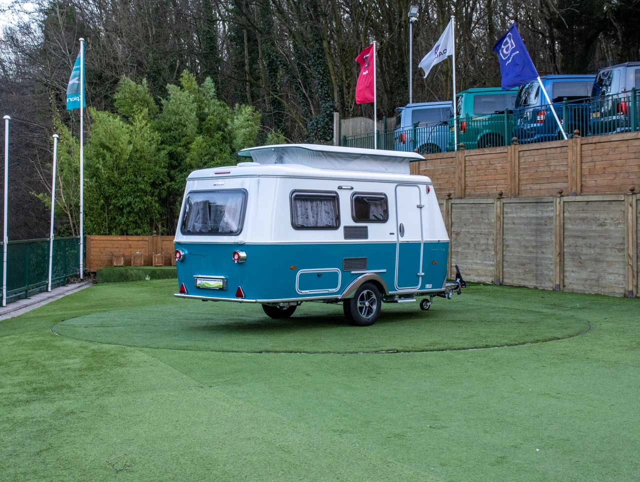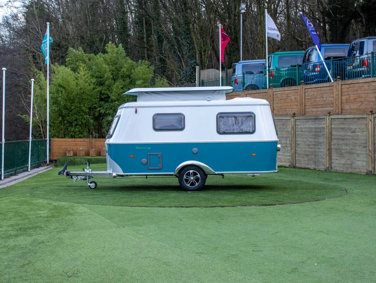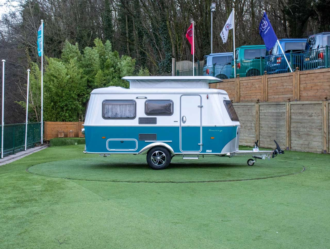 Eriba Touring 430 Urban (Harbour Blue) 2024 - Retro Cool Meets Modern Comfort With its standout Harbour Blue and White two-tone exterior, the Eriba Touring 430 Urban delivers the perfect mix of personality and practicality