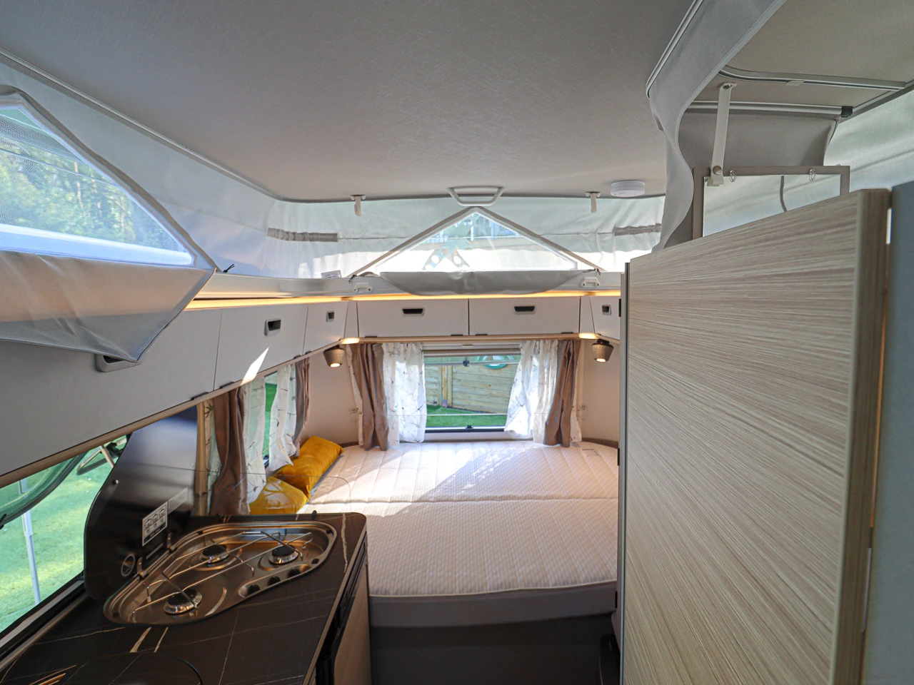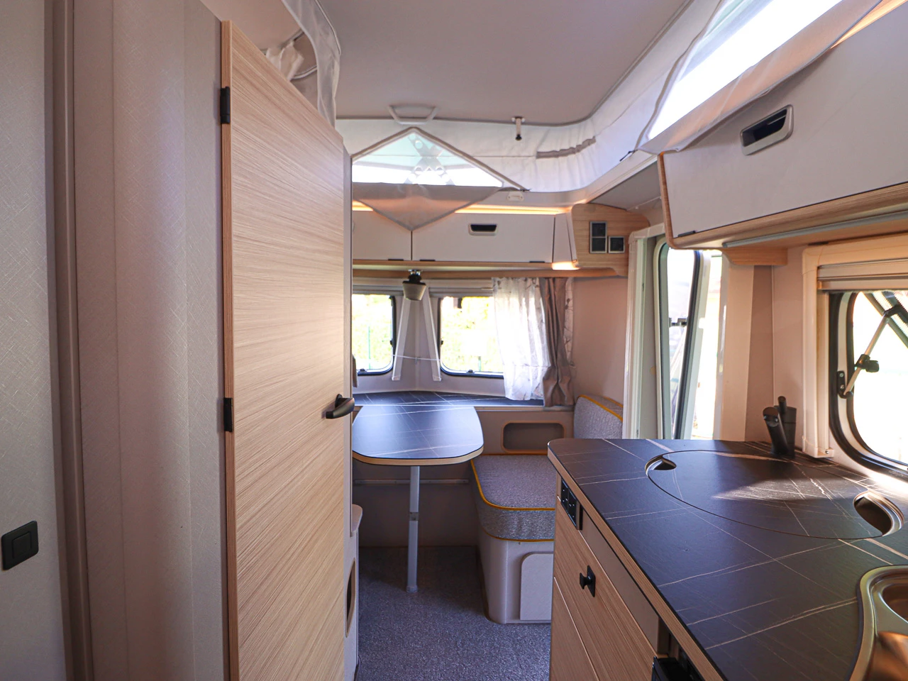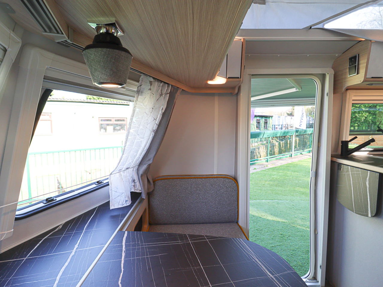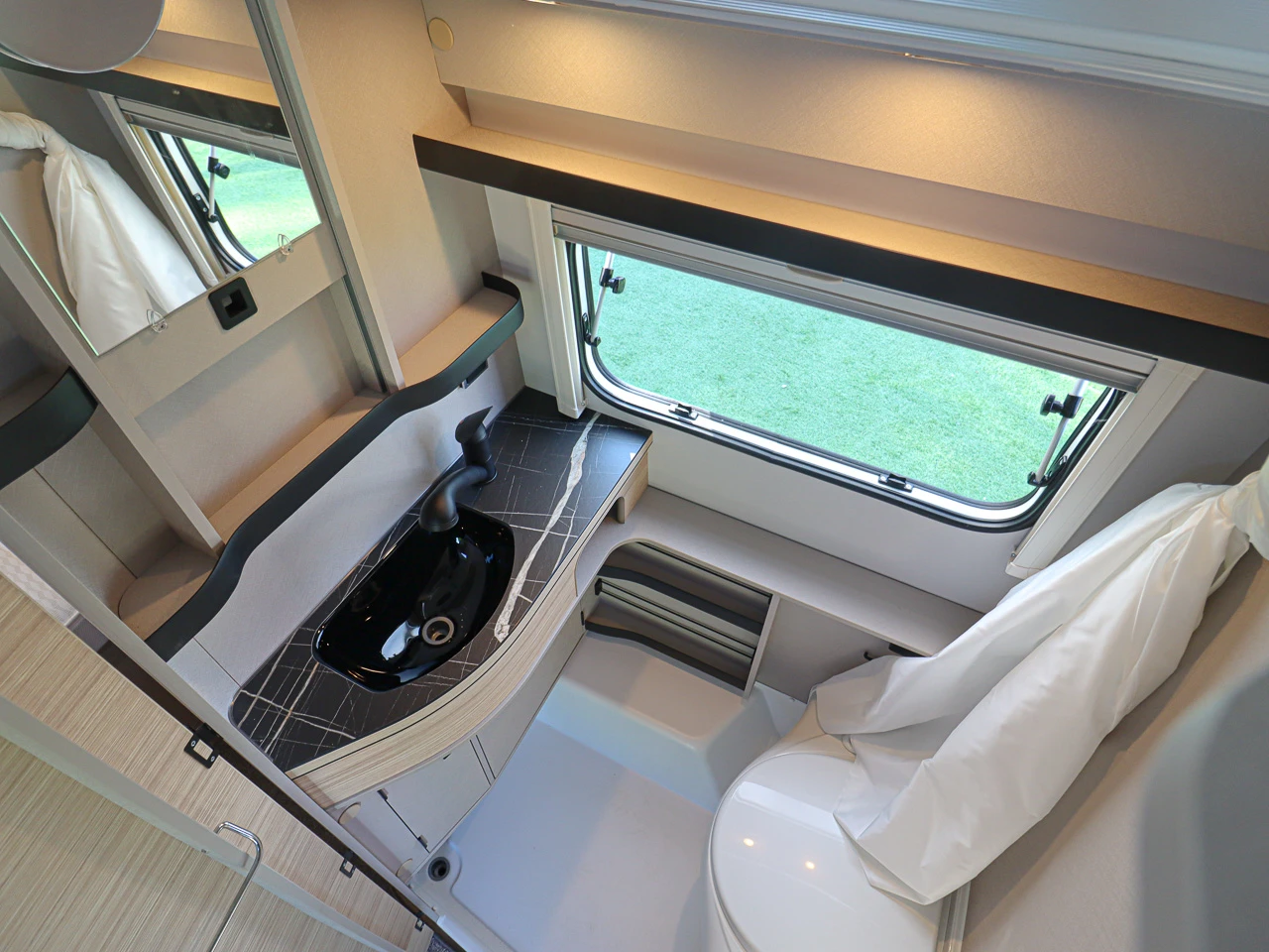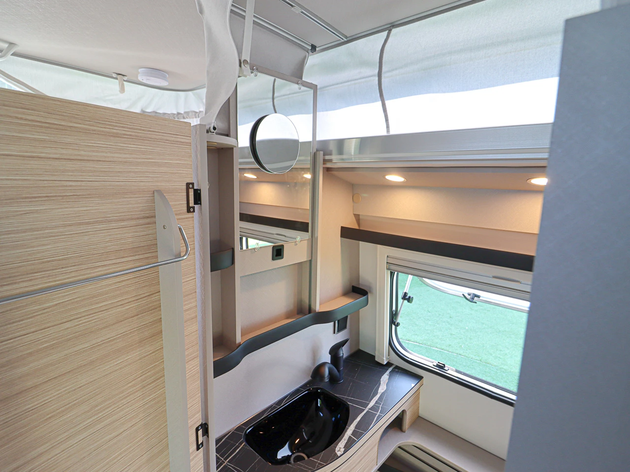 Comfort Package: Sink cover with cutting board, entrance door-integrated waste bin, mosquito net door, extra 230V and twin USB sockets, make-up mirror, and comfort pleated blinds