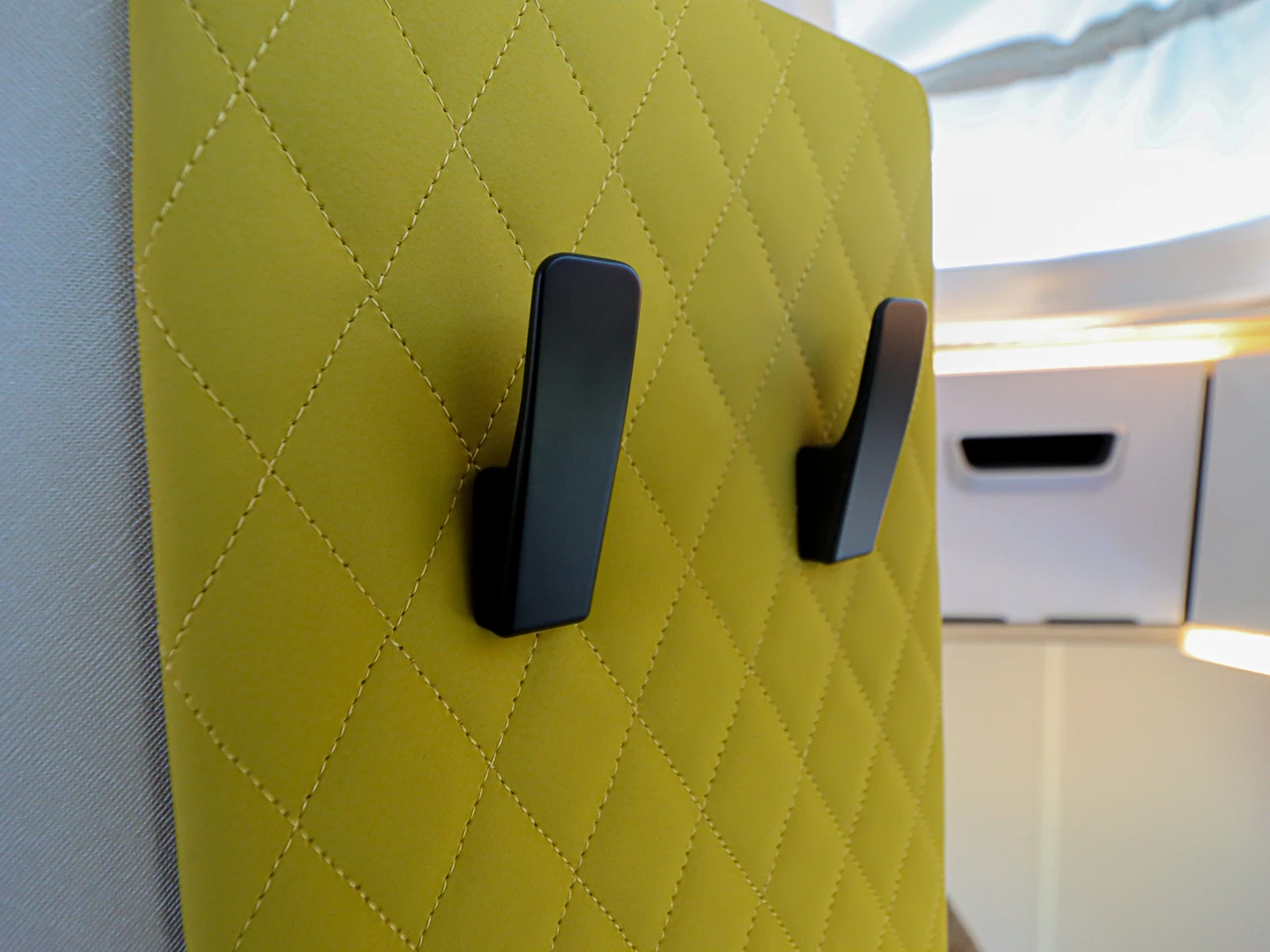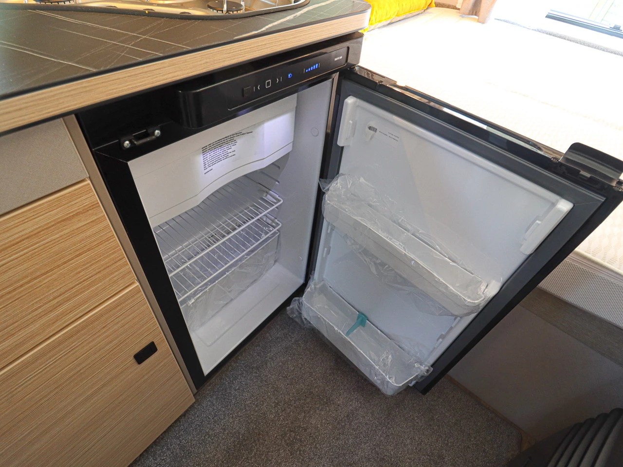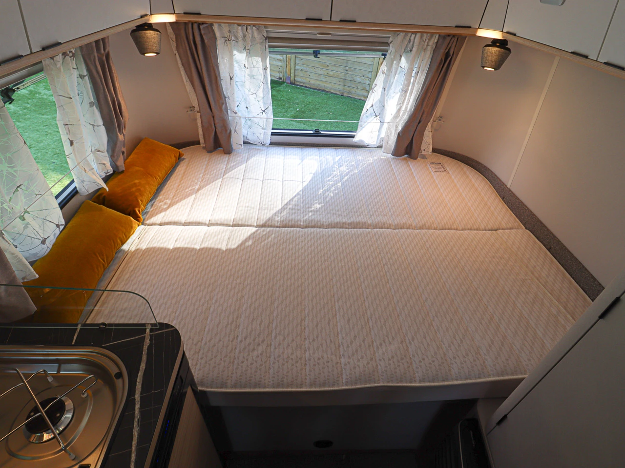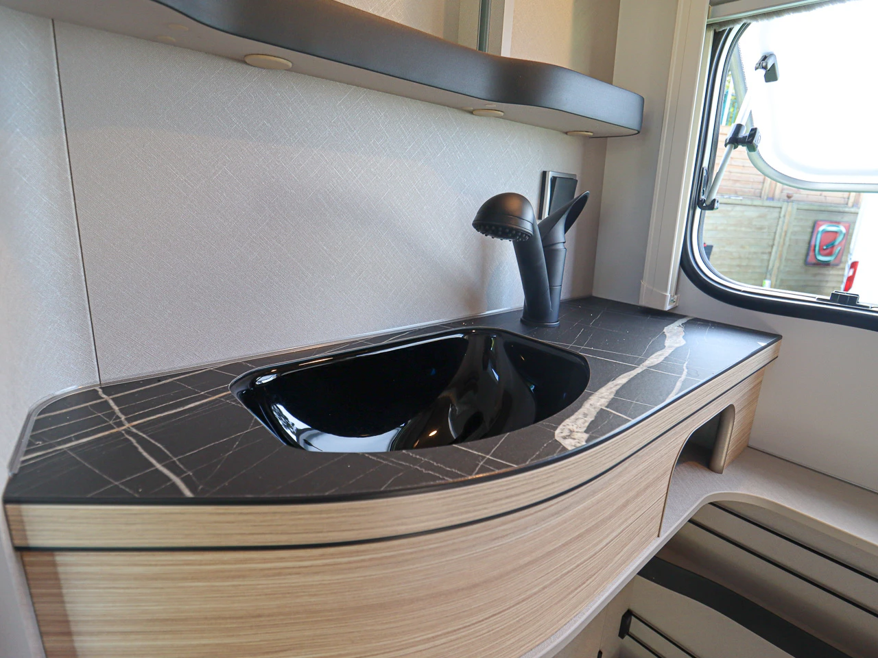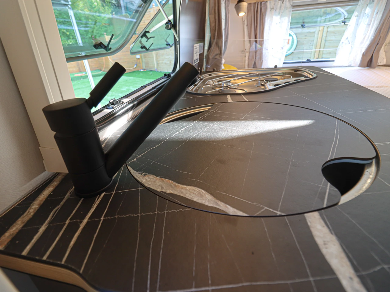 Comfort Package: Sink cover with cutting board, entrance door-integrated waste bin, mosquito net door, extra 230V and twin USB sockets, make-up mirror, and comfort pleated blinds