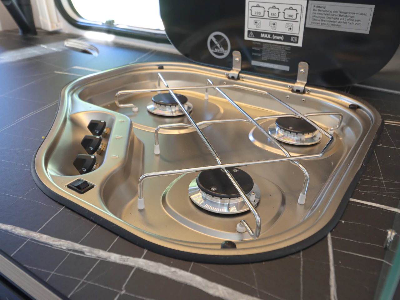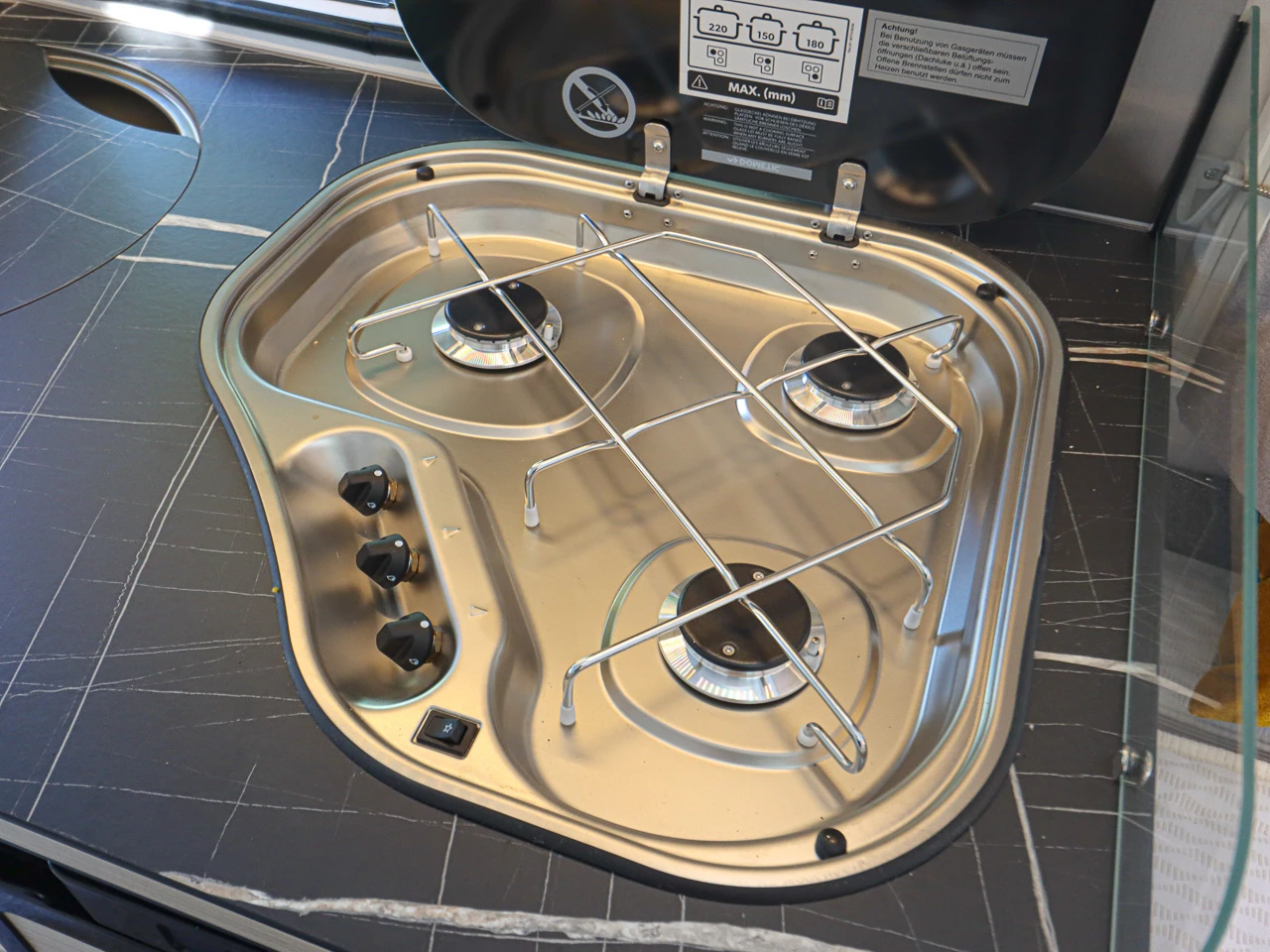 3-burner cooker with electric ignition, flame guard, and safety glass cover