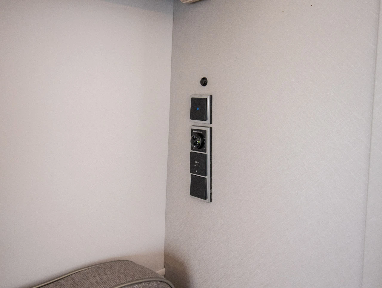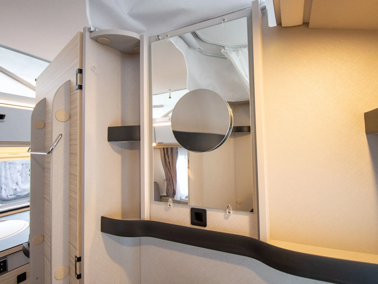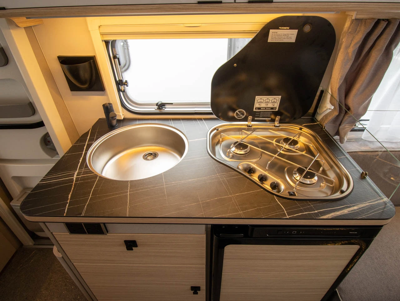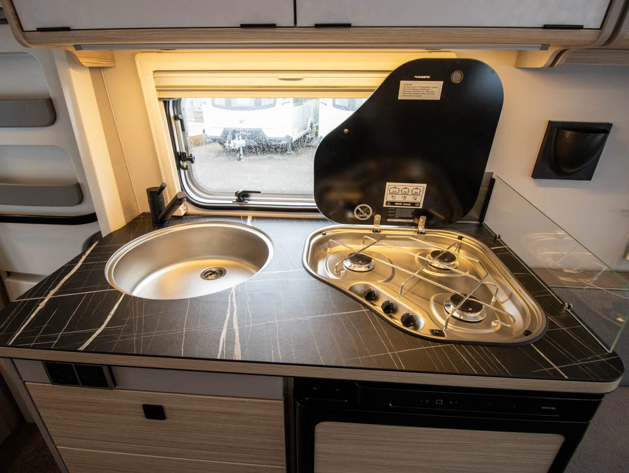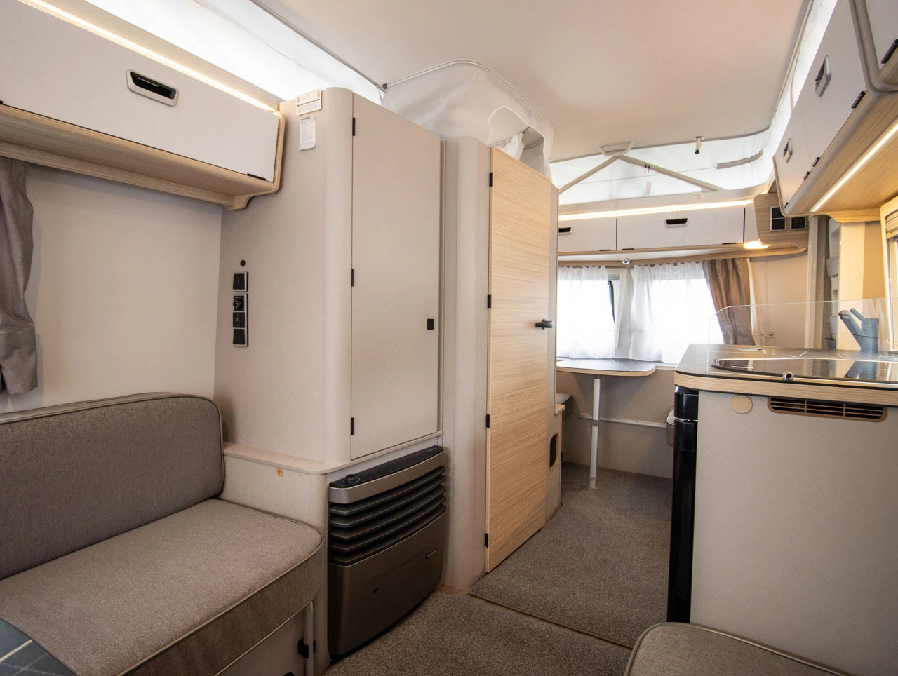 underfloor bracket, lockable Sidewalls, front and rear in smooth White Silver sheet metal Roof awning Thule Omnistor 6300 with integrated LED-lighting and adapter, white housing, 325 x 250 cm (expandable with privacy screen, wind and rain protection) External storage flap, 80 x 29 cm, RH side, rear Shower equipment with shower head and curtain Seating group in the rear with opening window, LH side 3-burner cooker with ignition fuse, electric ignition, flame guard and glass cover External pump Universal awning socket (230 V, 12 V, TV) 30 L freshwater tank with level indicator Electric warm water boiler with 5 l water content (300 W) Electric auxiliary heating for gas heating: Truma Ultraheat (three levels: 500 / 1,000 / 2,000 W) Carpet: Laguna Comfort cushion for front seating group (supplied loose)