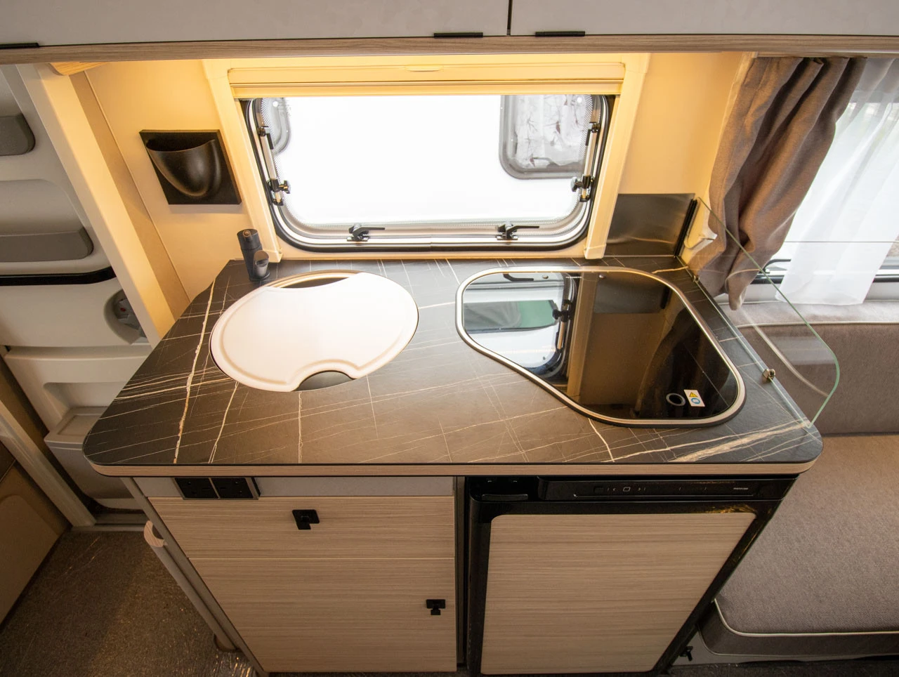 Extras Include: Urban Pack: Sidewalls, front and rear in smooth sheet metal, Colour: White Silver | Ambient light XL with indirect light above the overhead lockers and two additional ERIBA multi functional rechargeable lights | 2 pillows with pillow cases | Furniture finish: Tindari Design Pack 1: Stone Chip Plate | Chrome Package | Aluminium wheels in silver | Bumper Comfort Pack: Sink Colour w/ cutting board | Waste Bin | Screendoor | Socket Package | Makeup Mirror | Window Blind Roller - Remi Base III Autonomy Pack: 95 Ah AGM habitation battery, charger with integrated booster and battery gauge Uprating to 1,400 kg Spare wheel on steel rim incl