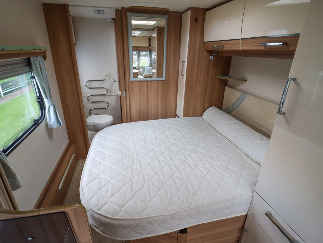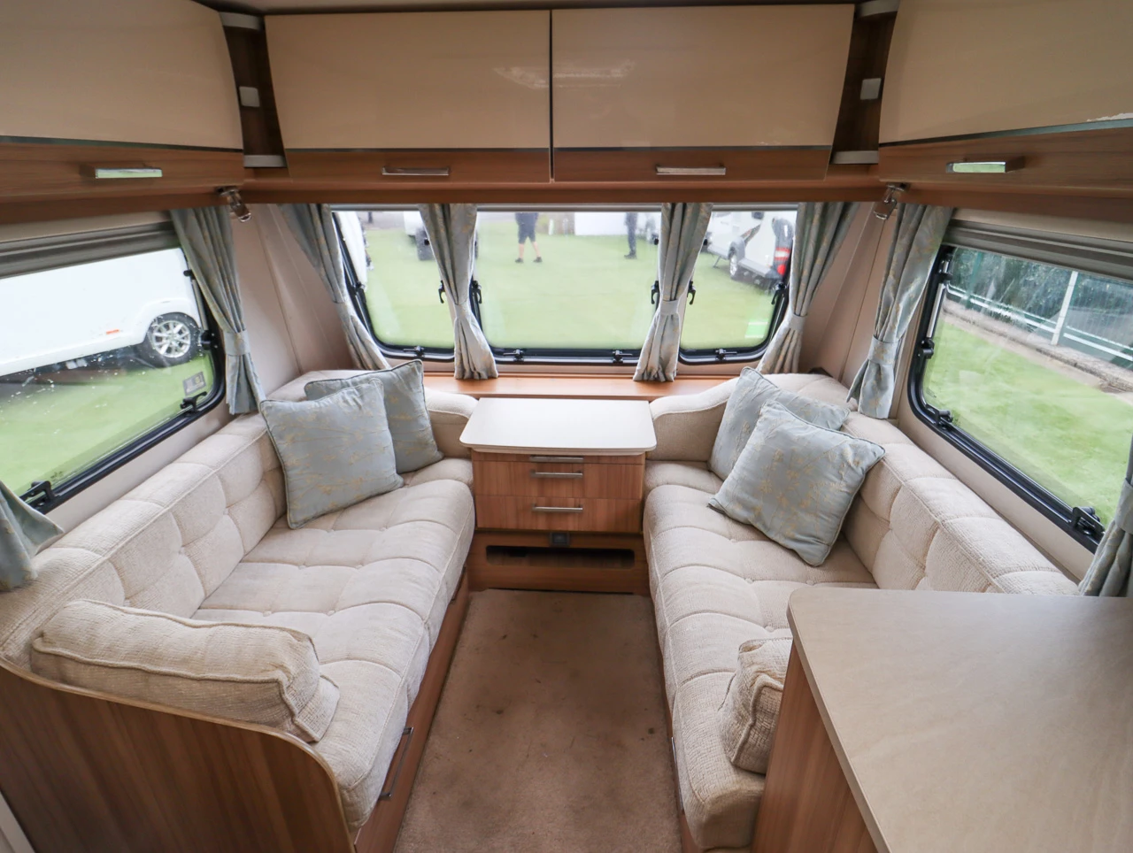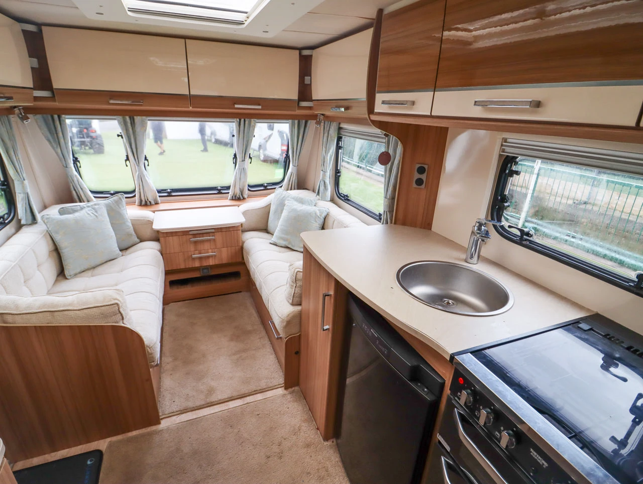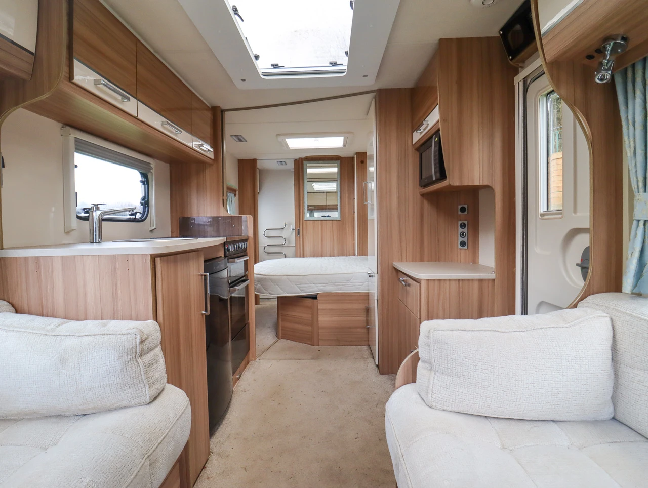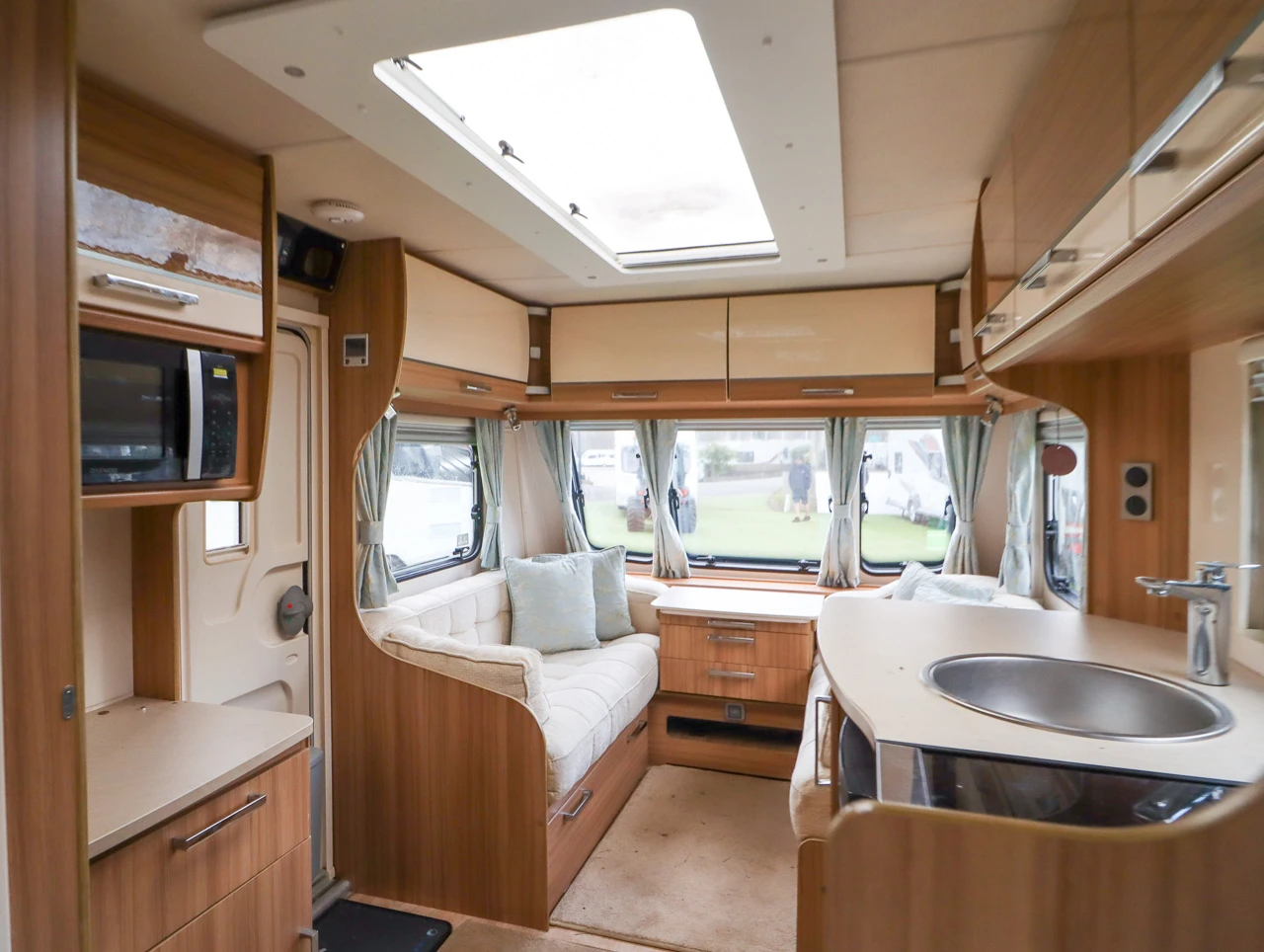 Parallel-seating bed: The front lounge features twin sofas that create a bright and sociable living area. At night, they easily convert into a large double bed, providing flexible sleeping arrangements for guests or family.