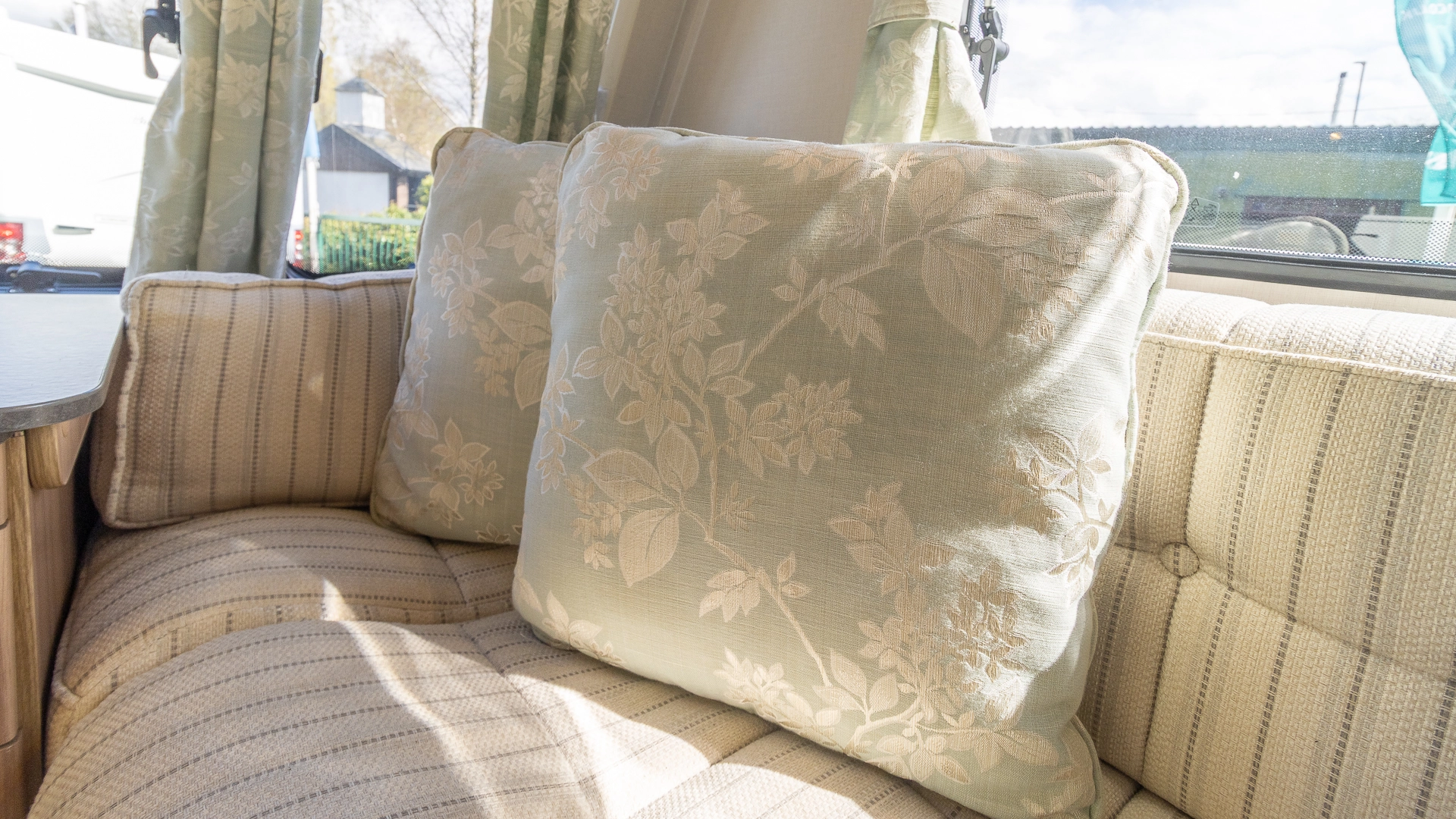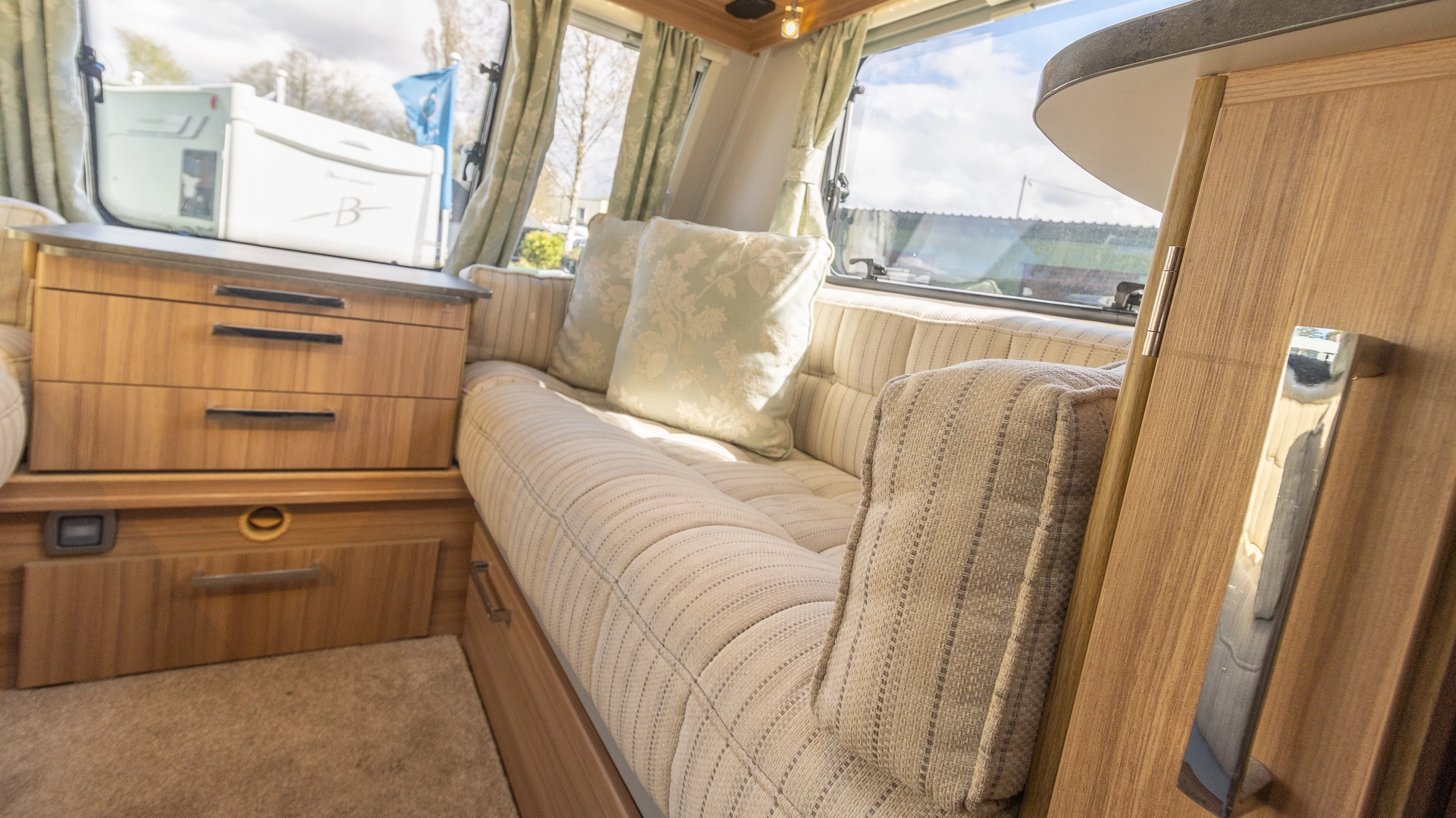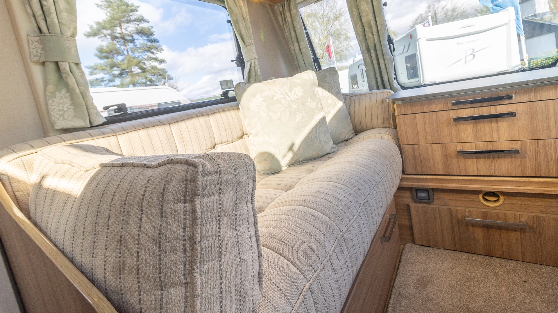 The front lounge features twin sofas that create a bright, sociable living area during the day, and can convert into a comfortable double bed at night.