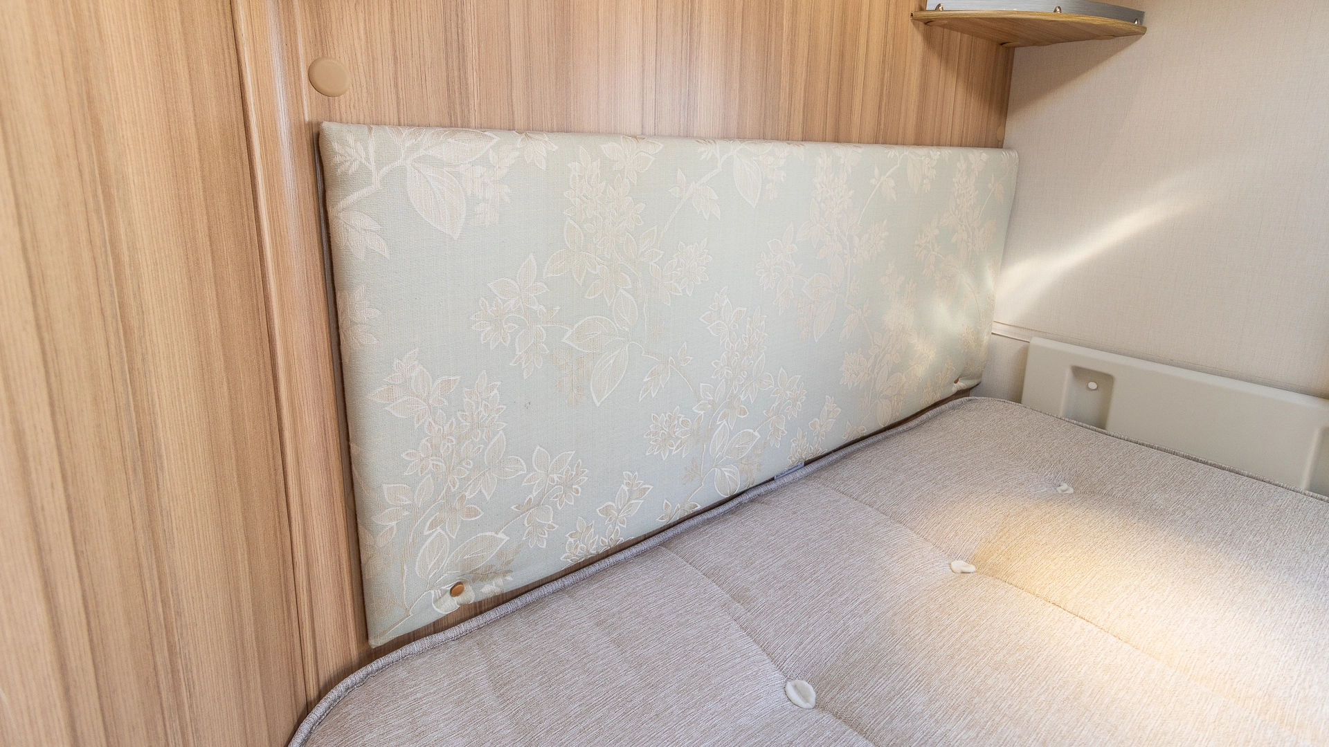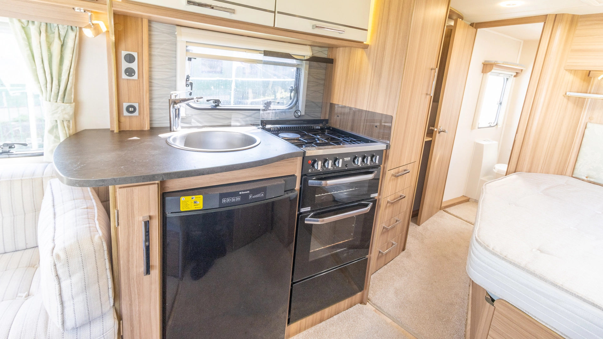 The fixed French bed provides a dedicated sleeping zone with generous under‑bed storage, requiring no nightly bed-making after a long day of holidaying.