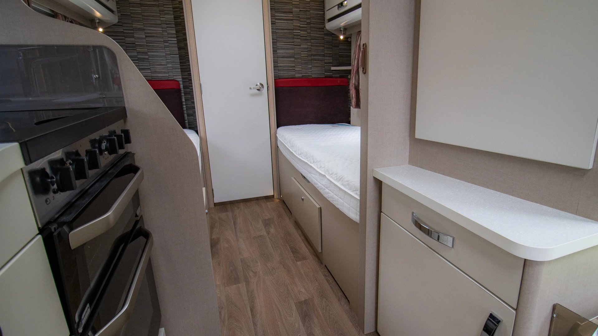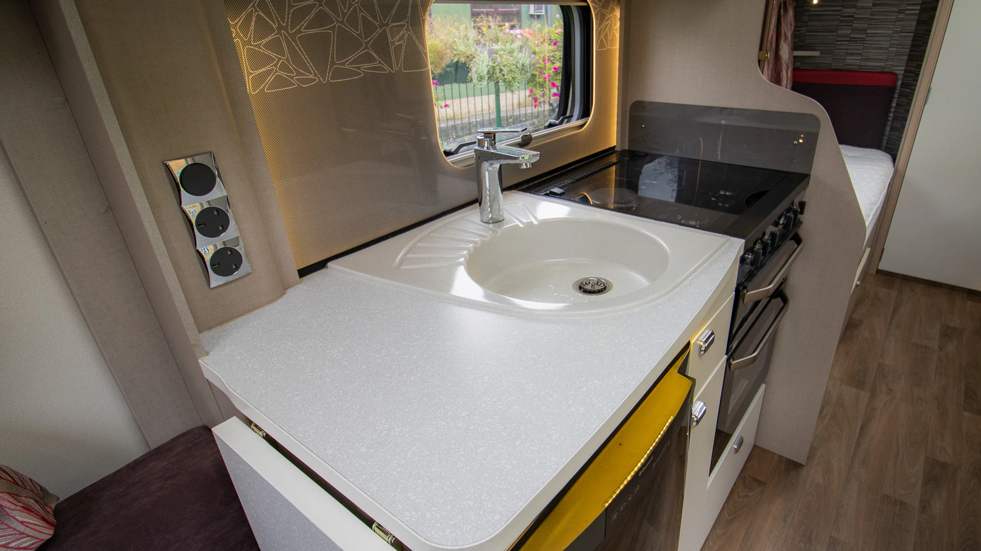 Well Equipped Kitchen with Extractor Fan: The kitchen is fully equipped with modern appliances and features an extractor fan, ensuring an enjoyable cooking experience while on the road