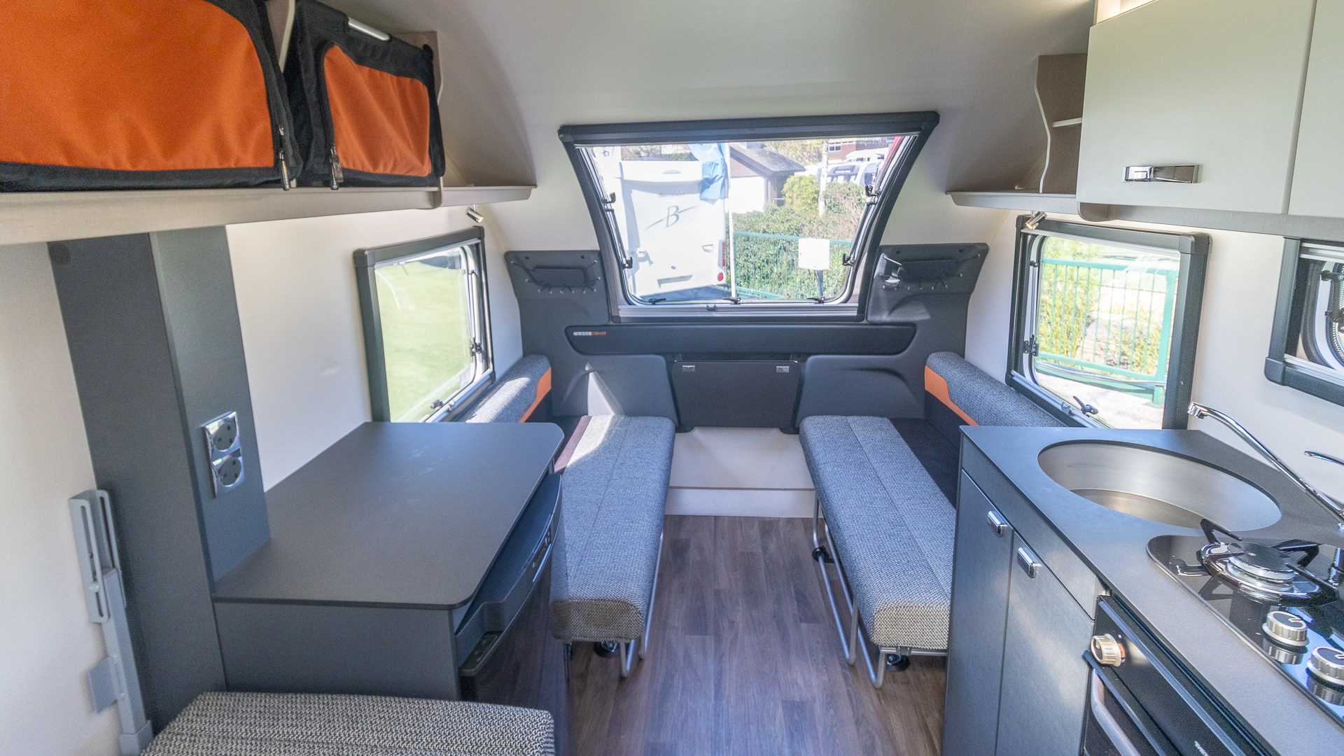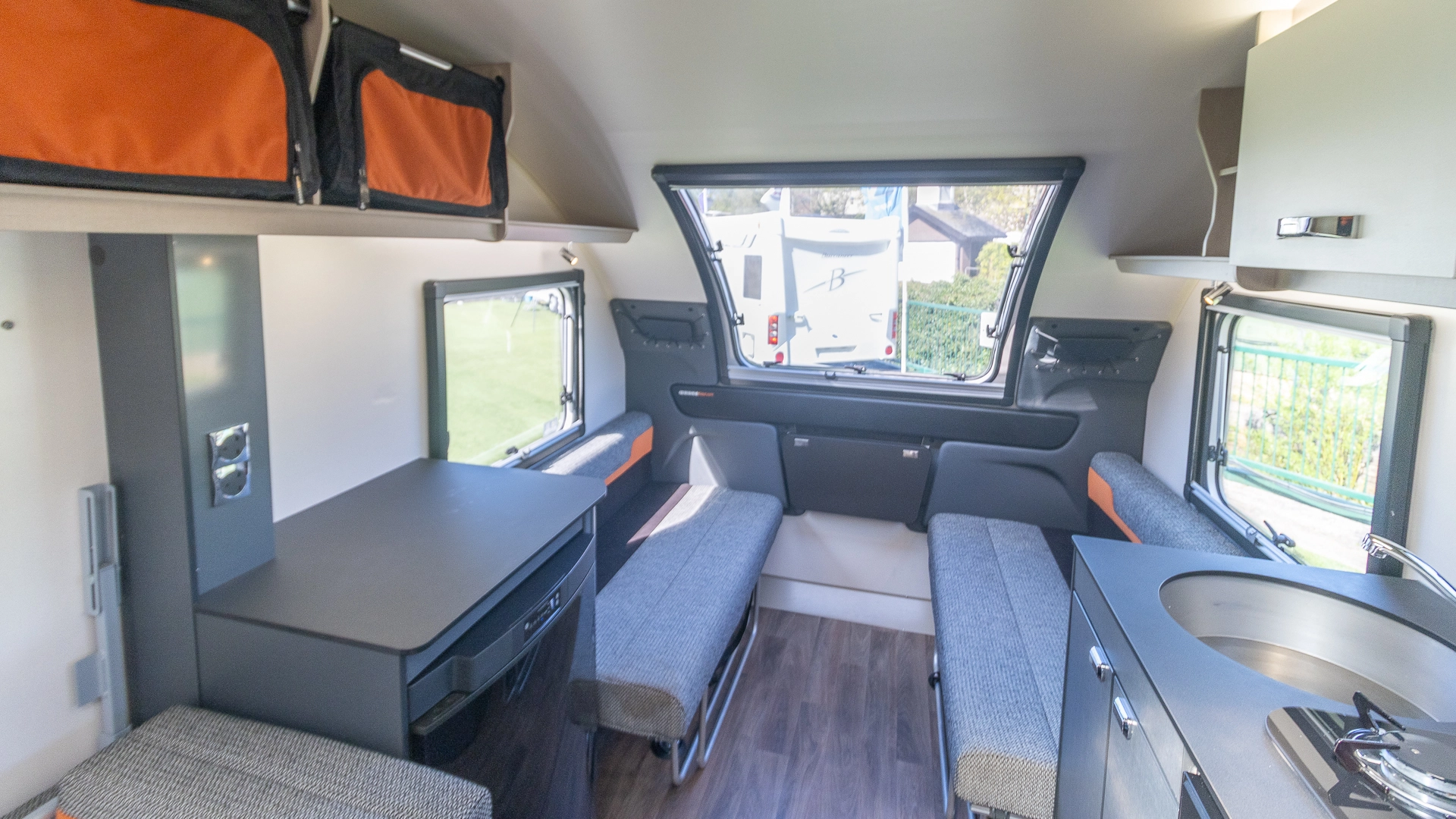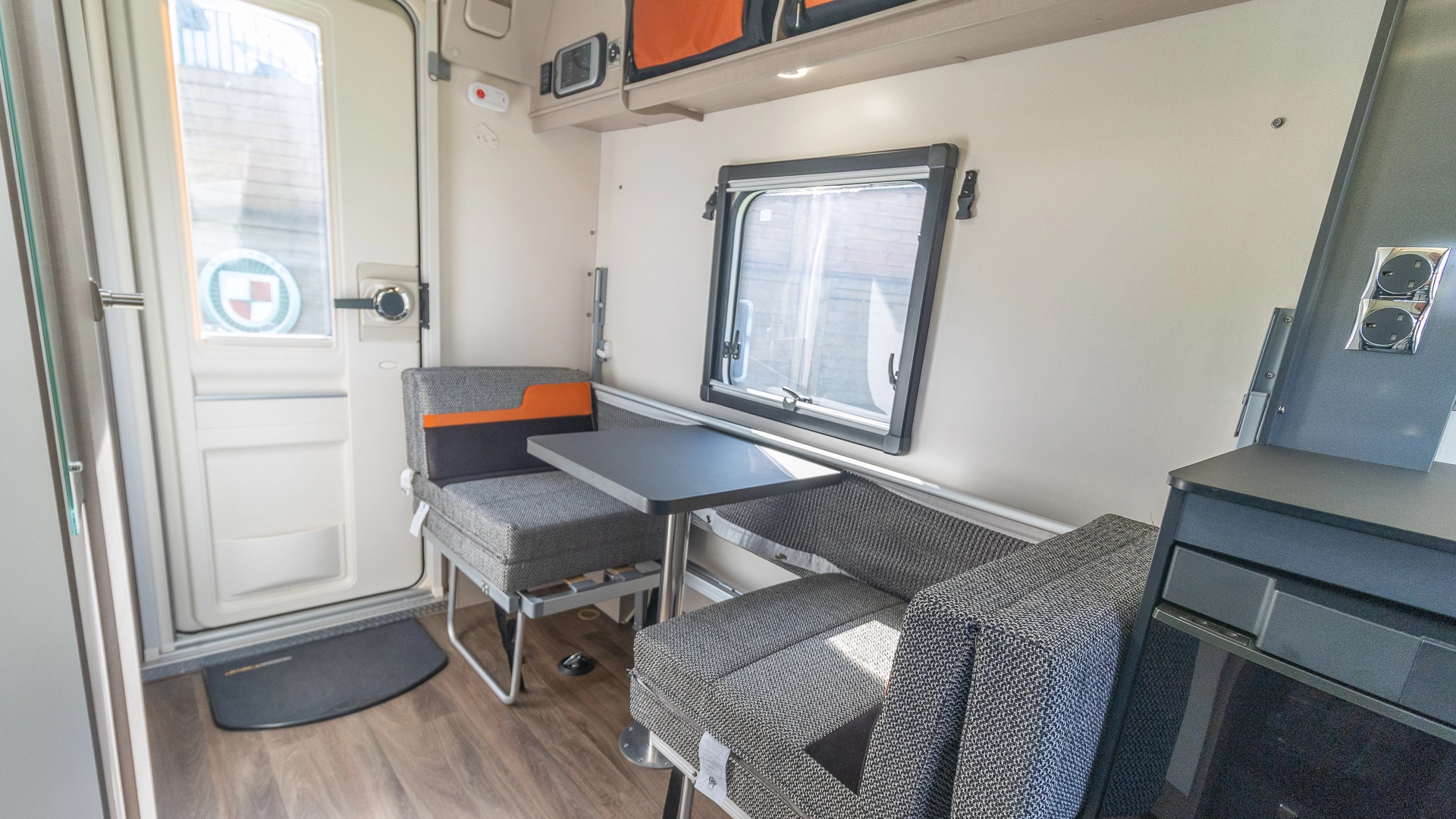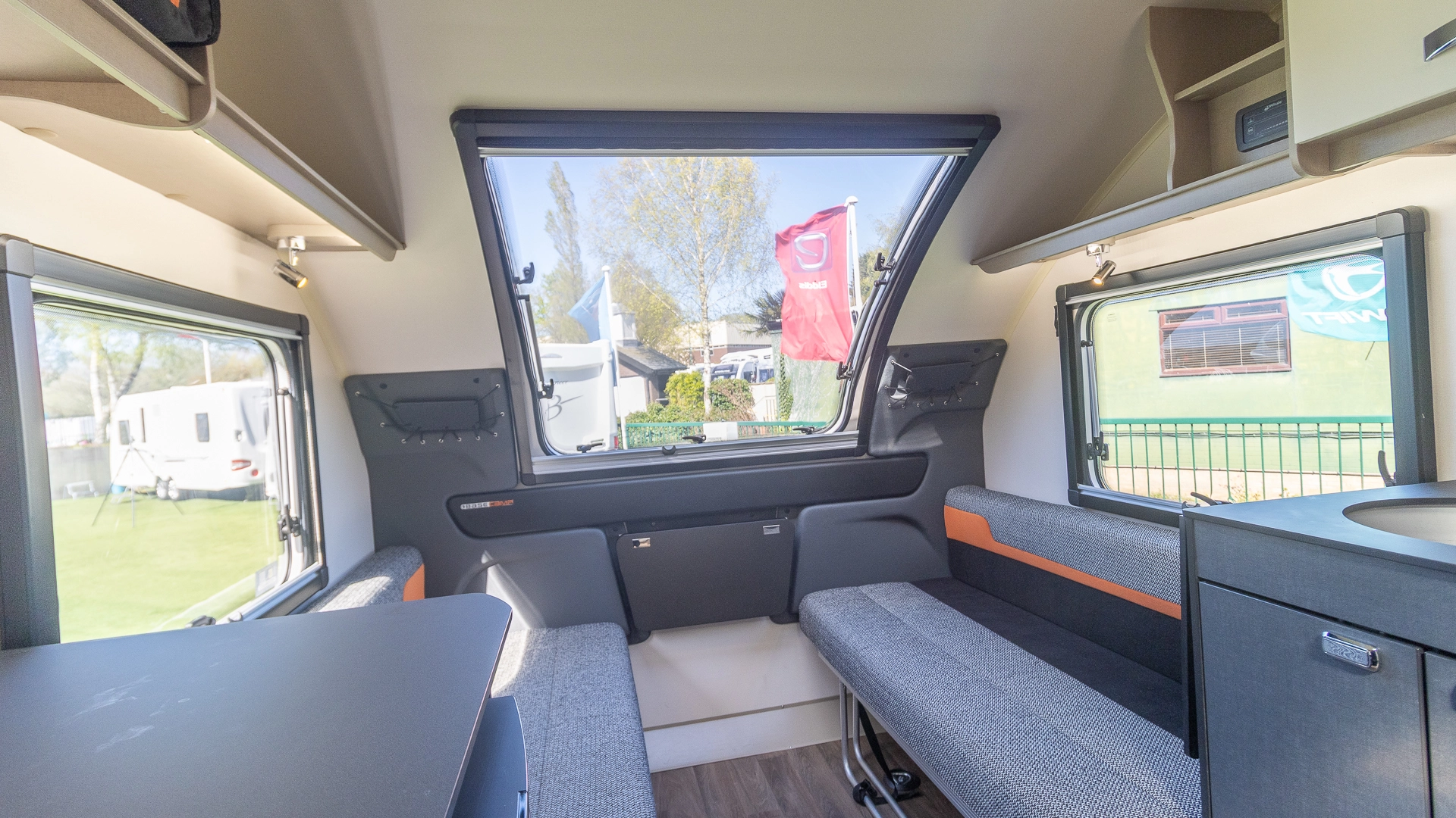 The front lounge features twin sofas that create a bright, sociable living area during the day, and can convert into a comfortable double bed at night.
