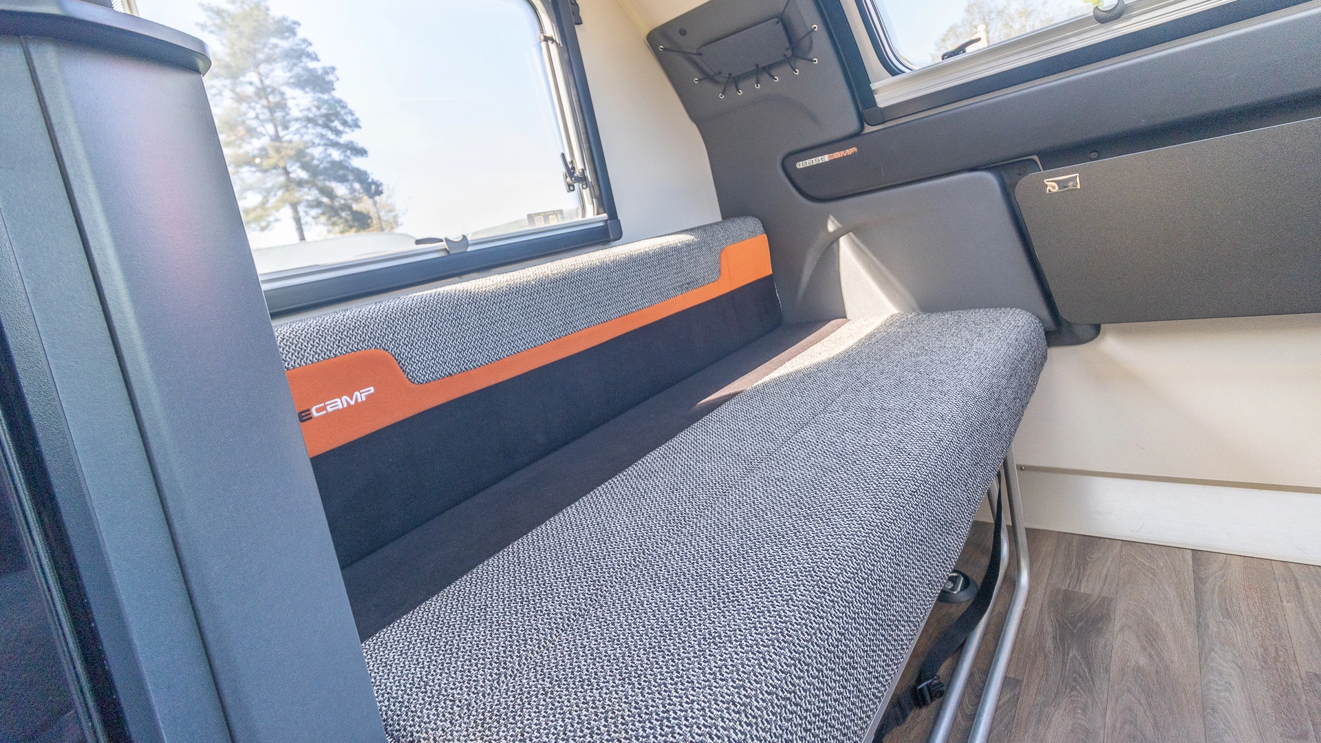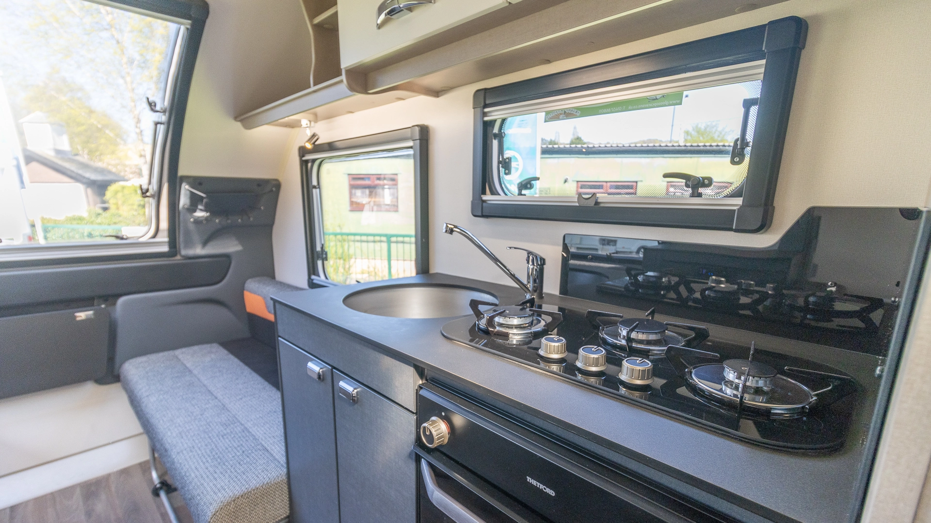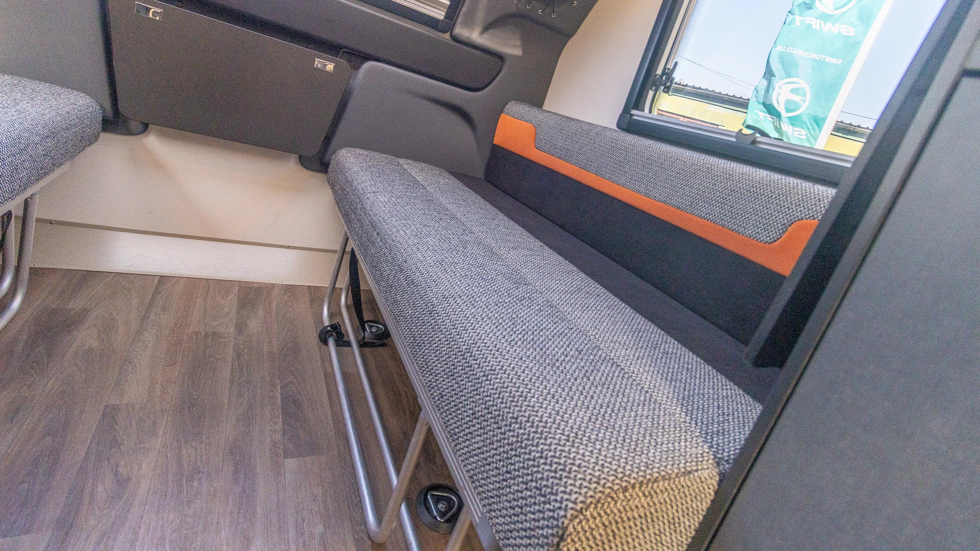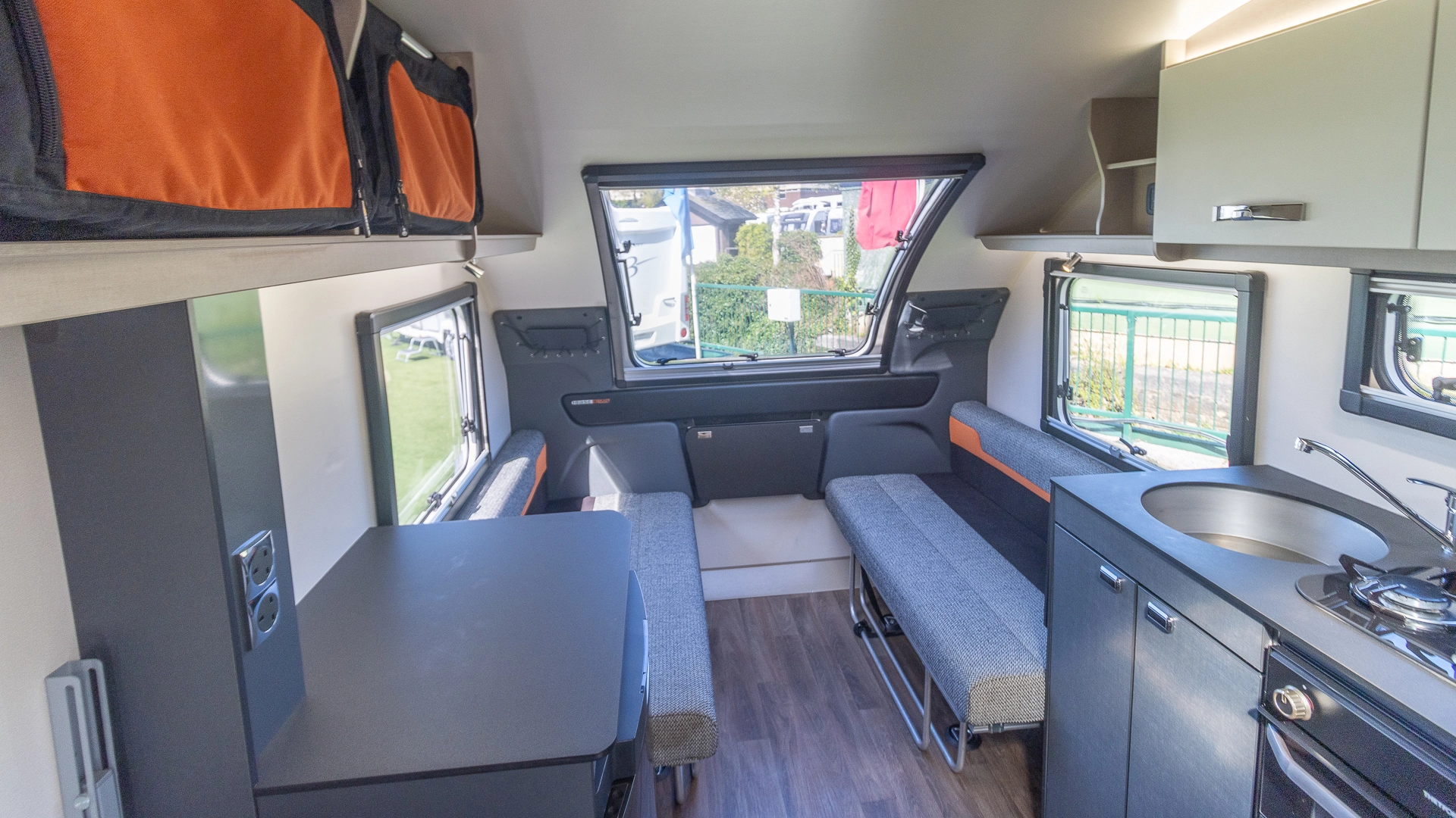 The front lounge features twin sofas that create a bright, sociable living area during the day, and can convert into a comfortable double bed at night.