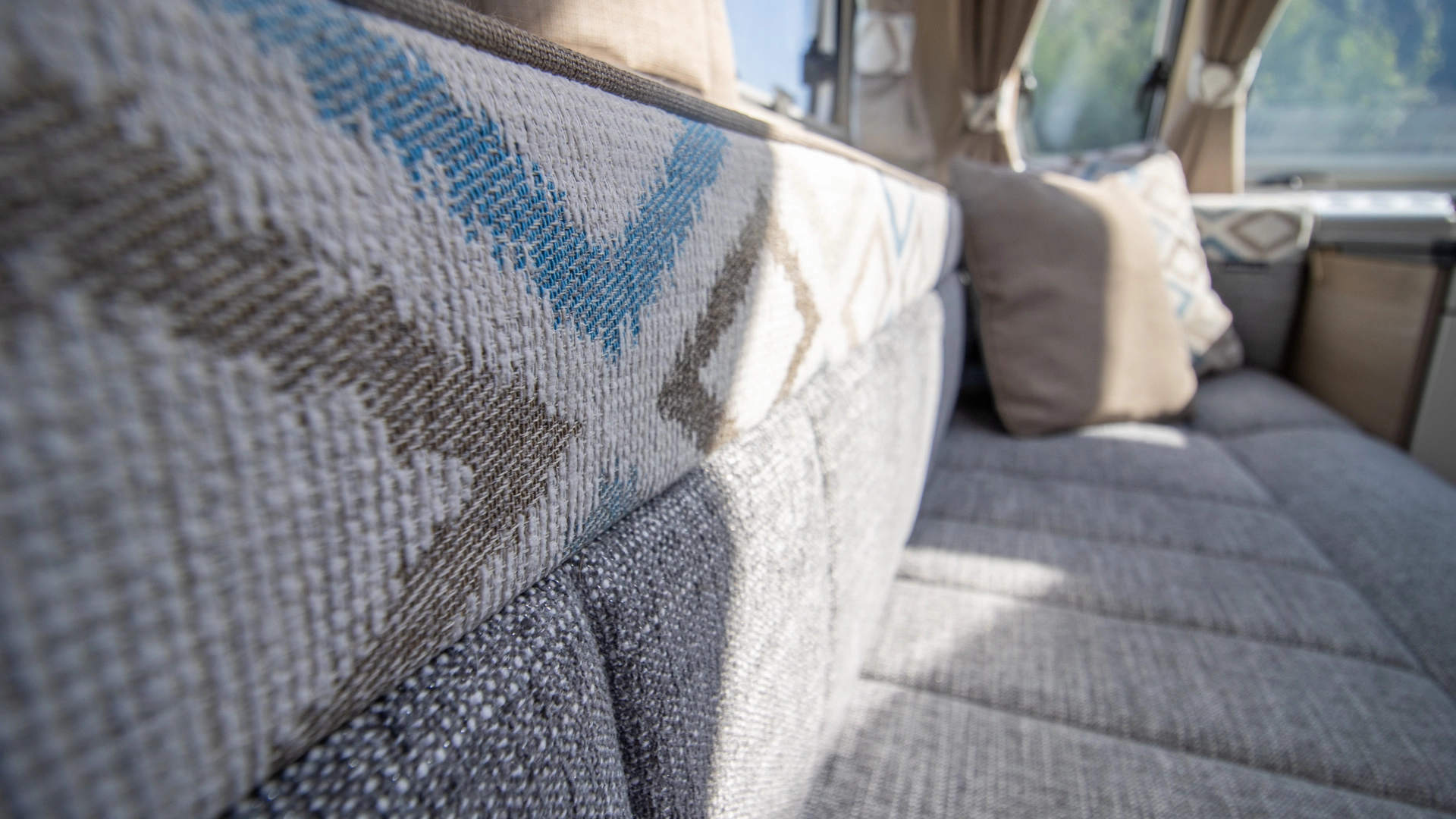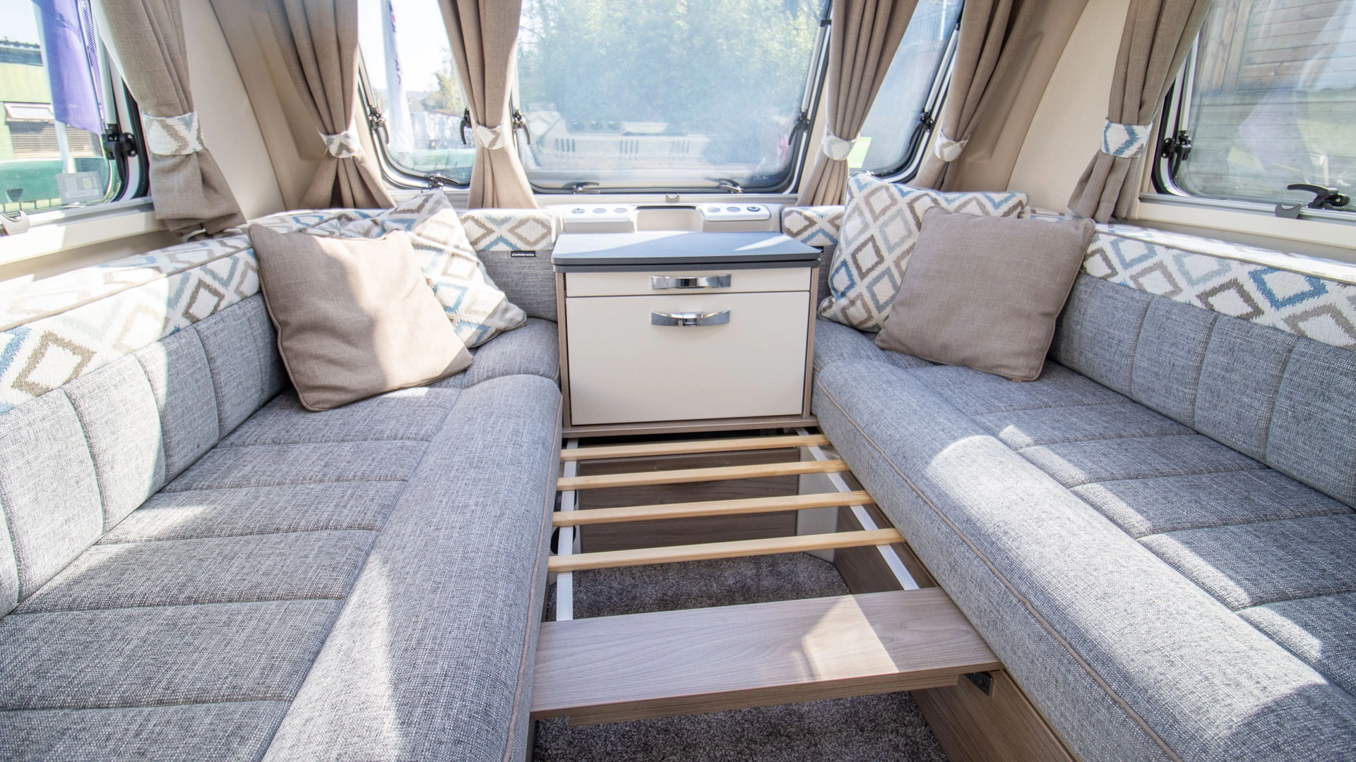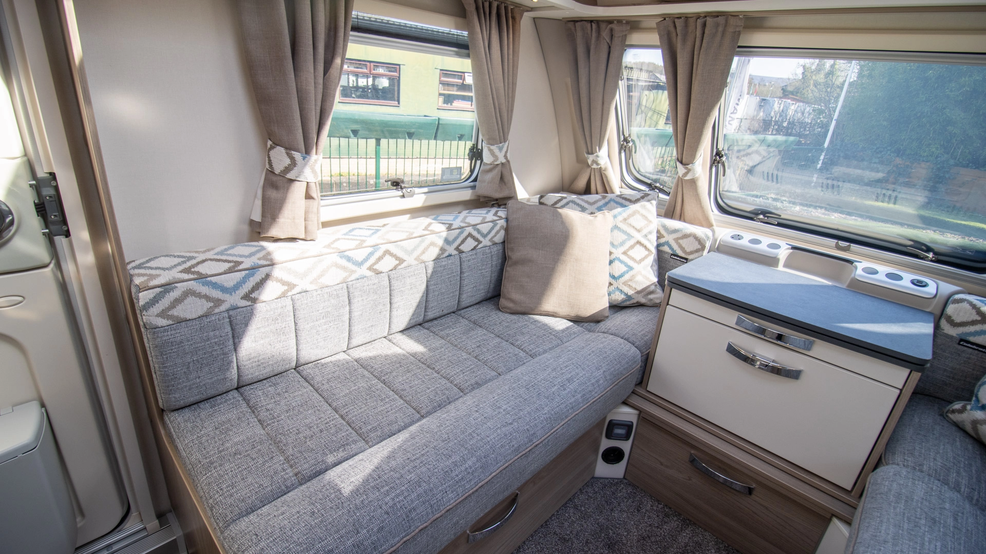 The front lounge features twin sofas that create a bright, sociable living area during the day, and can convert into a comfortable double bed at night.