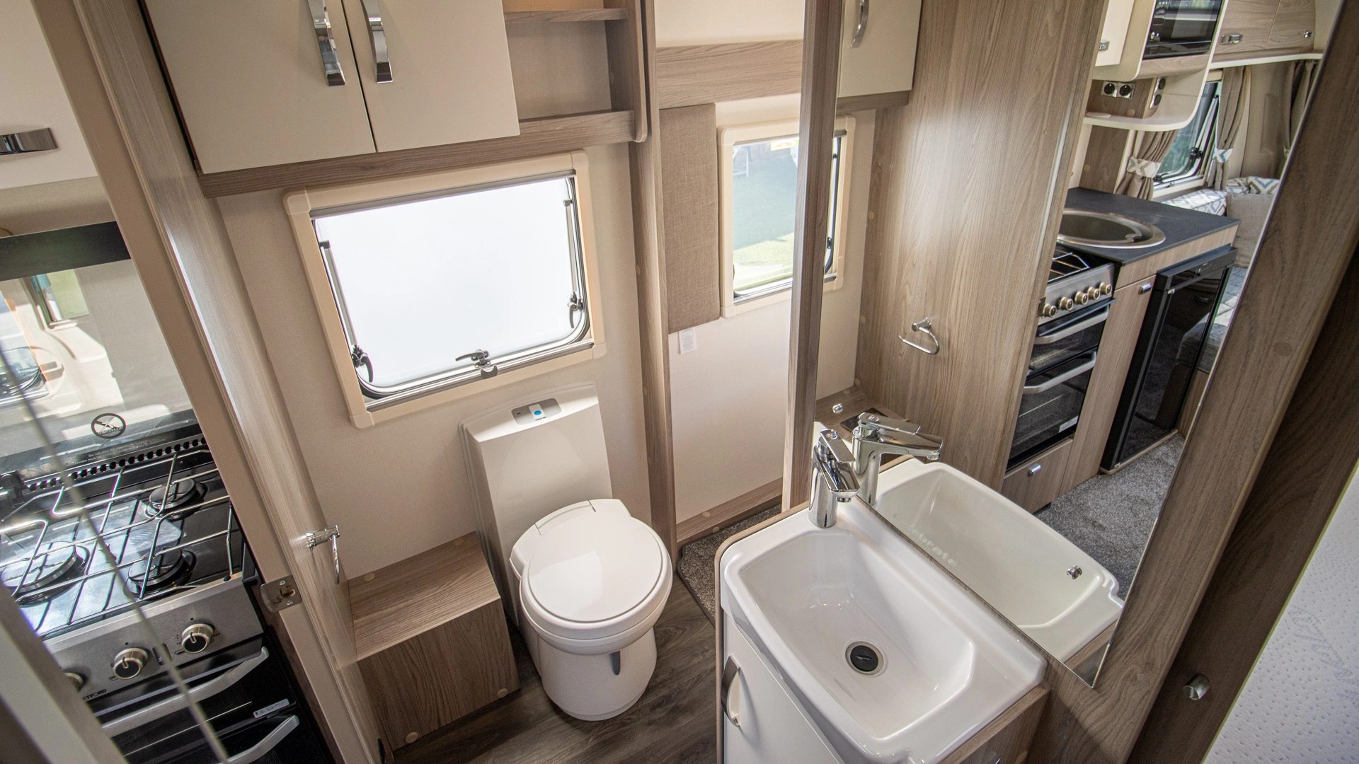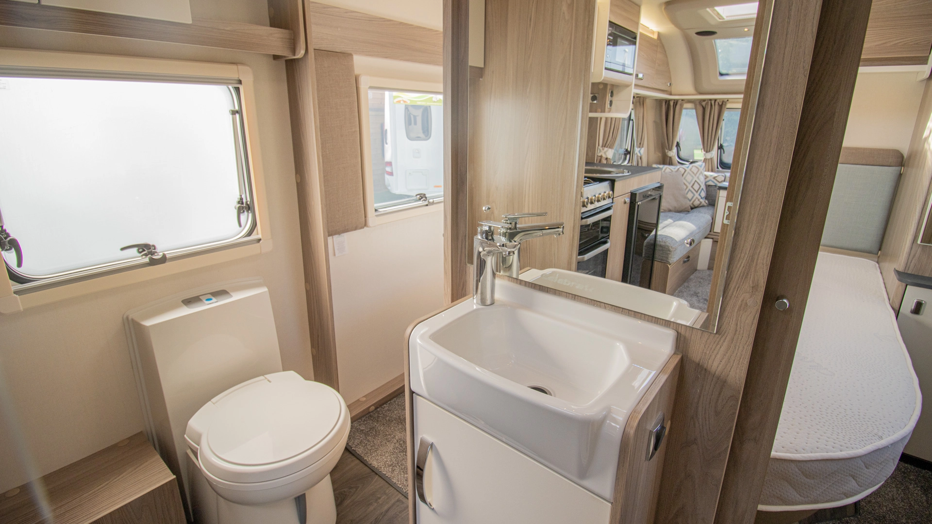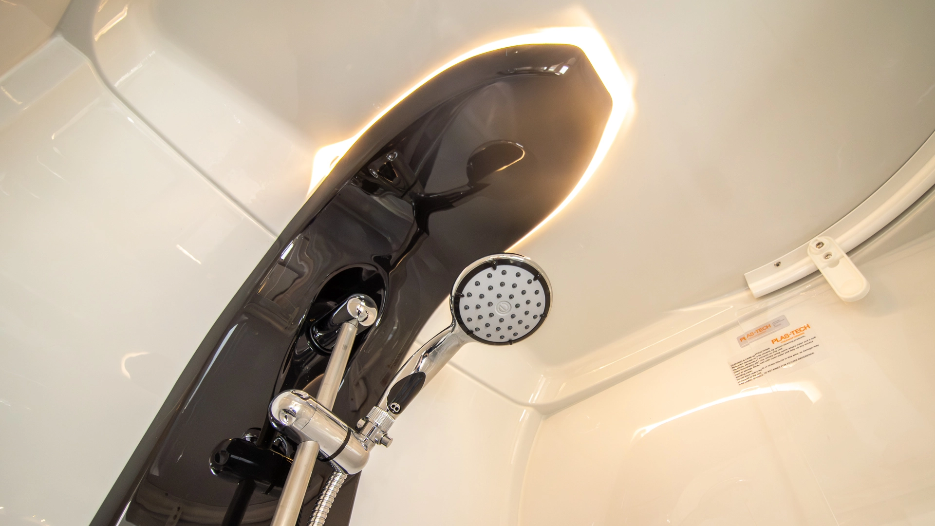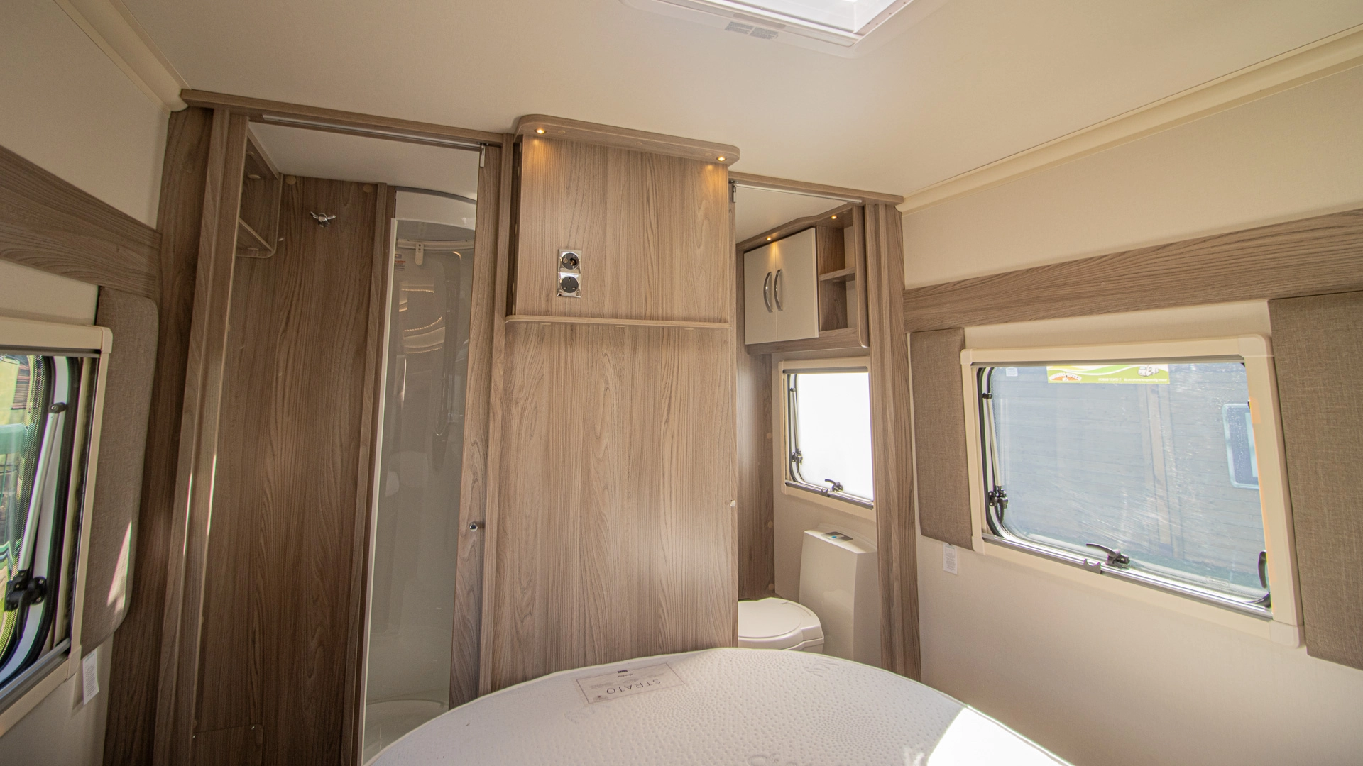 The centre washroom features a dedicated shower, toilet and basin while separating the living and sleeping areas, offering both convenience and privacy.
