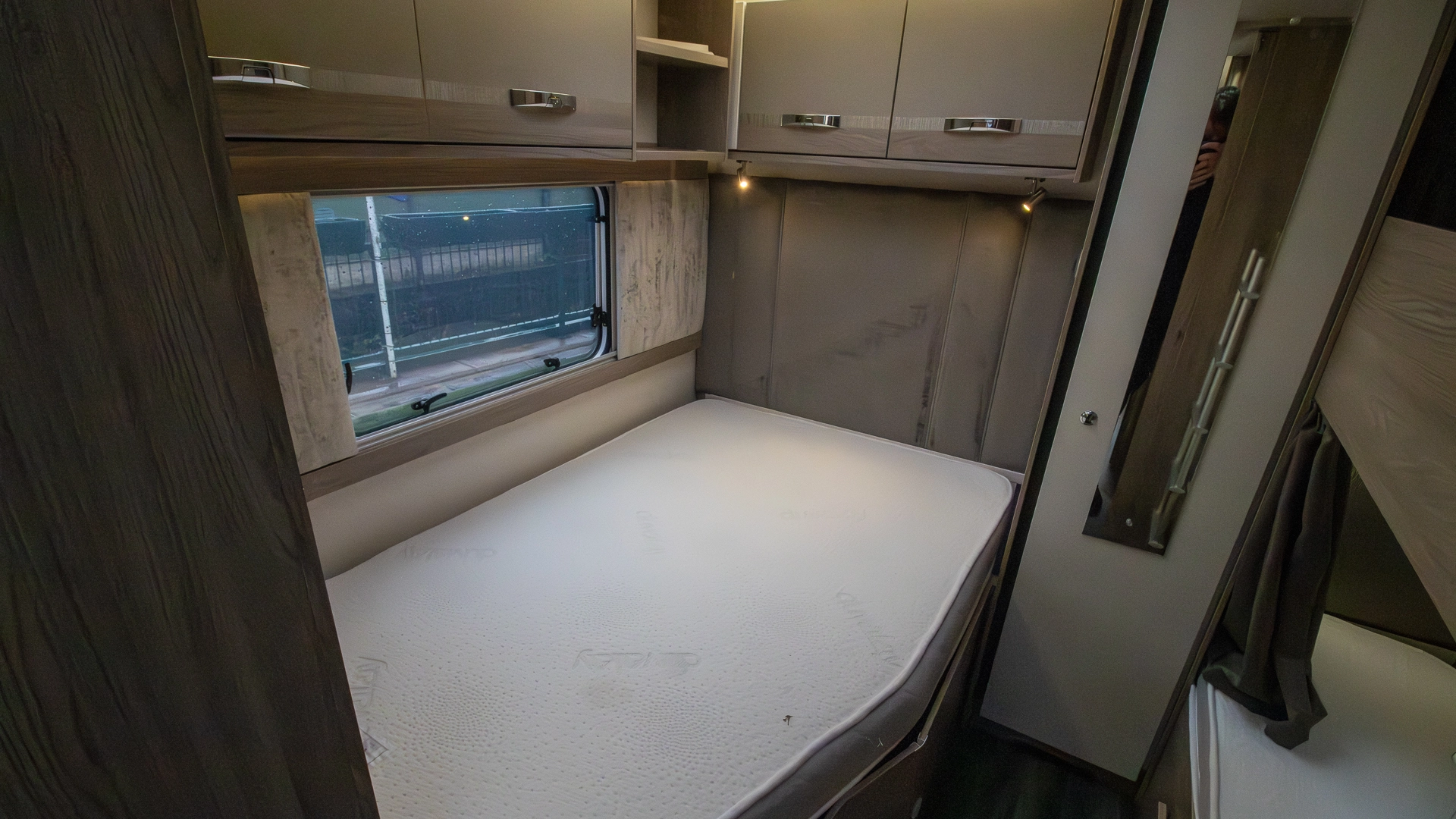 At the rear of the caravan is a fixed French bed with walk‑around access and generous under‑bed storage, eliminating the need for nightly bed conversions at the end of the day.