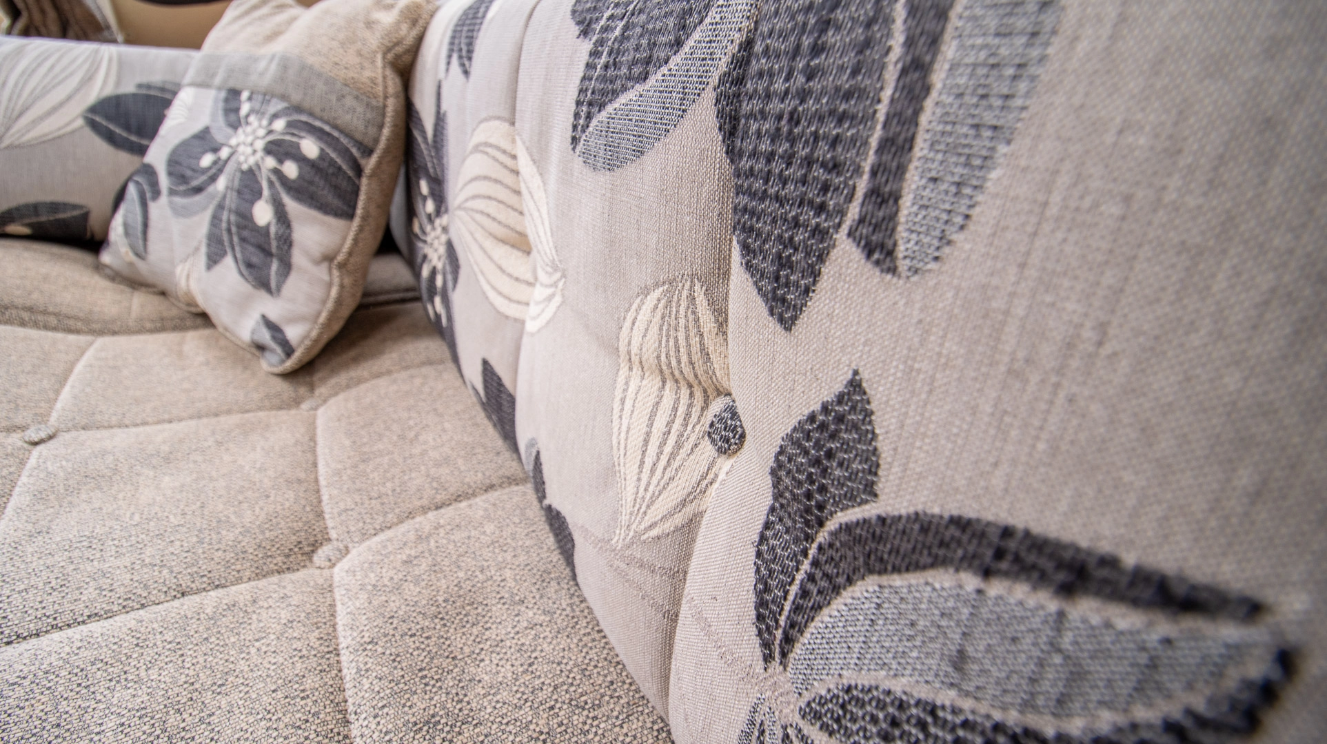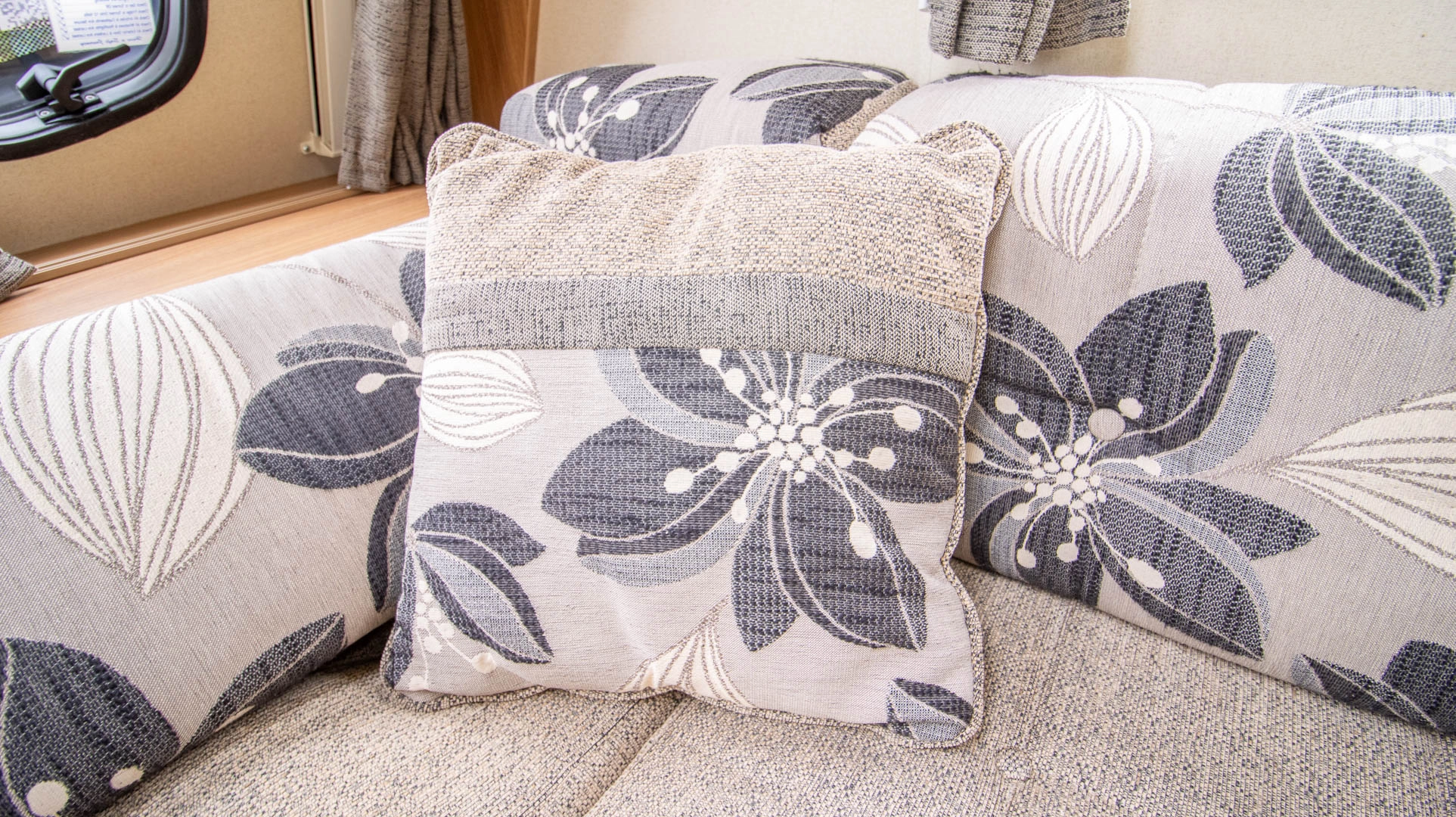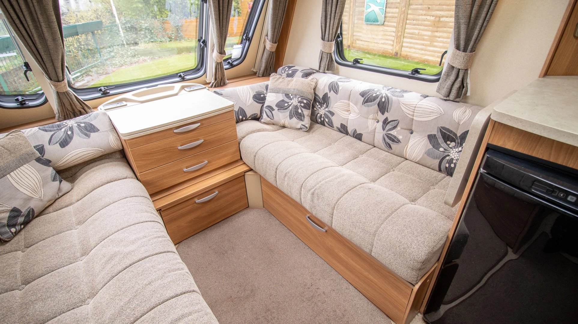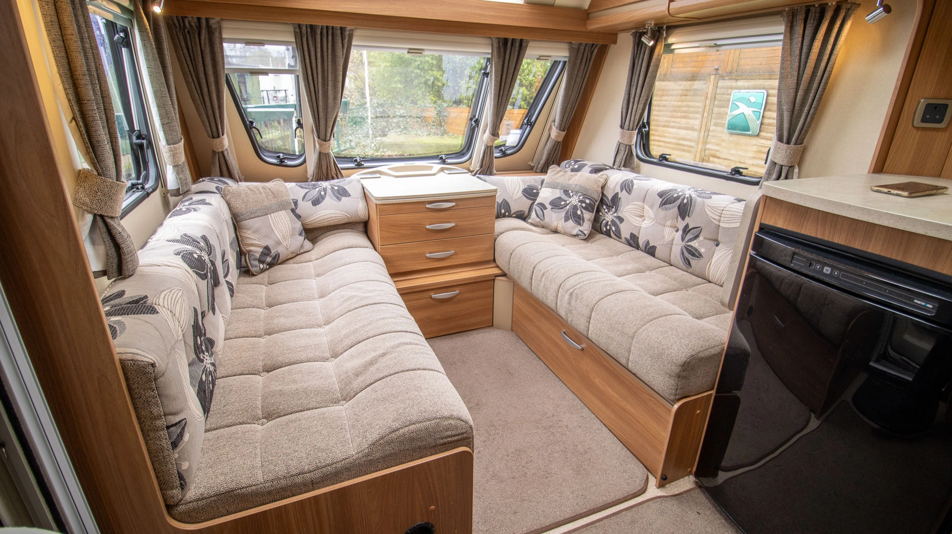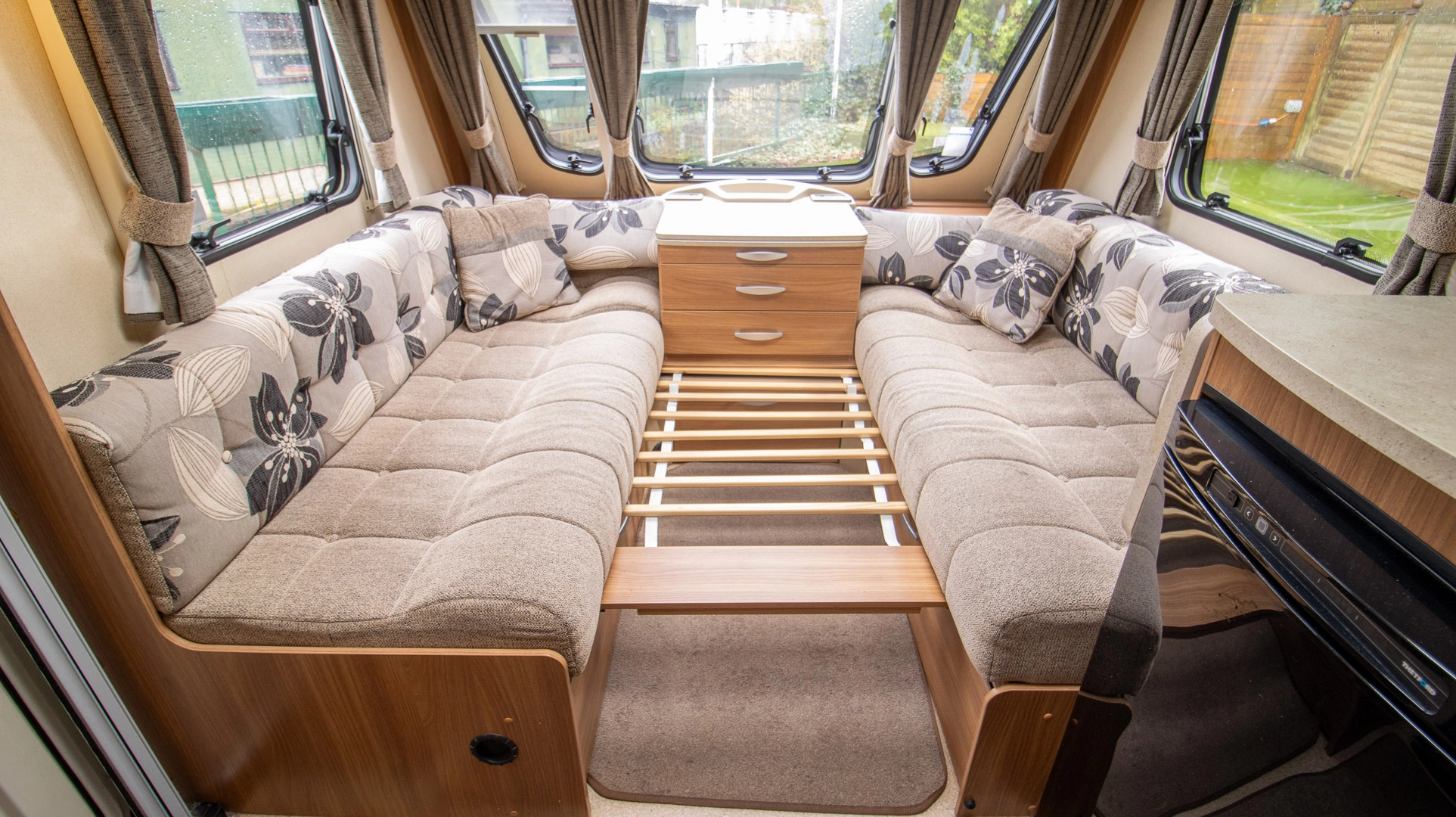 The front lounge features twin sofas that create a bright, sociable living area during the day, and can convert into a comfortable double bed at night.