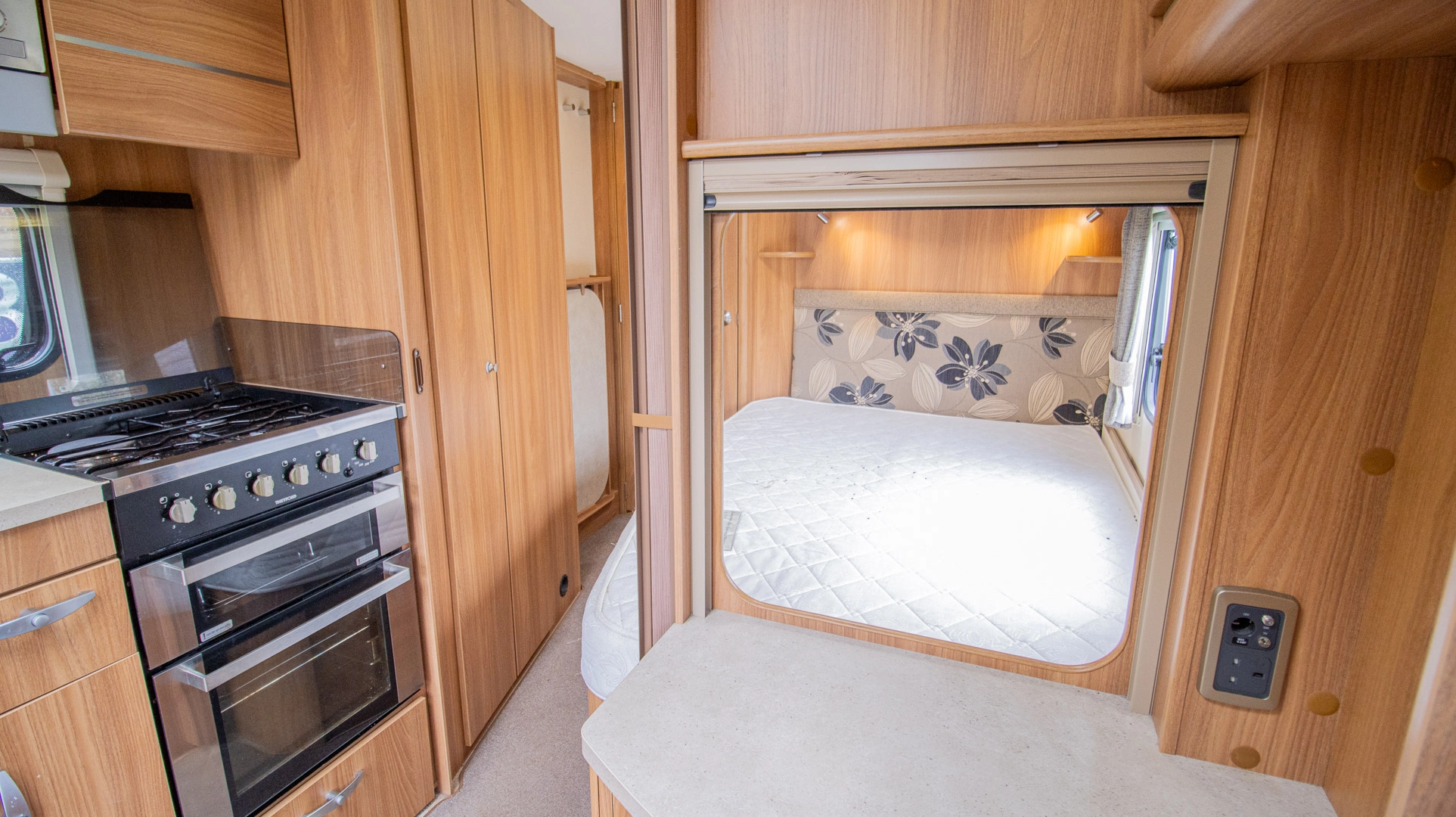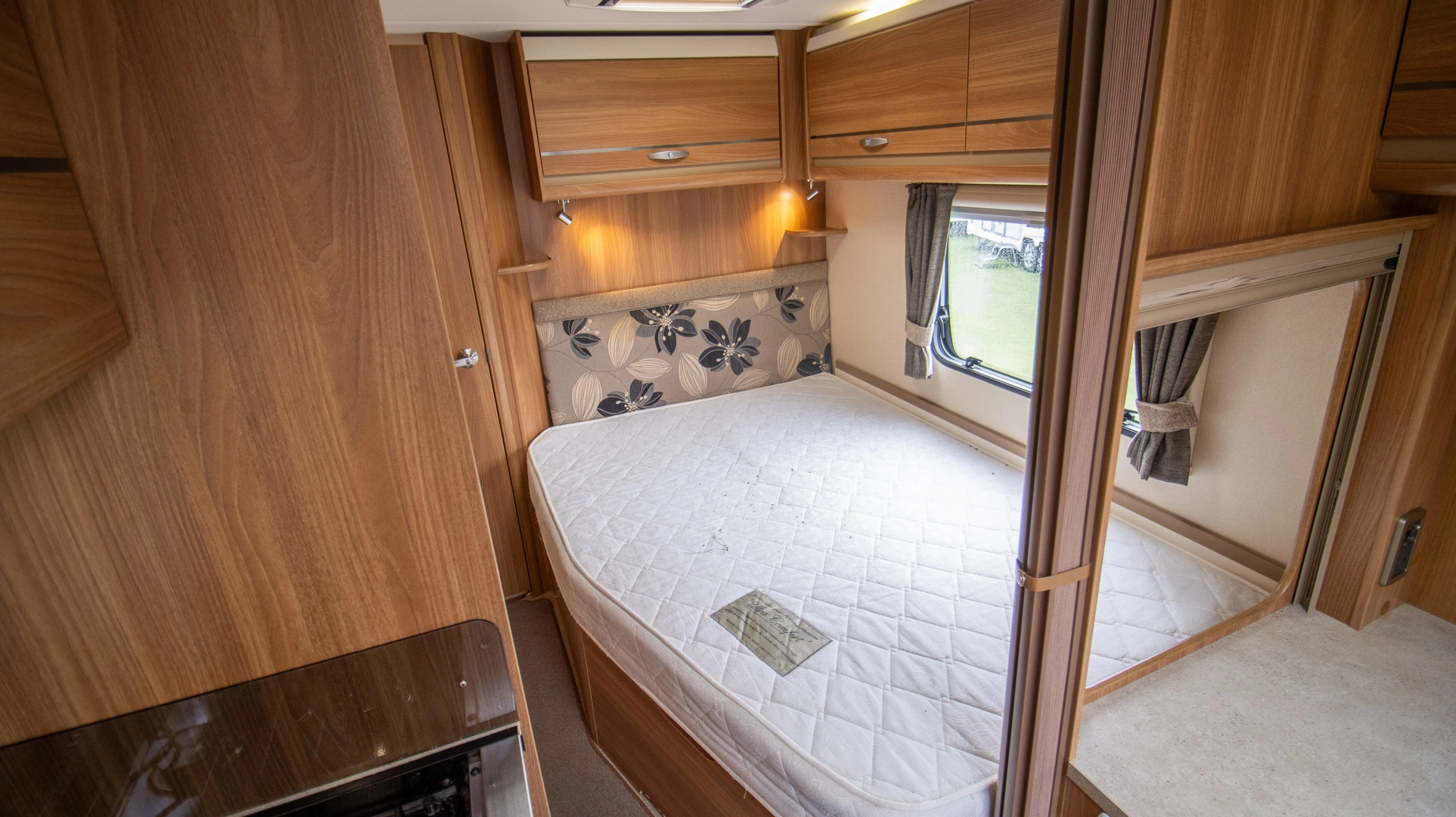 The fixed French bed provides a dedicated sleeping zone with generous under‑bed storage, requiring no nightly bed-making after a long day of holidaying.
