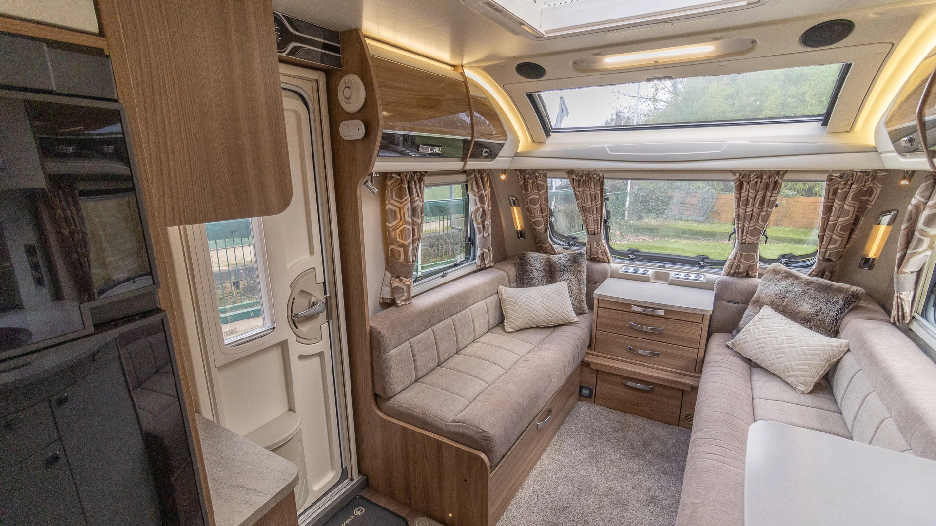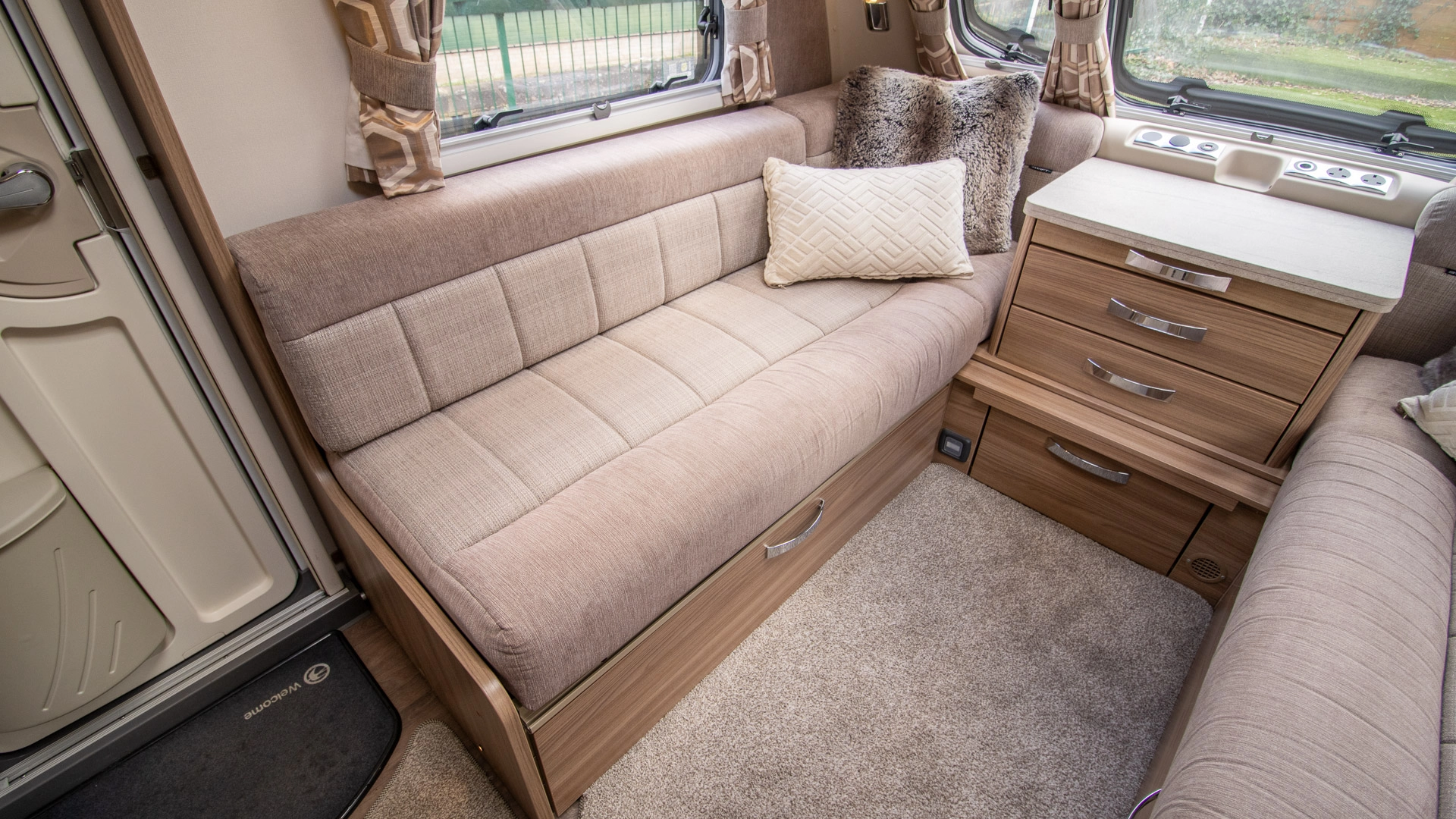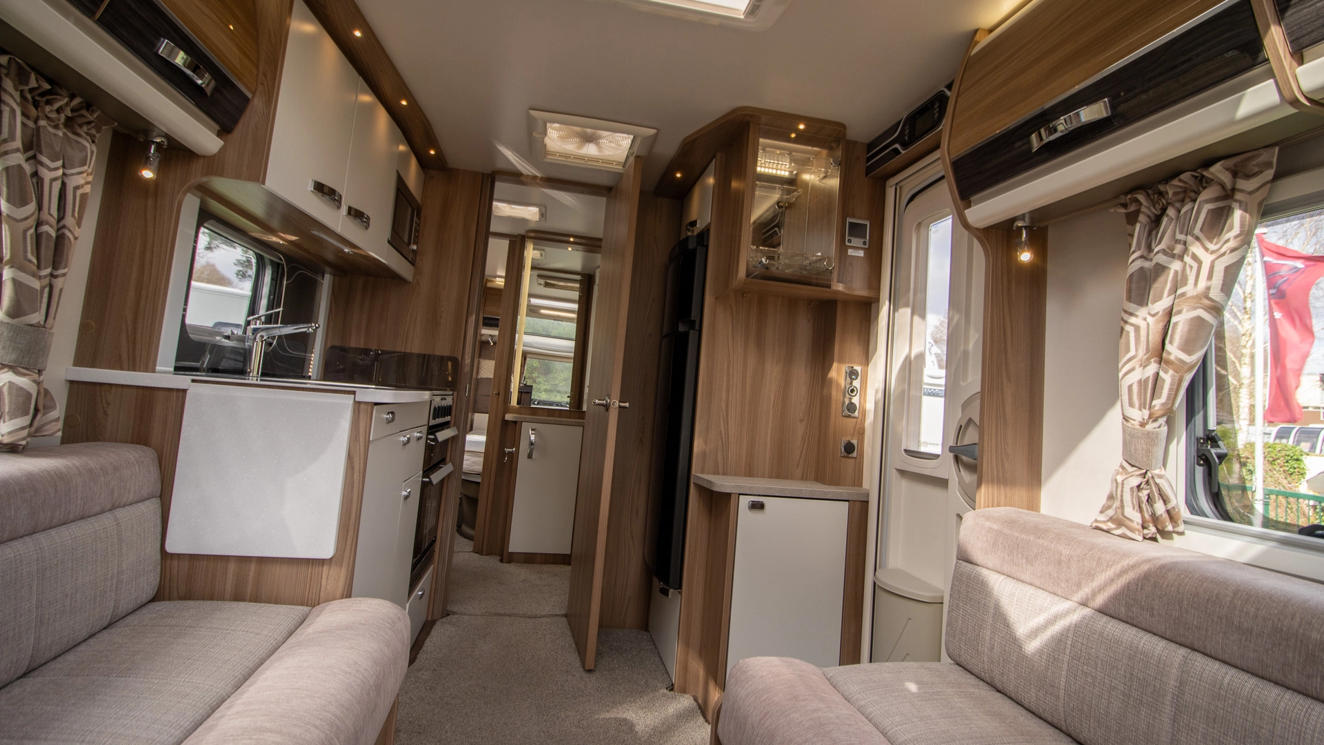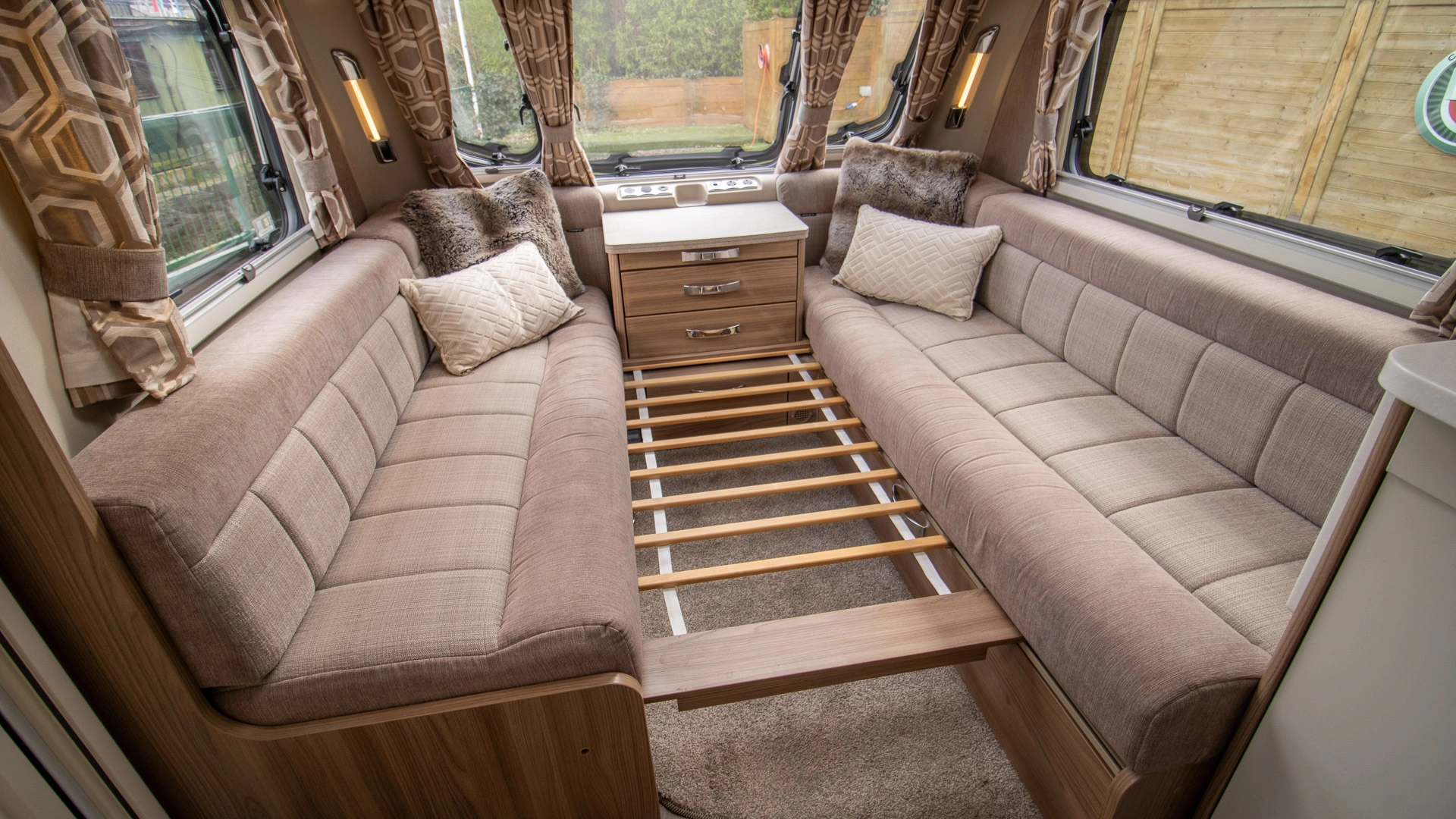 Parallel Seating Bed The front lounge features twin sofas that create a bright, sociable living area during the day, and can convert into a comfortable double bed at night