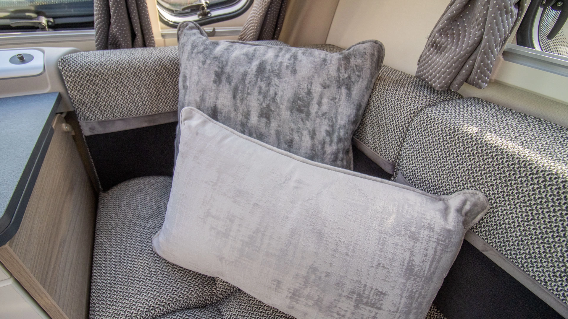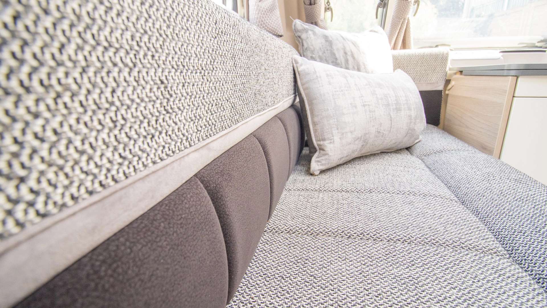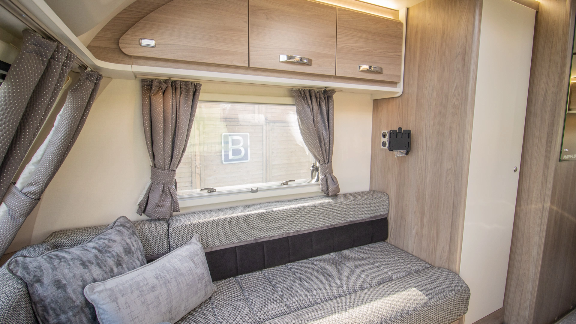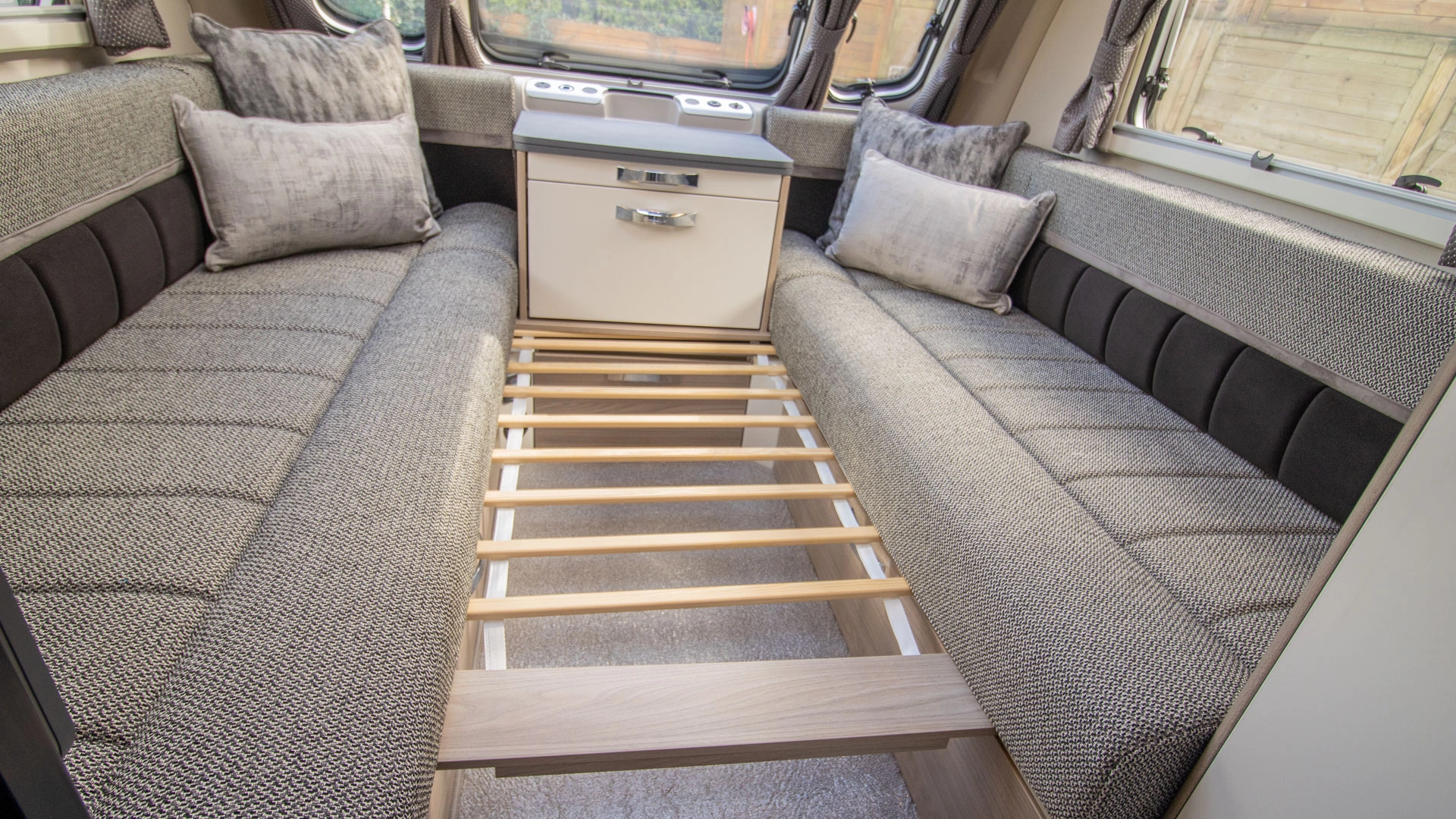 The front lounge features twin sofas that create a bright, sociable living area during the day, and can convert into a comfortable double bed at night.