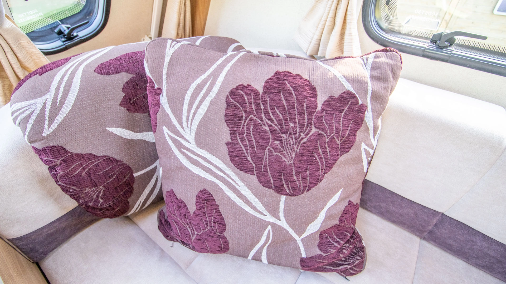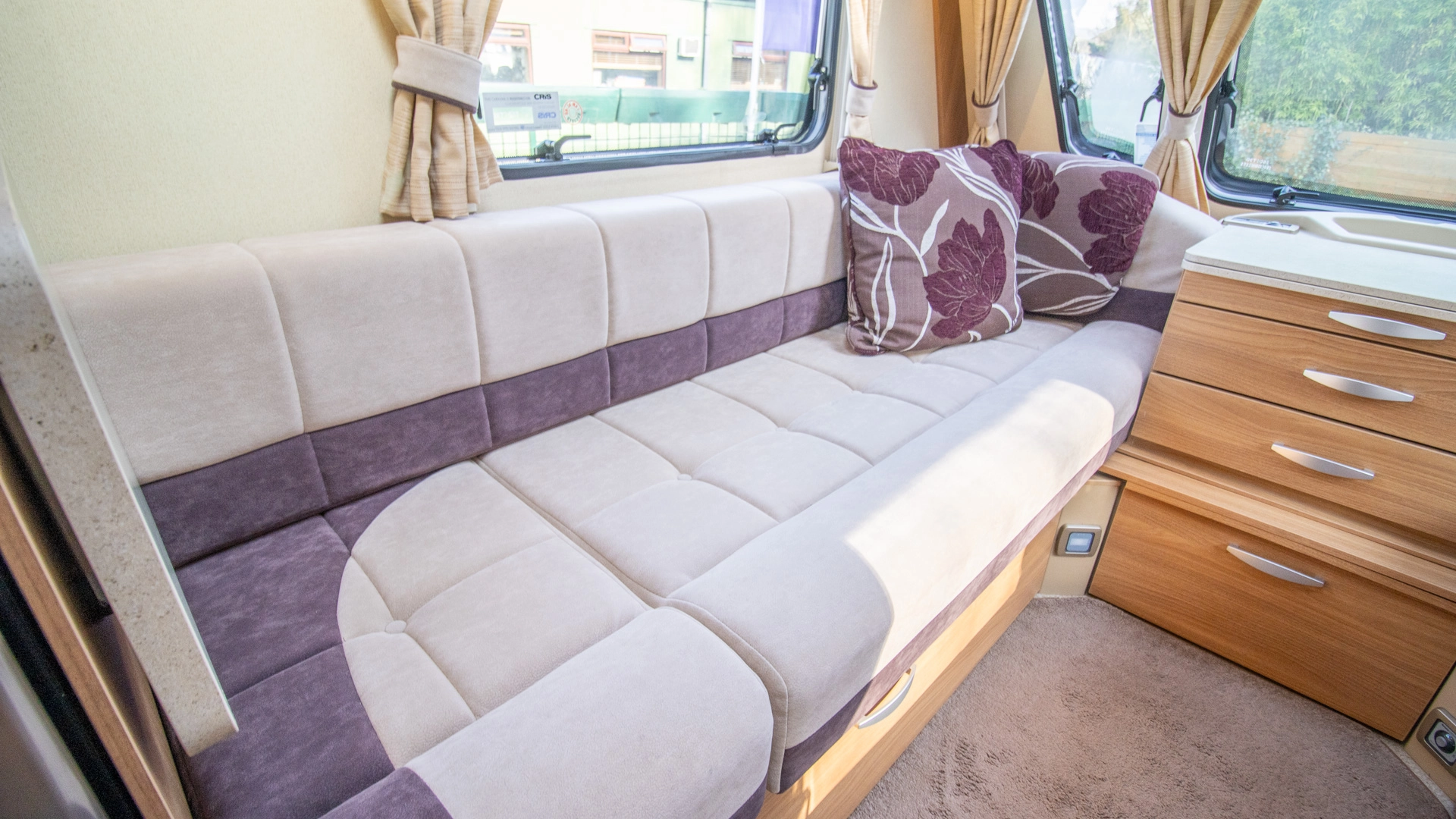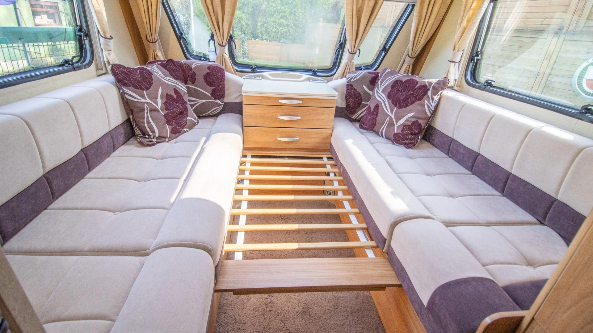The front lounge features twin sofas that create a bright, sociable living area during the day, and can convert into a comfortable double bed at night.