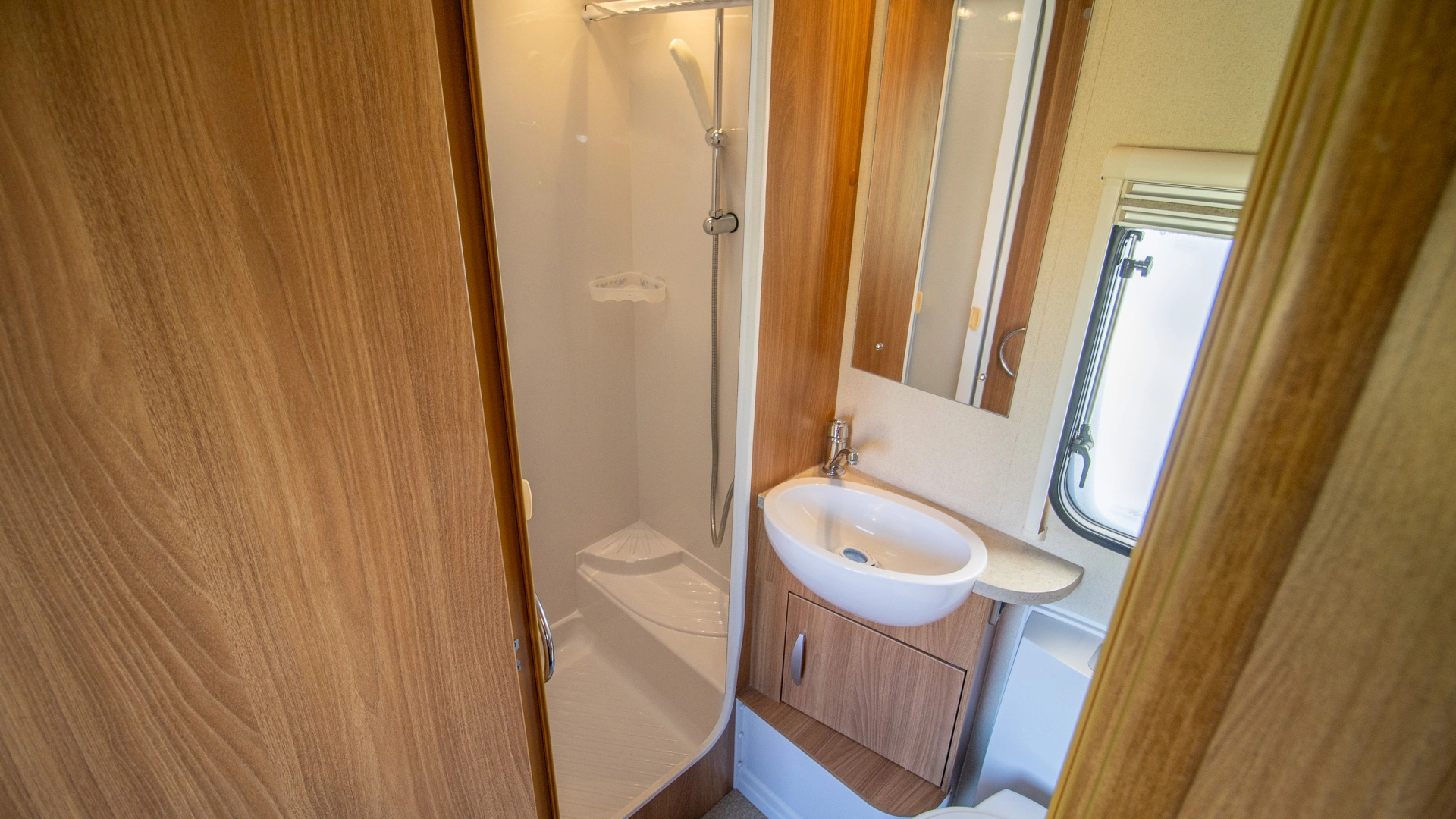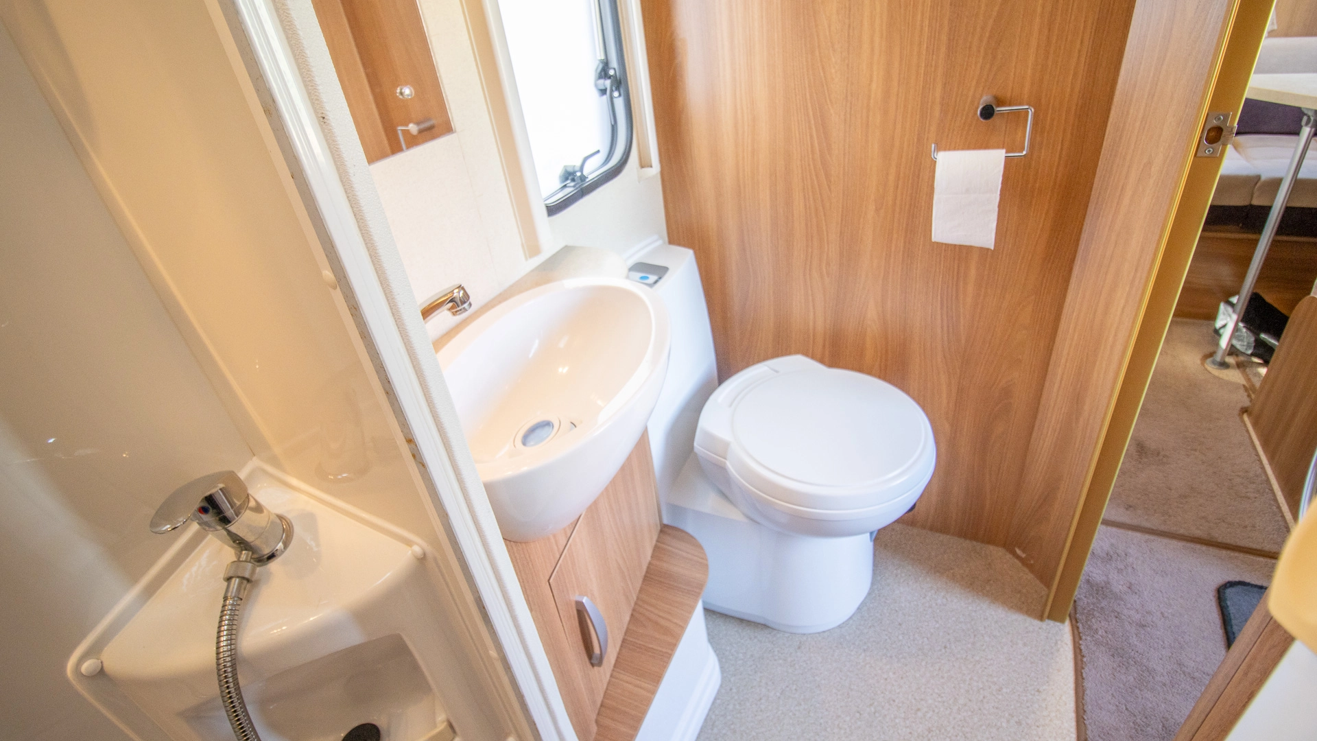 The centre washroom features a dedicated shower, toilet and basin while separating the living and sleeping areas, offering both convenience and privacy.