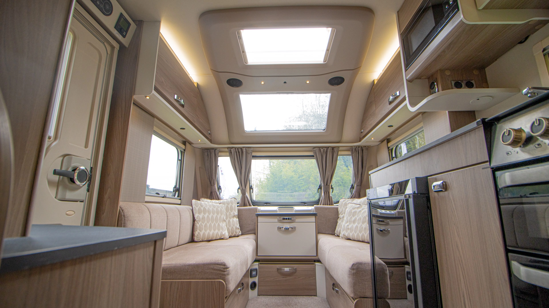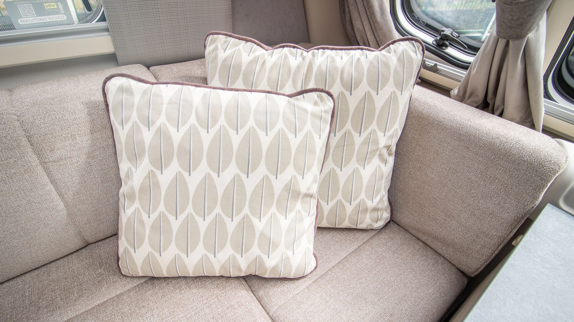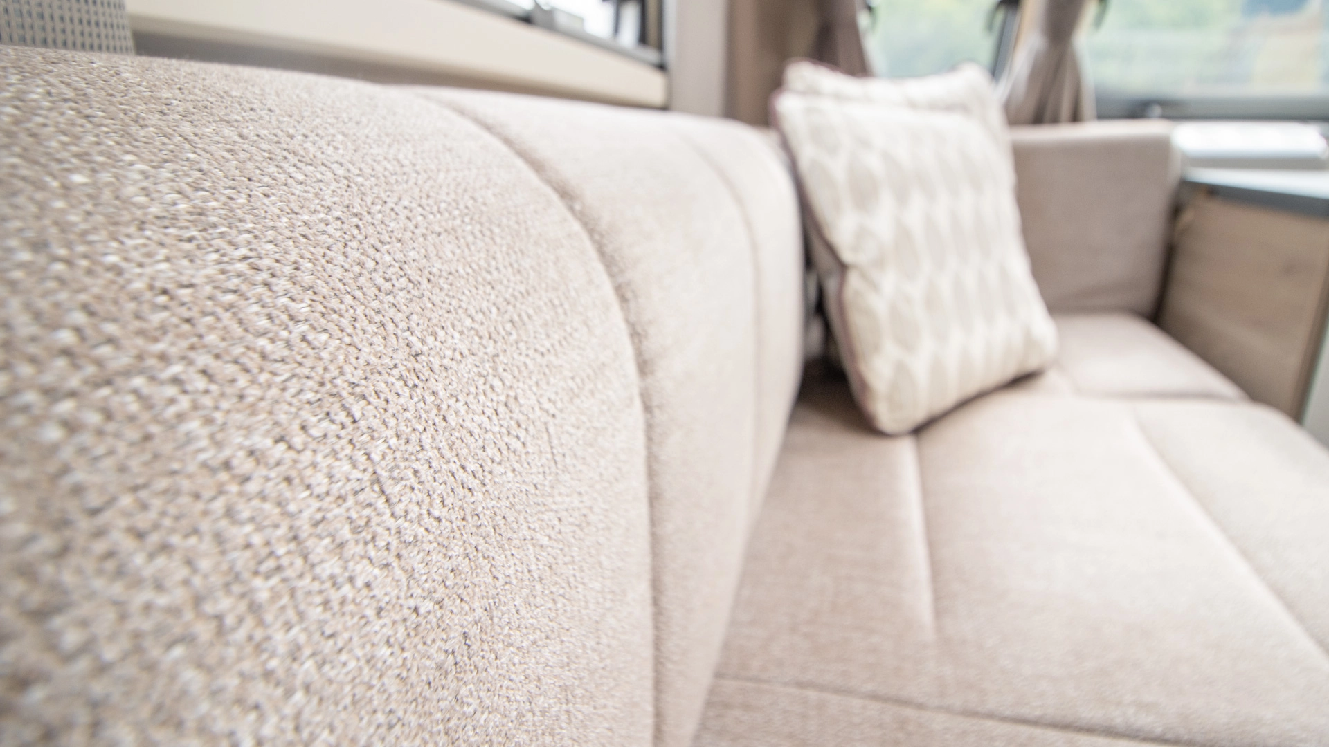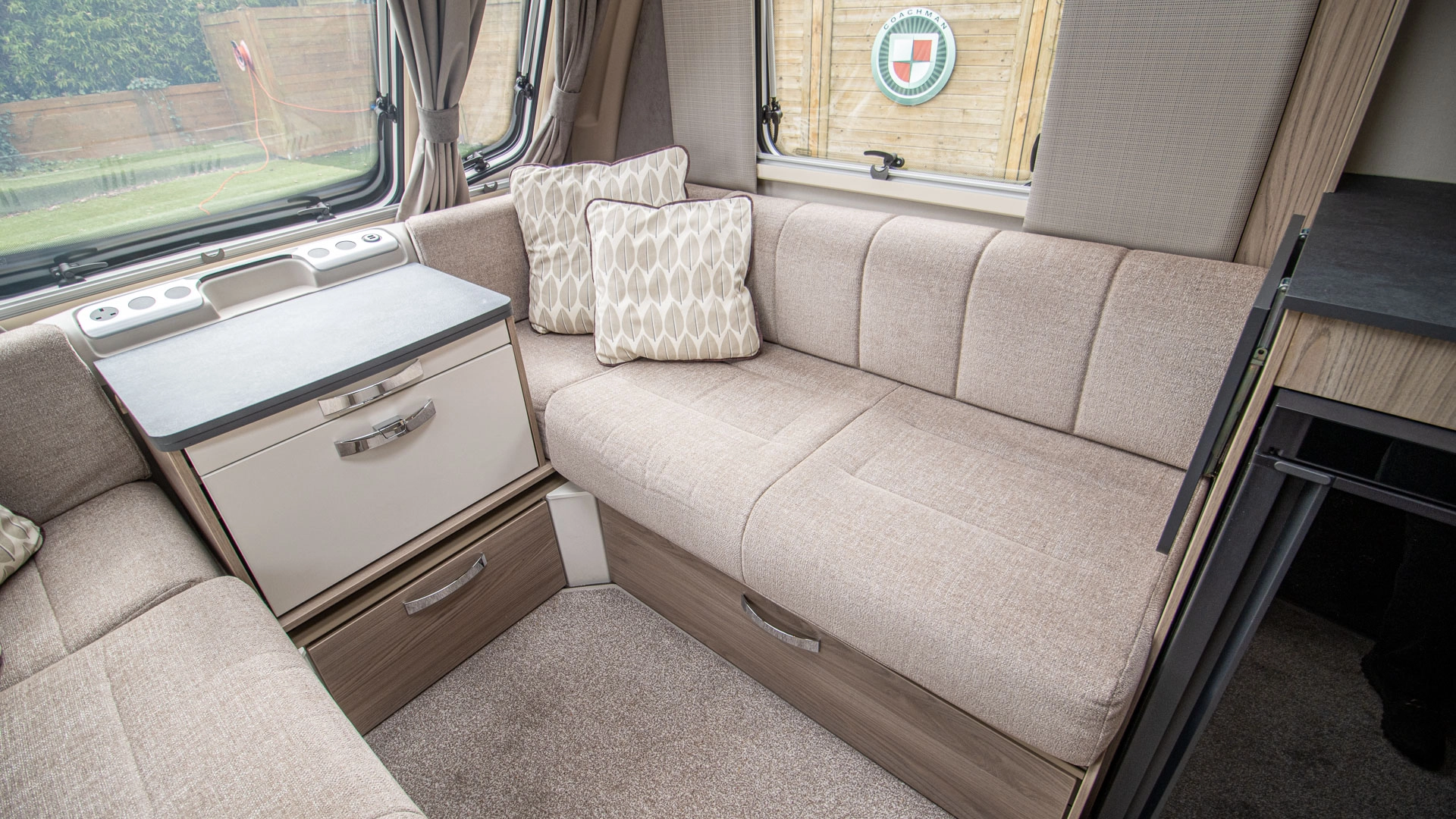The front lounge features twin sofas that create a bright, sociable living area during the day, and can convert into a comfortable double bed at night.