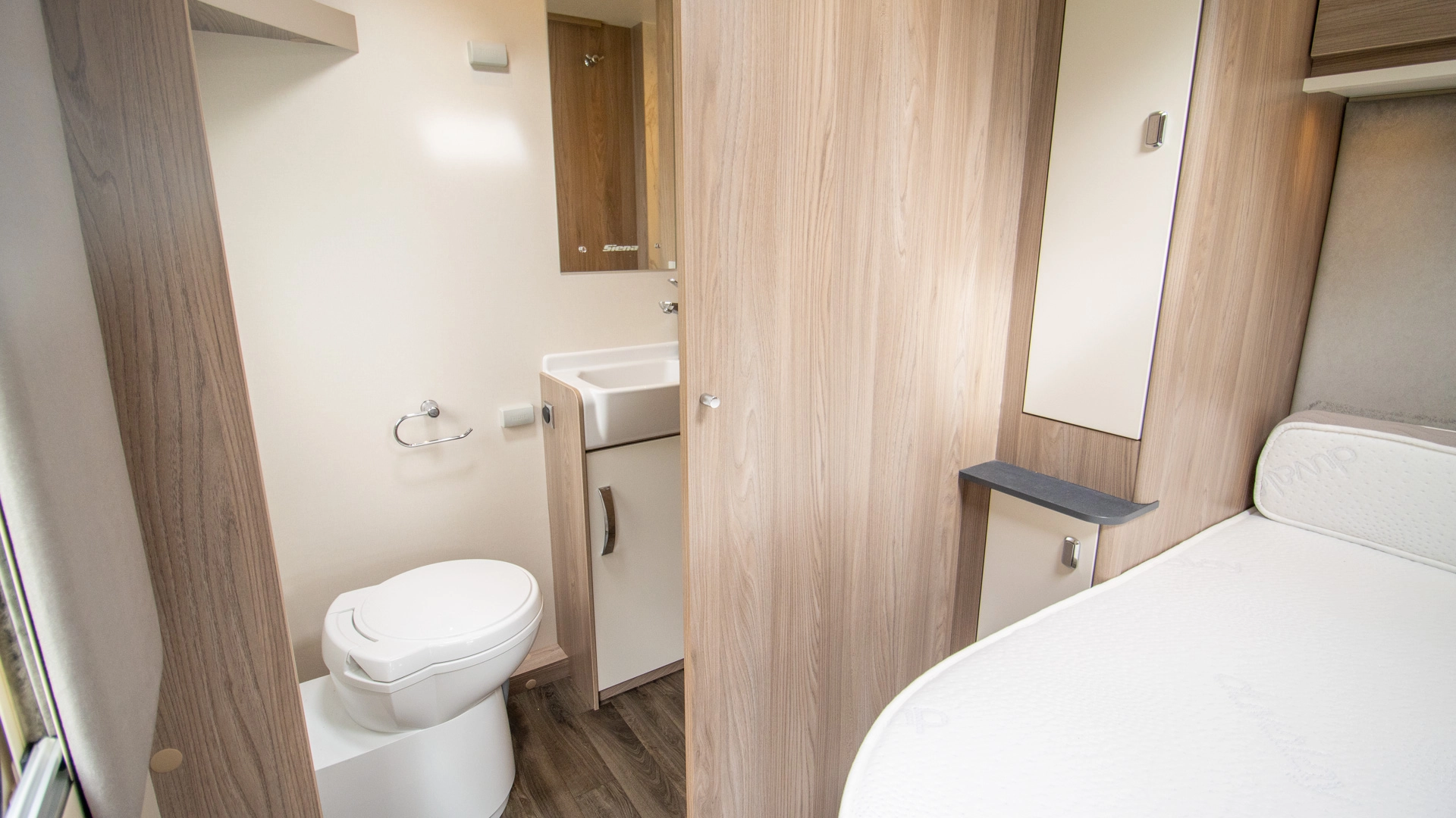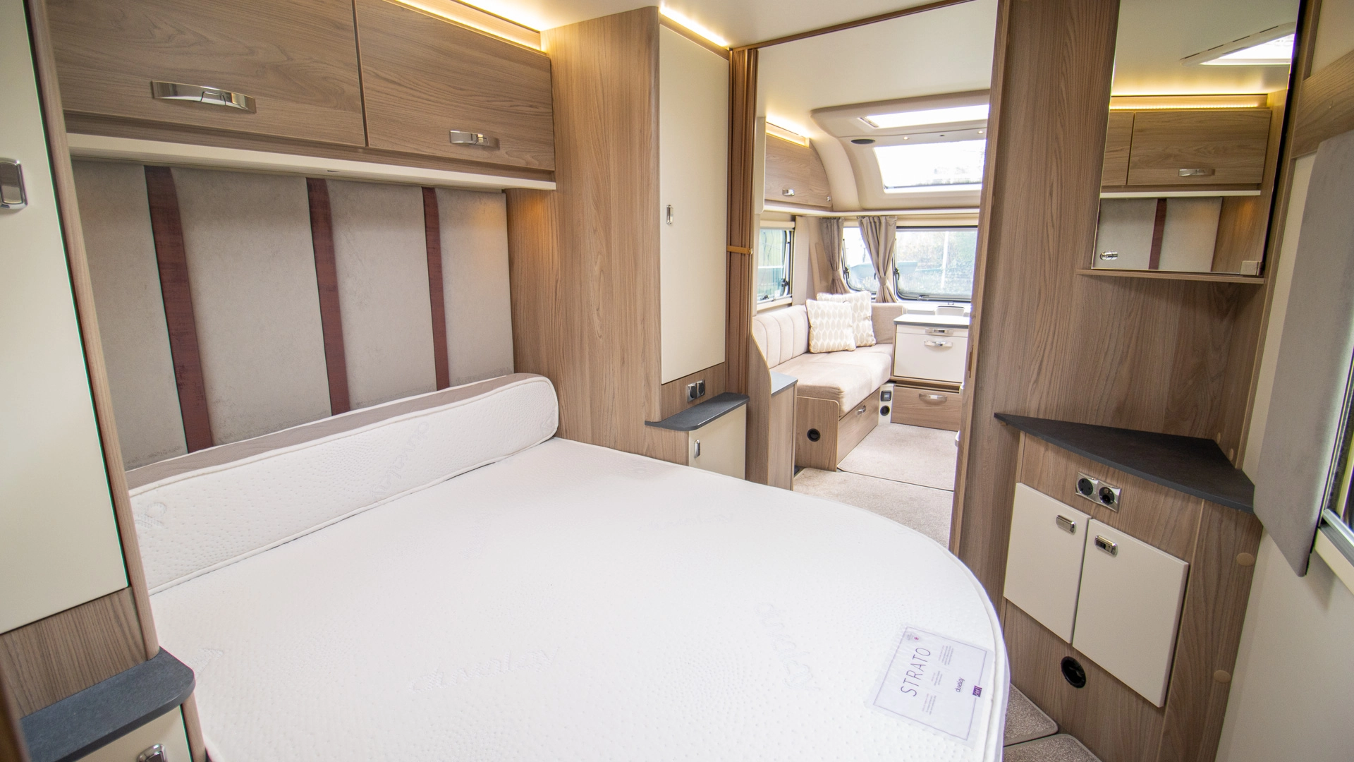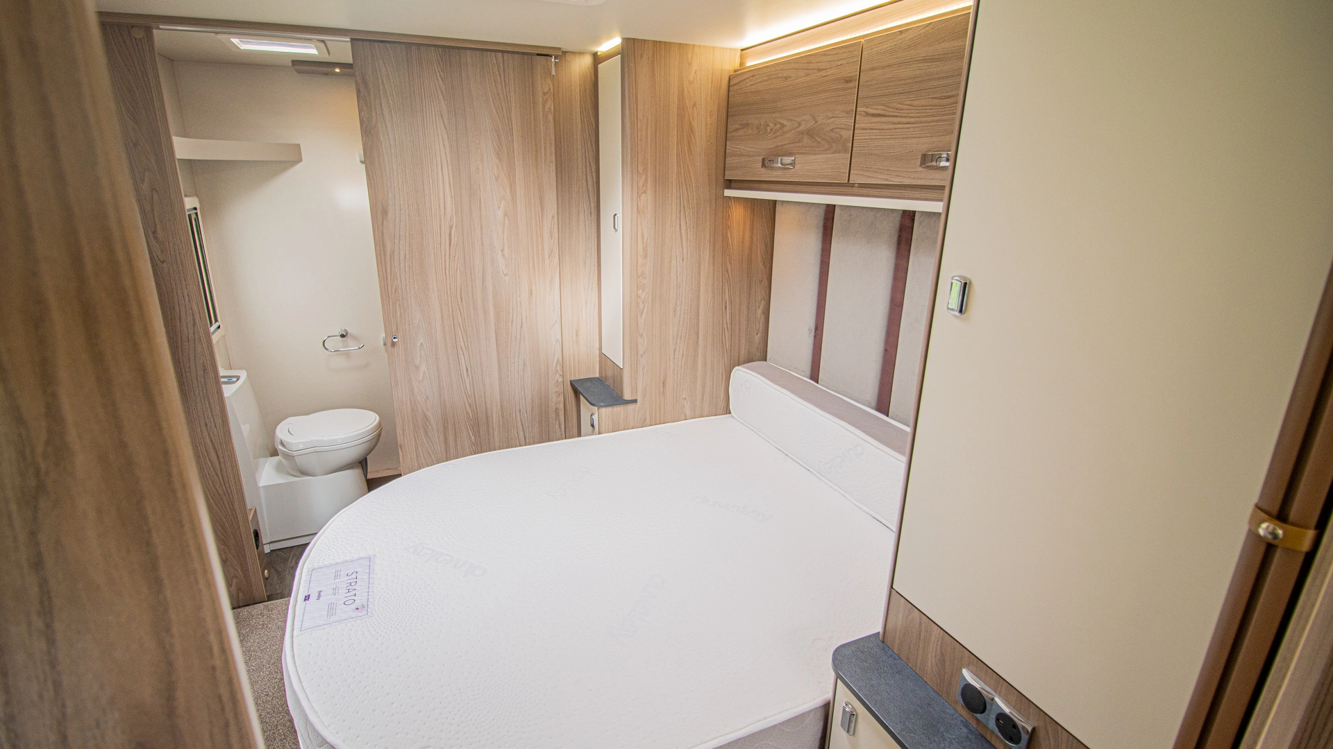 Requiring no nightly bed making, the fixed island bed provides a dedicated sleeping zone with walk‑around access and generous under‑bed storage.