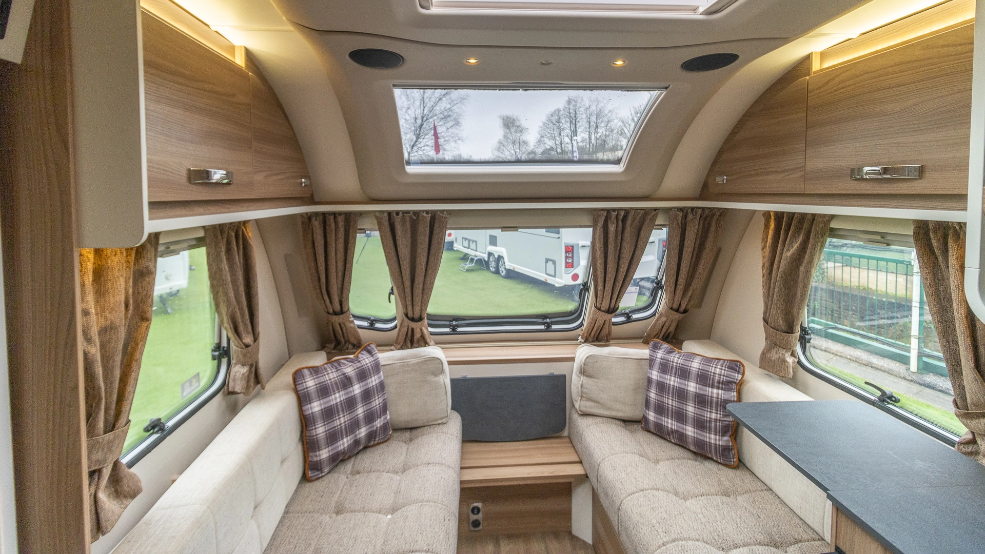 The front lounge features twin sofas that create a bright, sociable living area during the day, and can convert into a comfortable double bed at night.